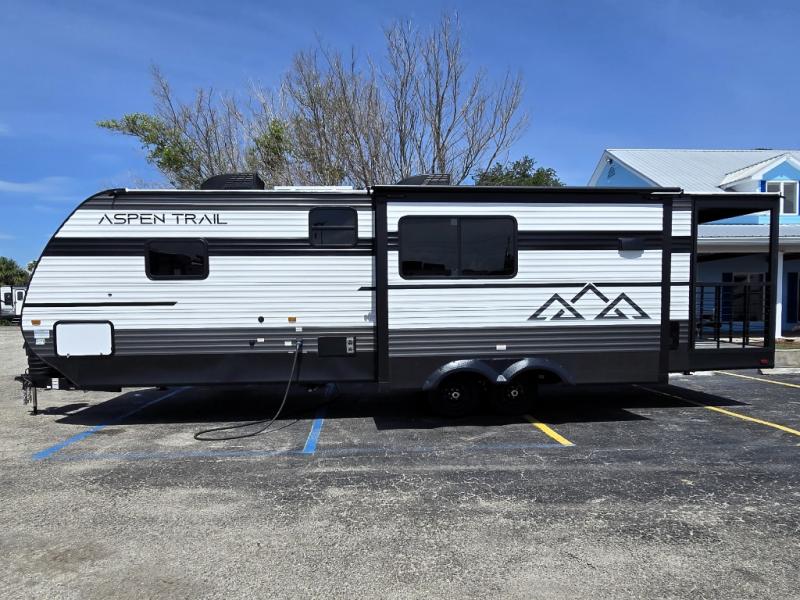 You will find more standard features and more value in each one of these Dutchmen RV Aspen Trail travel trailers! There is a smooth metal front end, diamond plate rock guard, backup camera prep, plus many more exterior features. Experience all of the power with power stabilizers, a power awning, and a power tongue jack for easy setting up and breaking down. The heated and enclosed underbelly provides an extra layer of protection for your unit's vitals so you can camp further into the year. With aluminum steps at the main entry, you will have a solid platform of stability as you enter and exit, plus they are easy to expand or store away. Inside, you'll love the look of the Home Series interior design collection and designer upholstered window valances, plus there is upgraded residential flooring that is easy to keep clean!