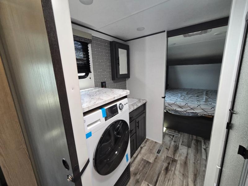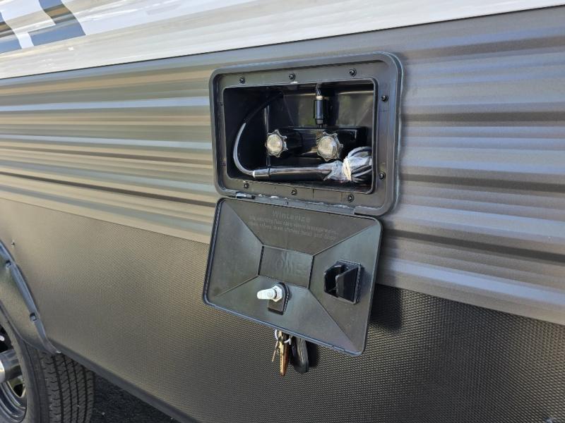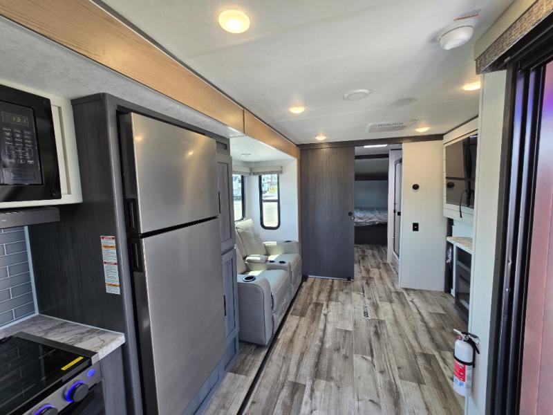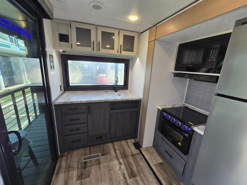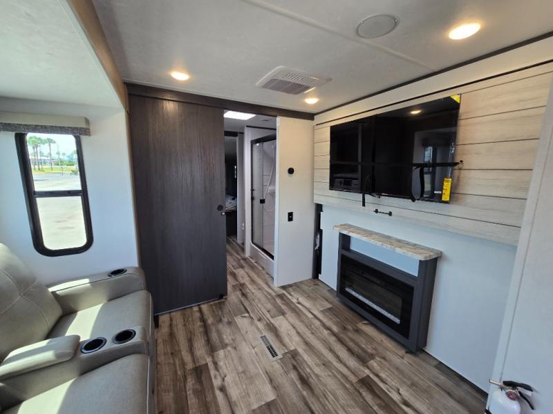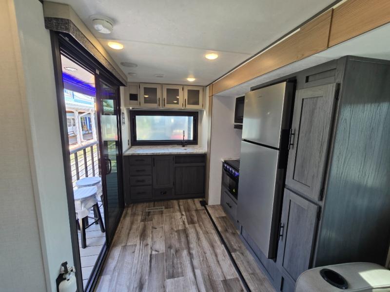 This unique travel trailer is one to remember! The rear wrap-around porch features ample space to entertain guests plus a peak-a-boo window with a fold-down bartop so those on the deck can visit with those inside. Once inside, you can relax on the theater seats with a flip top ottoman, and the fireplace will make this space more cozy. And check out the hidden Murphy bed behind the fireplace so guests can sleep over! A walk-thru bath is spacious so you can easily clean up each day, and the front master bedroom features a residential queen bed for all-around comfort.