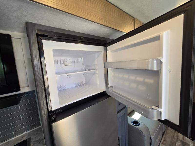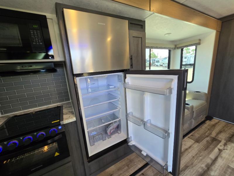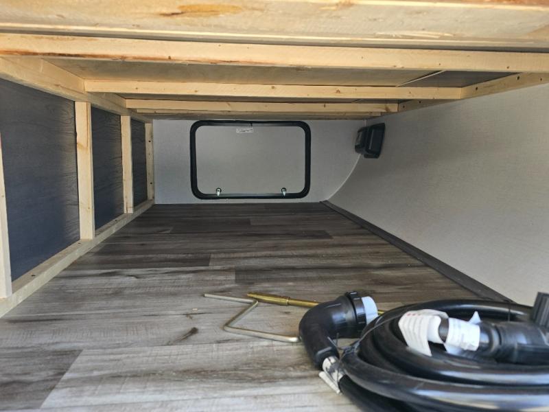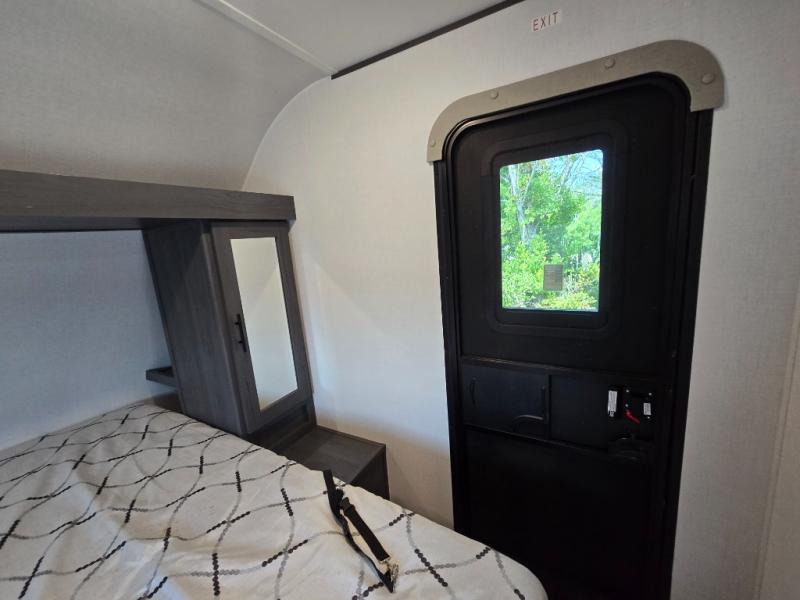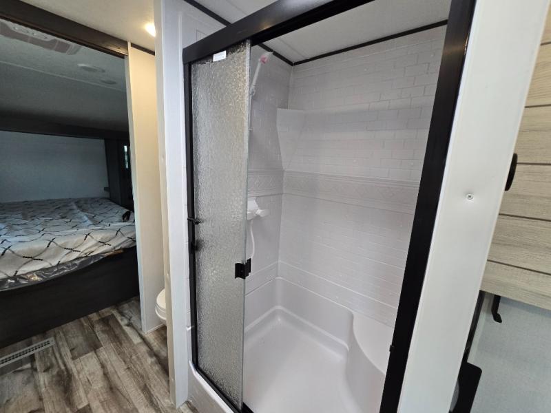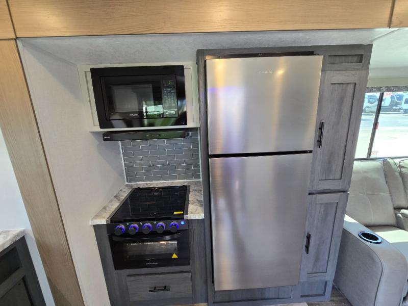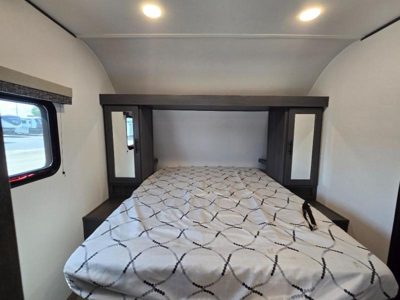 This unique travel trailer is one to remember! The rear wrap-around porch features ample space to entertain guests plus a peak-a-boo window with a fold-down bartop so those on the deck can visit with those inside. Once inside, you can relax on the theater seats with a flip top ottoman, and the fireplace will make this space more cozy. And check out the hidden Murphy bed behind the fireplace so guests can sleep over! A walk-thru bath is spacious so you can easily clean up each day, and the front master bedroom features a residential queen bed for all-around comfort.