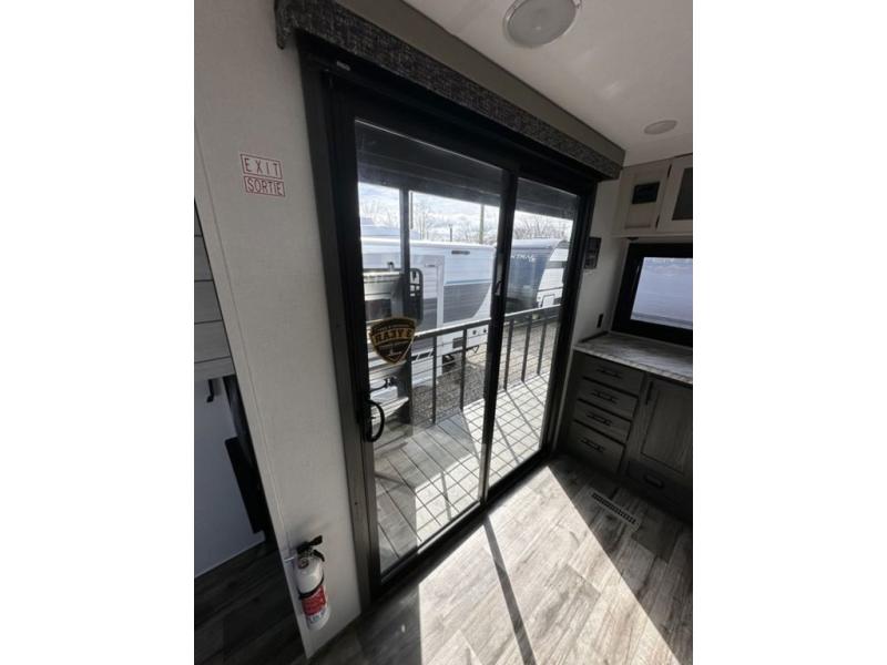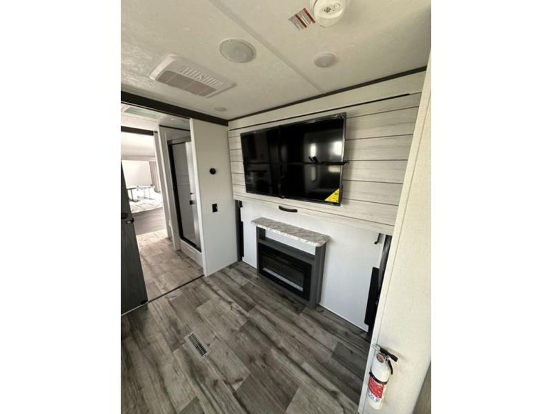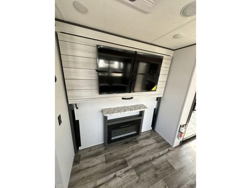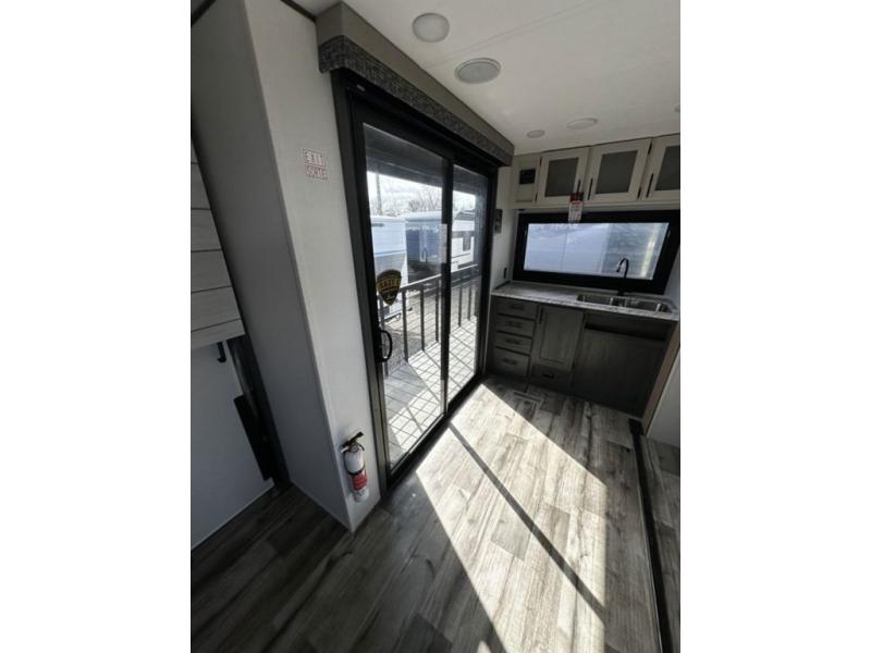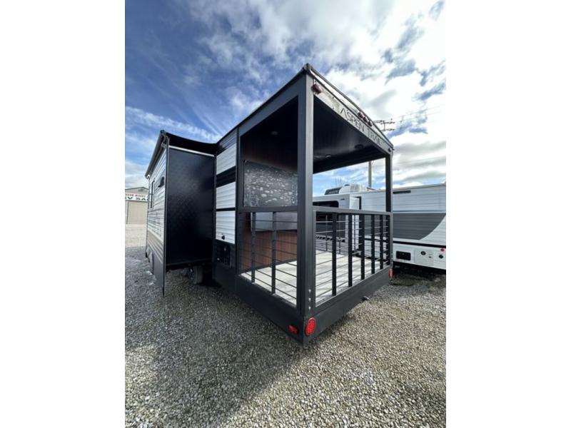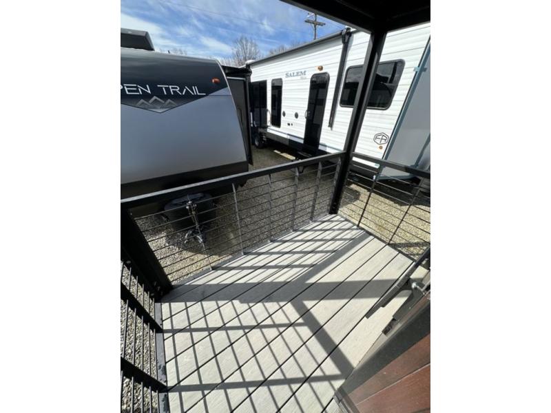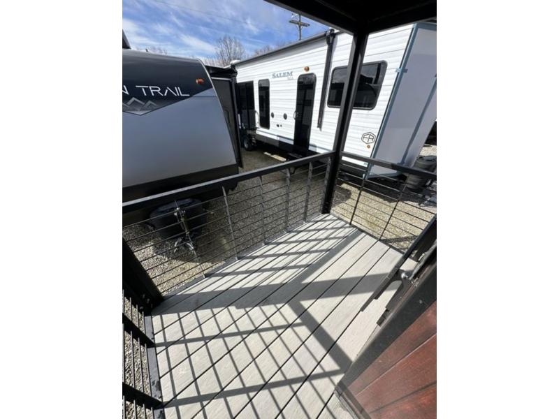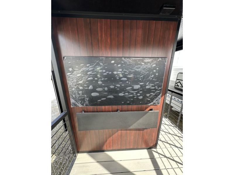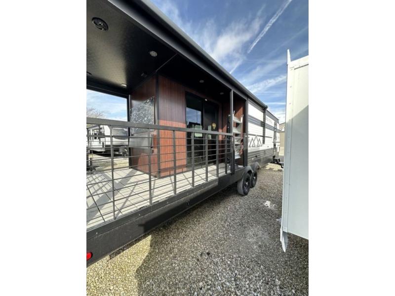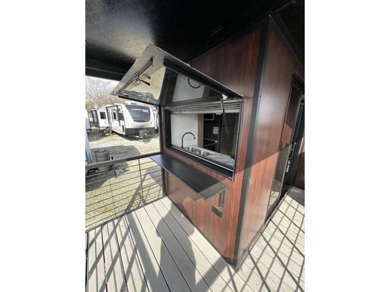 This unique travel trailer is one to remember! The rear wrap-around porch features ample space to entertain guests plus a peak-a-boo window with a fold-down bartop so those on the deck can visit with those inside. Once inside, you can relax on the theater seats with a flip top ottoman, and the fireplace will make this space more cozy. And check out the hidden Murphy bed behind the fireplace so guests can sleep over! A walk-thru bath is spacious so you can easily clean up each day, and the front master bedroom features a residential queen bed for all-around comfort.