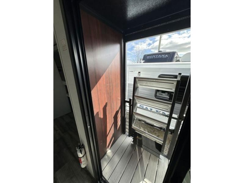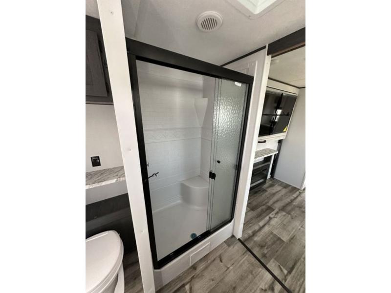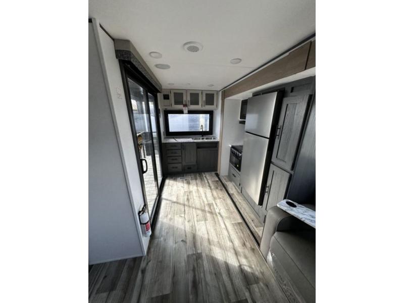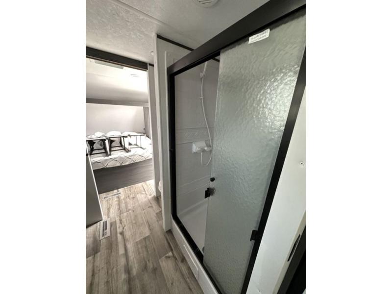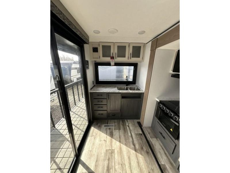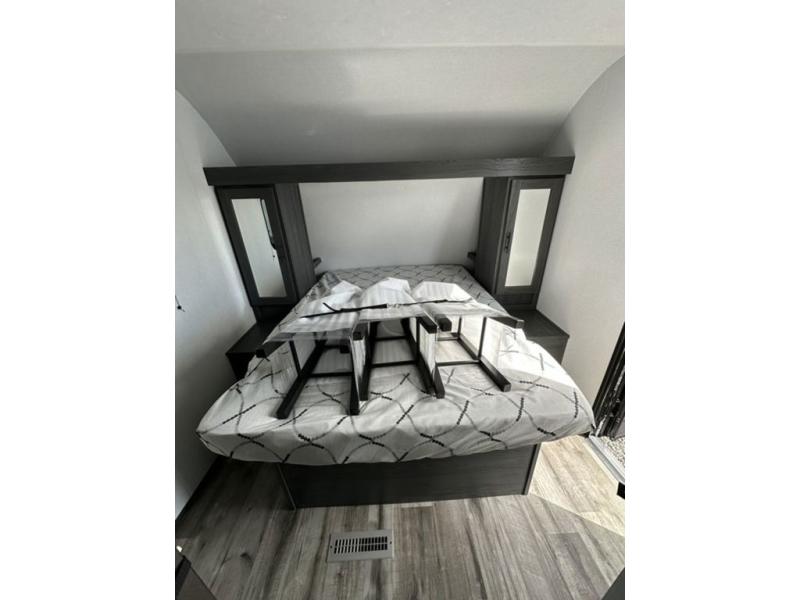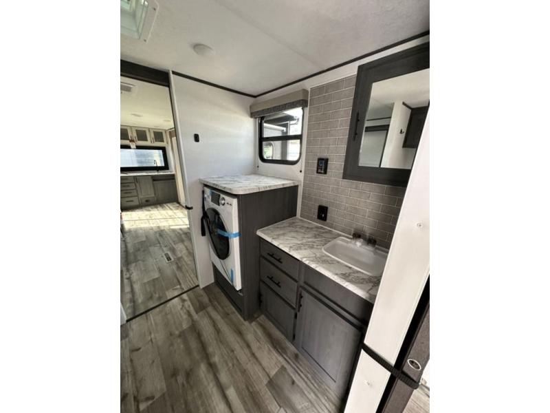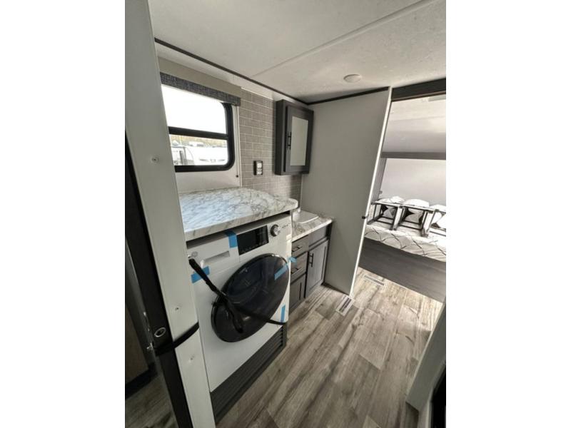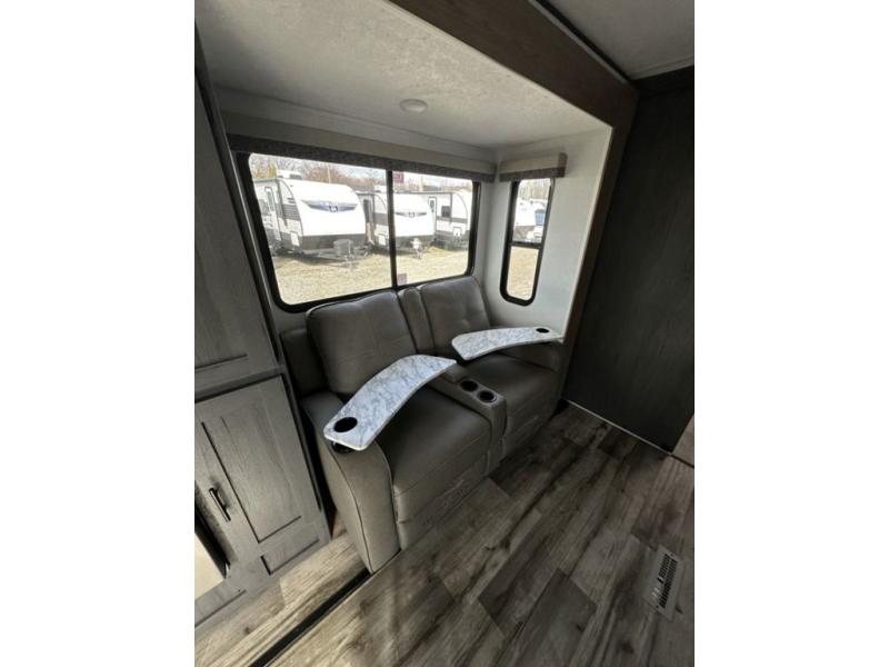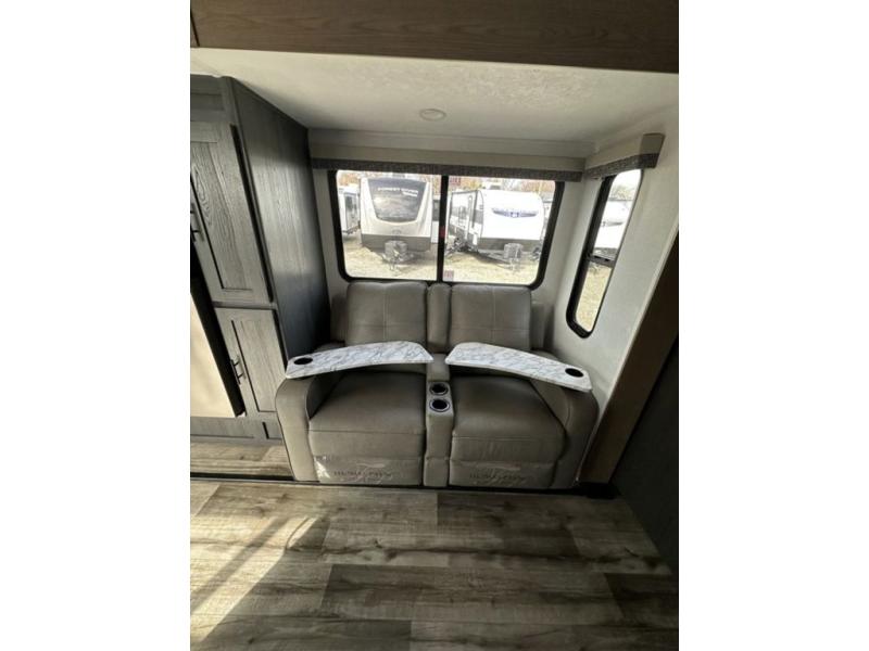 This unique travel trailer is one to remember! The rear wrap-around porch features ample space to entertain guests plus a peak-a-boo window with a fold-down bartop so those on the deck can visit with those inside. Once inside, you can relax on the theater seats with a flip top ottoman, and the fireplace will make this space more cozy. And check out the hidden Murphy bed behind the fireplace so guests can sleep over! A walk-thru bath is spacious so you can easily clean up each day, and the front master bedroom features a residential queen bed for all-around comfort.