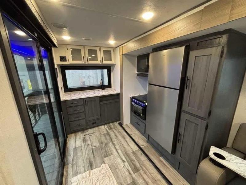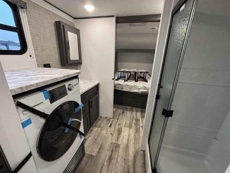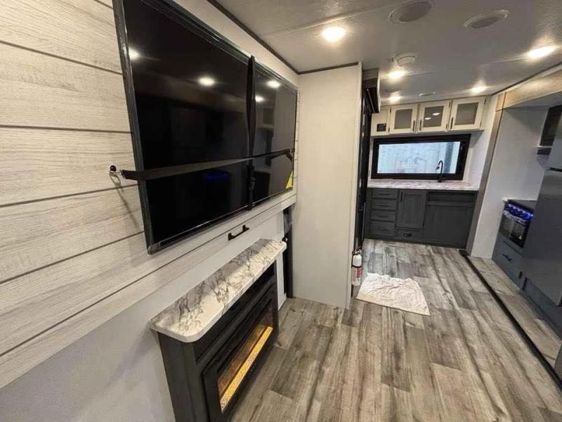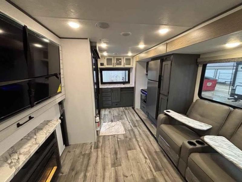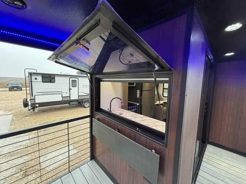 This unique travel trailer is one to remember! The rear wrap-around porch features ample space to entertain guests plus a peak-a-boo window with a fold-down bartop so those on the deck can visit with those inside. Once inside, you can relax on the theater seats with a flip top ottoman, and the fireplace will make this space more cozy. And check out the hidden Murphy bed behind the fireplace so guests can sleep over! A walk-thru bath is spacious so you can easily clean up each day, and the front master bedroom features a residential queen bed for all-around comfort.