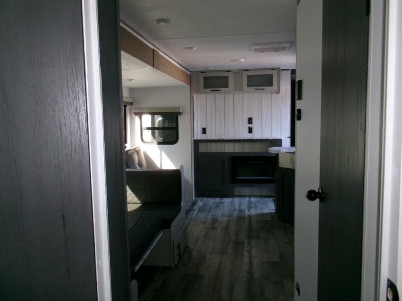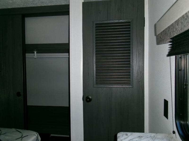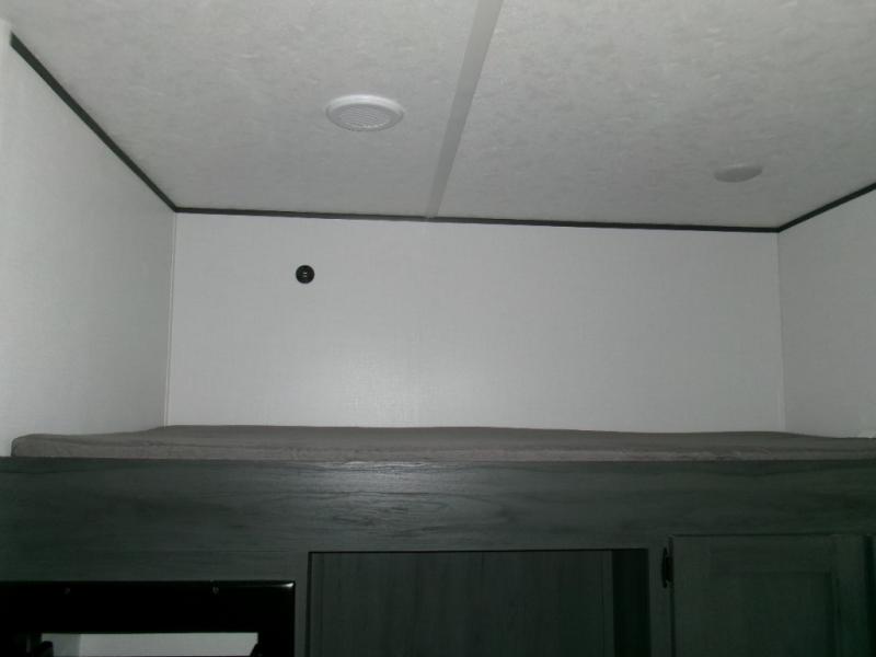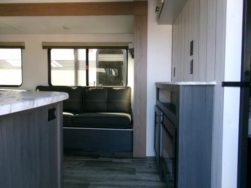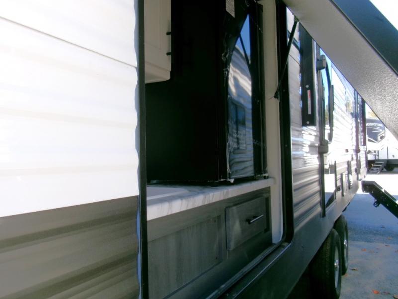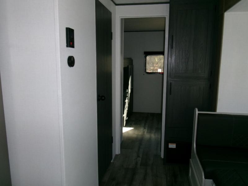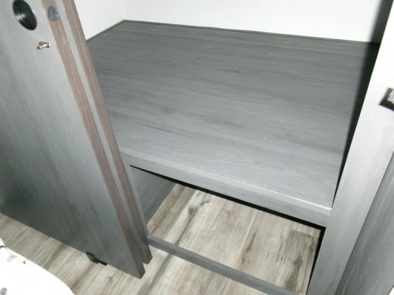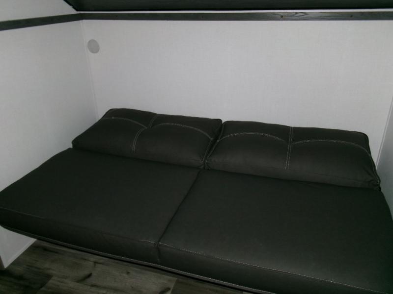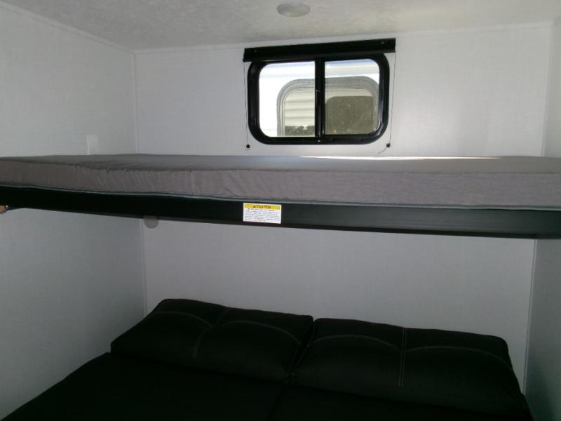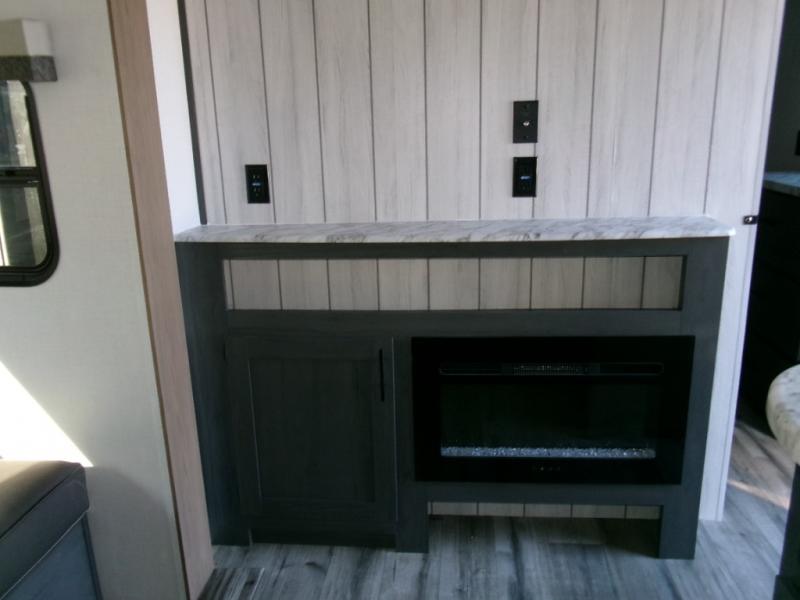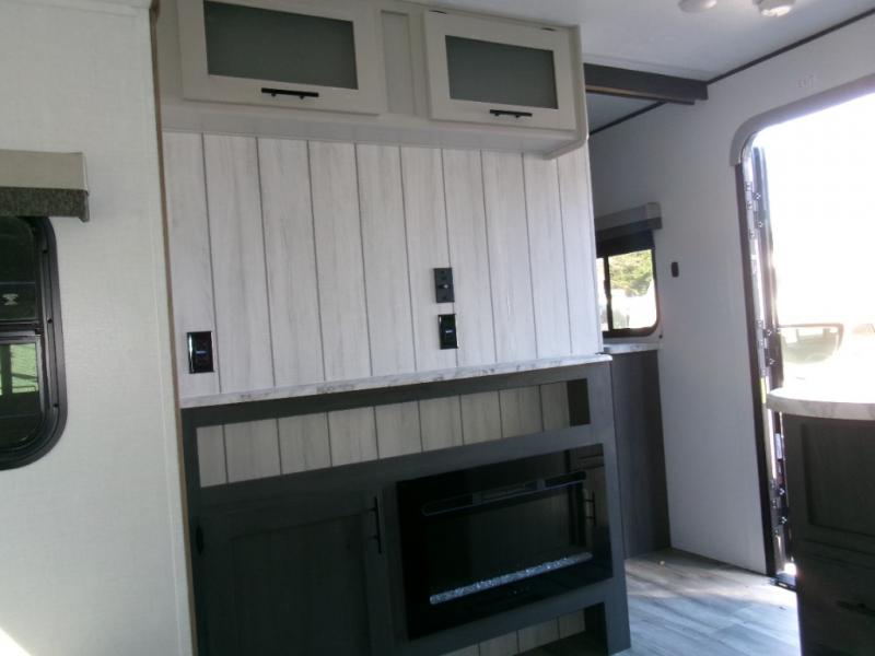 This is a travel trailer the whole family will love! There is a rear private bunkhouse with triple bunks plus a slide out for more space. The front private bedroom with a residential queen bed slide out will let you enjoy your own space each night, and the hanging closet in front will keep your clothes wrinkle free. There is even a closet with washer and dryer prep if you plan to add a washer and dryer! Everyone can meet in the main living area on the tri-fold sofa or around the convectional U-shaped dinette, and the fireplace here will make it feel more like home. This model also includes a full bath with its own exterior entry door; how convenient!