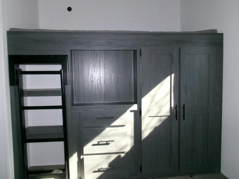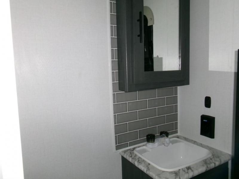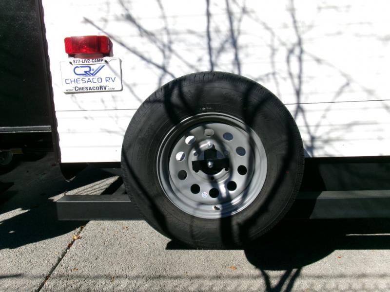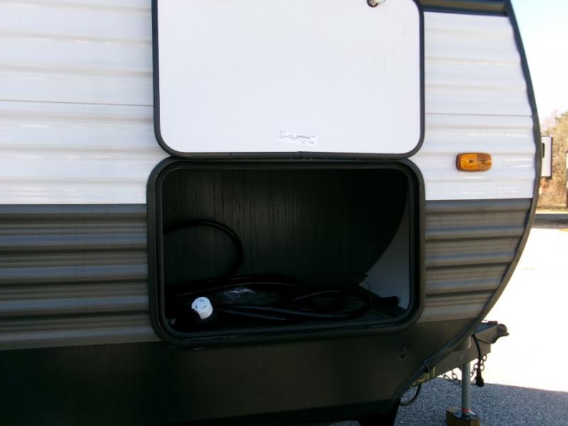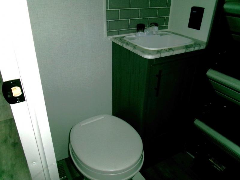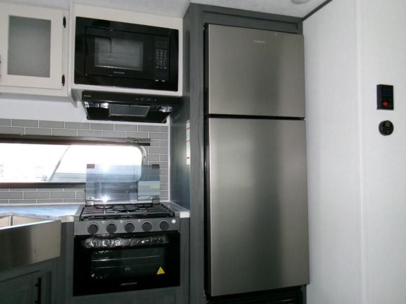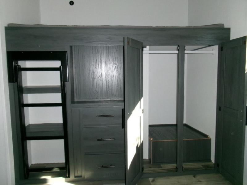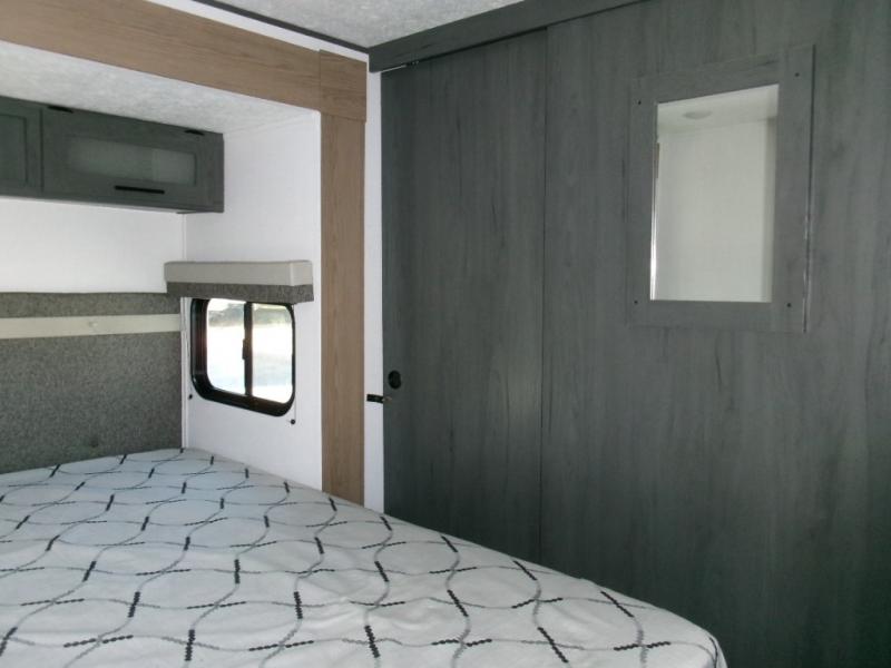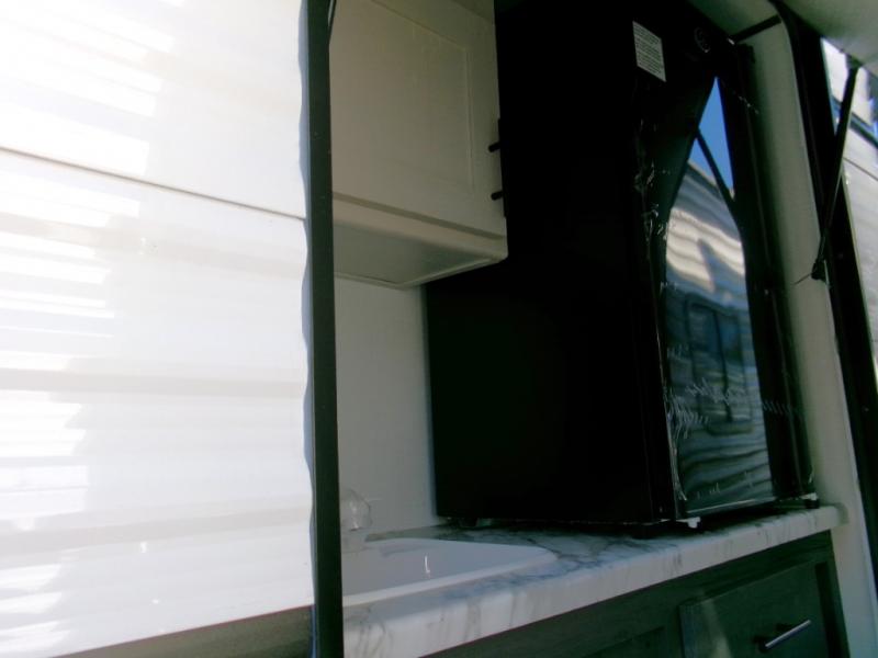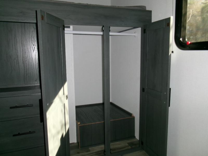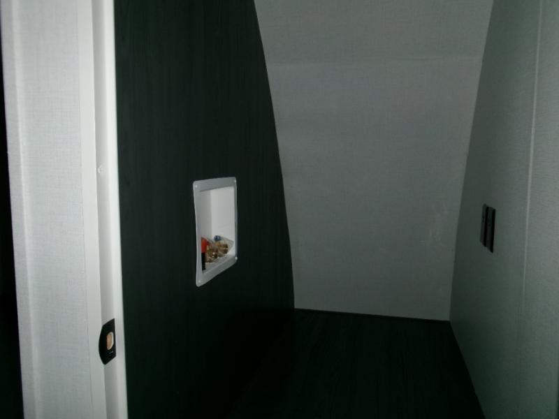 This is a travel trailer the whole family will love! There is a rear private bunkhouse with triple bunks plus a slide out for more space. The front private bedroom with a residential queen bed slide out will let you enjoy your own space each night, and the hanging closet in front will keep your clothes wrinkle free. There is even a closet with washer and dryer prep if you plan to add a washer and dryer! Everyone can meet in the main living area on the tri-fold sofa or around the convectional U-shaped dinette, and the fireplace here will make it feel more like home. This model also includes a full bath with its own exterior entry door; how convenient!