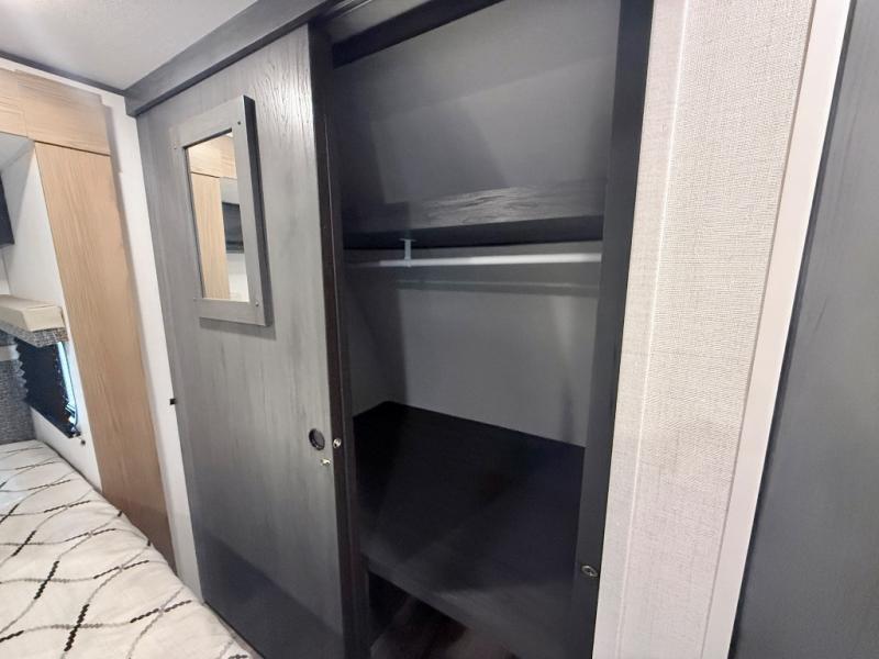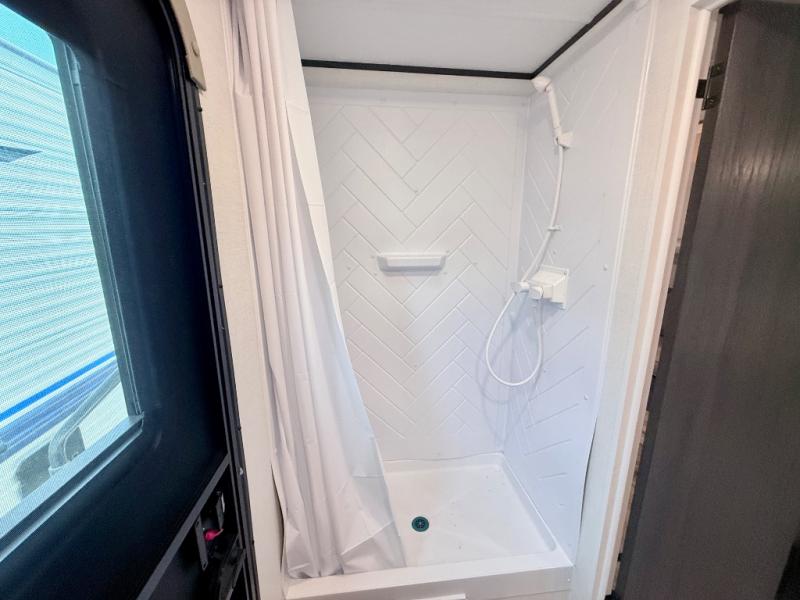 This is a travel trailer the whole family will love! There is a rear private bunkhouse with triple bunks plus a slide out for more space. The front private bedroom with a residential queen bed slide out will let you enjoy your own space each night, and the hanging closet in front will keep your clothes wrinkle free. There is even a closet with washer and dryer prep if you plan to add a washer and dryer! Everyone can meet in the main living area on the tri-fold sofa or around the convectional U-shaped dinette, and the fireplace here will make it feel more like home. This model also includes a full bath with its own exterior entry door; how convenient!