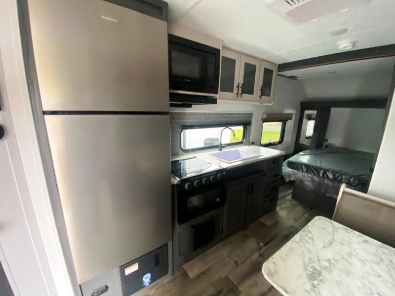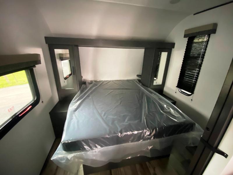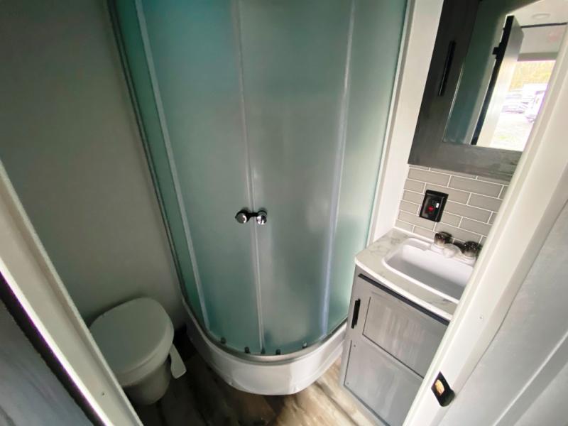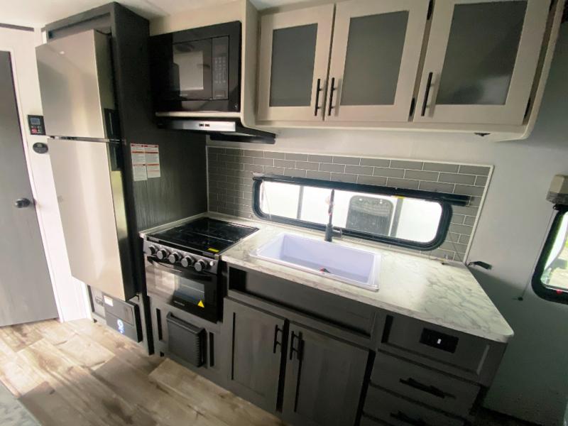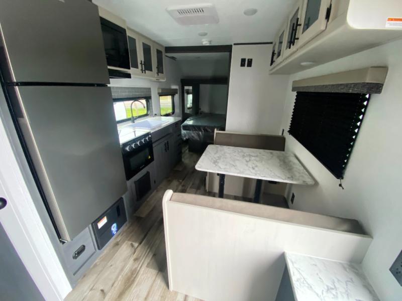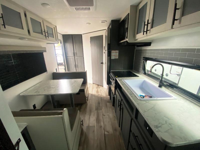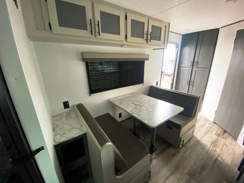 Whatever reason you camp, this lightweight trailer allows you to easily tow to your campsite, and enjoy comforts of home such as your own residential queen bed, wardrobe storage, and a full bathroom with a shower. The booth dinette provides both seating space and sleeping space for a guest. The cook will have an oven and a microwave to make meals, and a 10 cu. ft. 12V refrigerator for cold items, plus a galley sink with high rise faucet to keep the dishes clean.