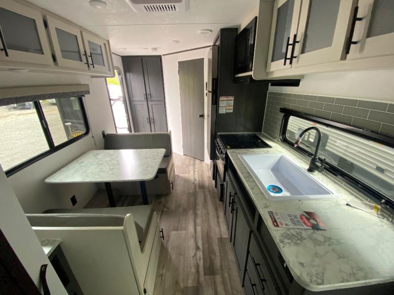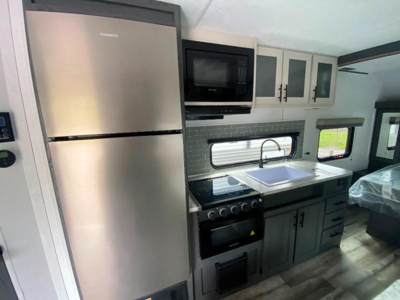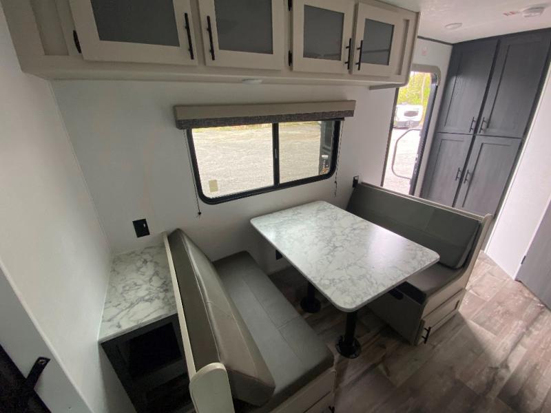 Whatever reason you camp, this lightweight trailer allows you to easily tow to your campsite, and enjoy comforts of home such as your own residential queen bed, wardrobe storage, and a full bathroom with a shower. The booth dinette provides both seating space and sleeping space for a guest. The cook will have an oven and a microwave to make meals, and a 10 cu. ft. 12V refrigerator for cold items, plus a galley sink with high rise faucet to keep the dishes clean.
