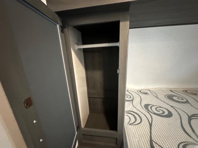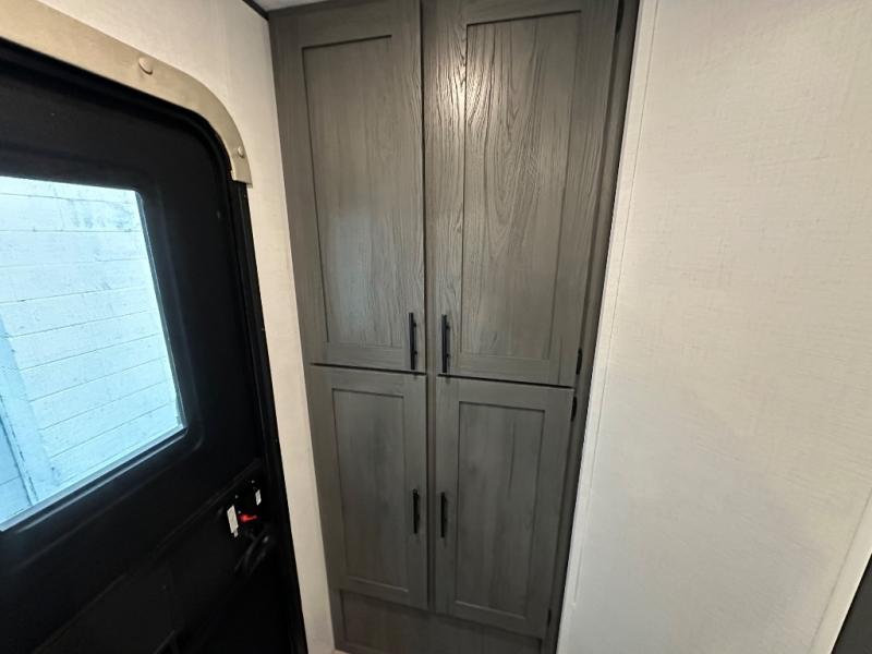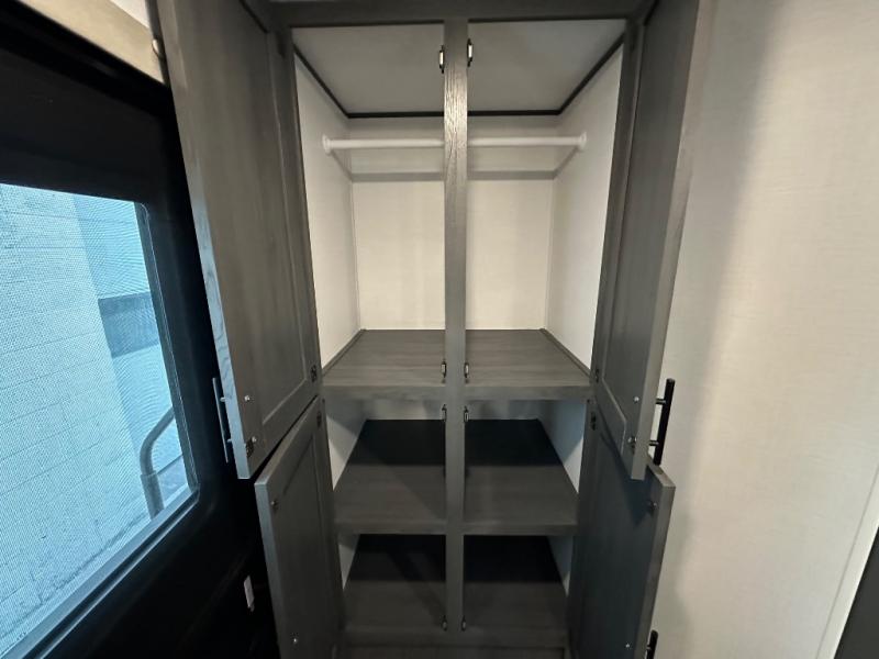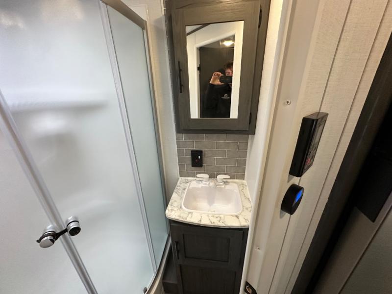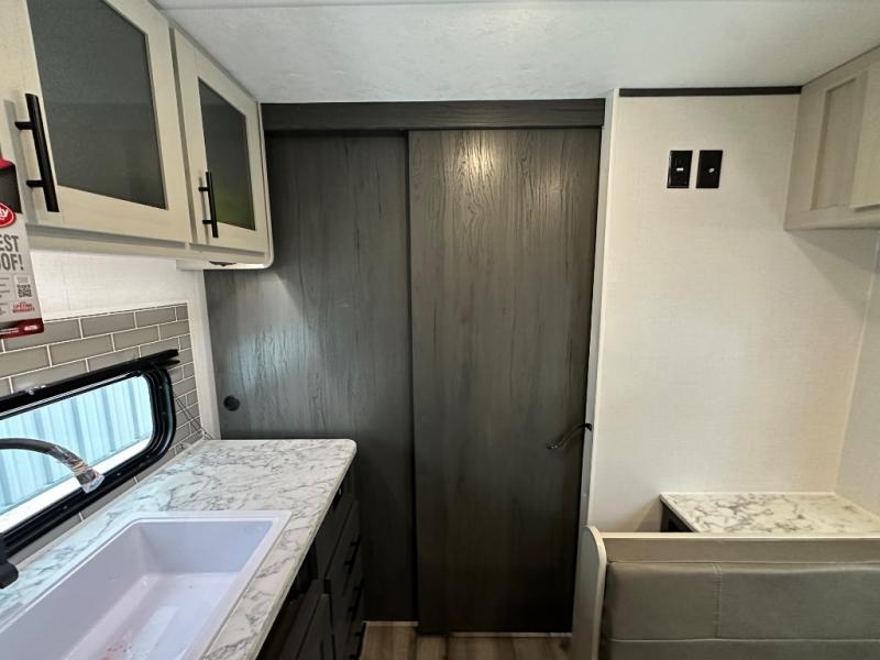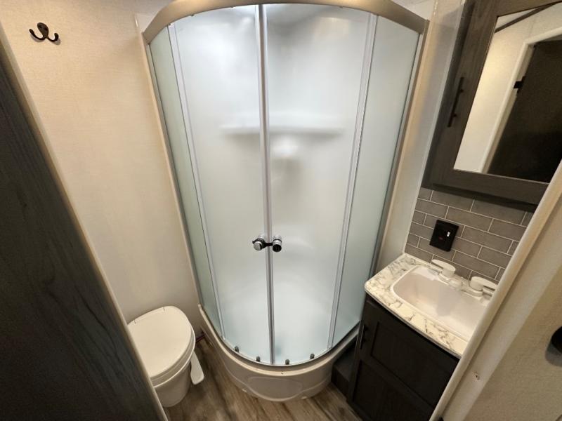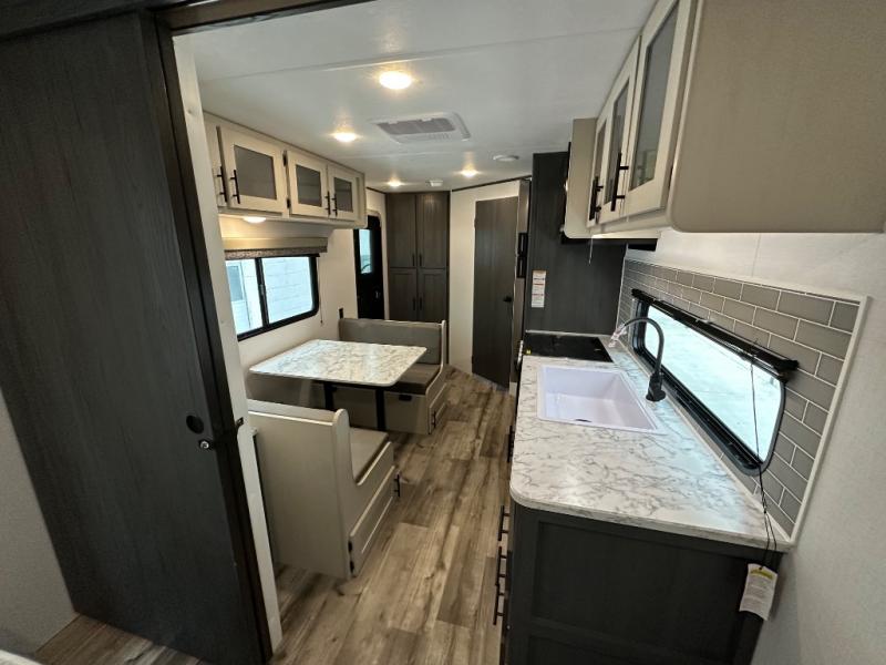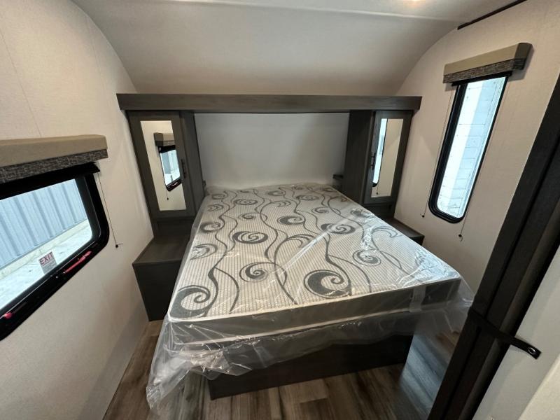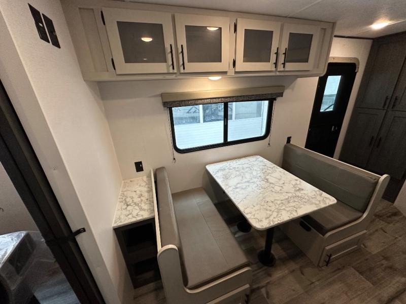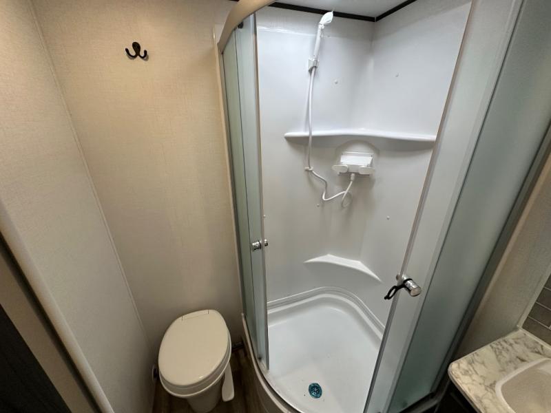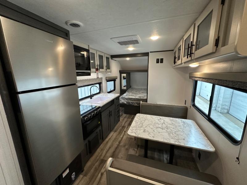 Whatever reason you camp, this lightweight trailer allows you to easily tow to your campsite, and enjoy comforts of home such as your own residential queen bed, wardrobe storage, and a full bathroom with a shower. The booth dinette provides both seating space and sleeping space for a guest. The cook will have an oven and a microwave to make meals, and a 10 cu. ft. 12V refrigerator for cold items, plus a galley sink with high rise faucet to keep the dishes clean.