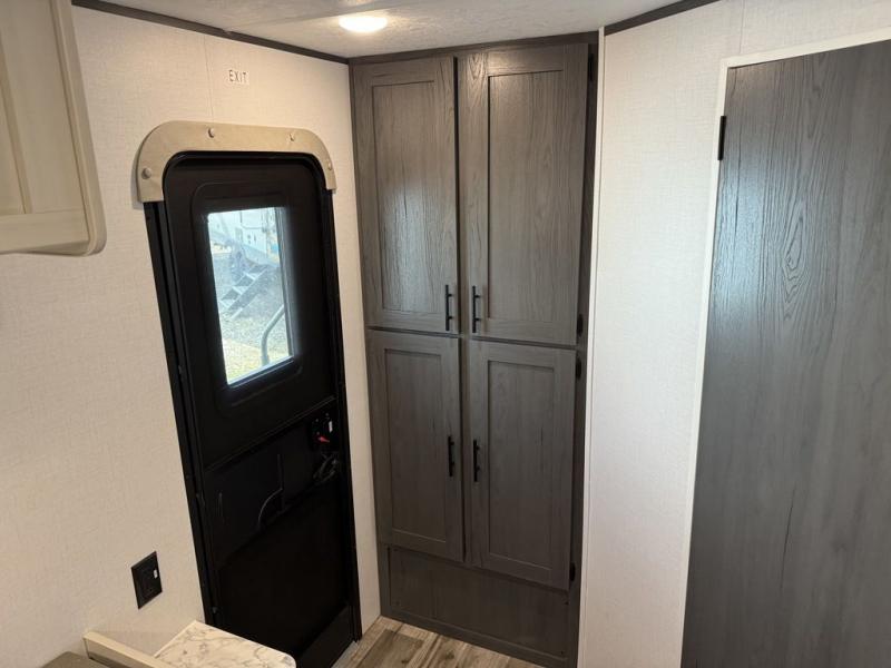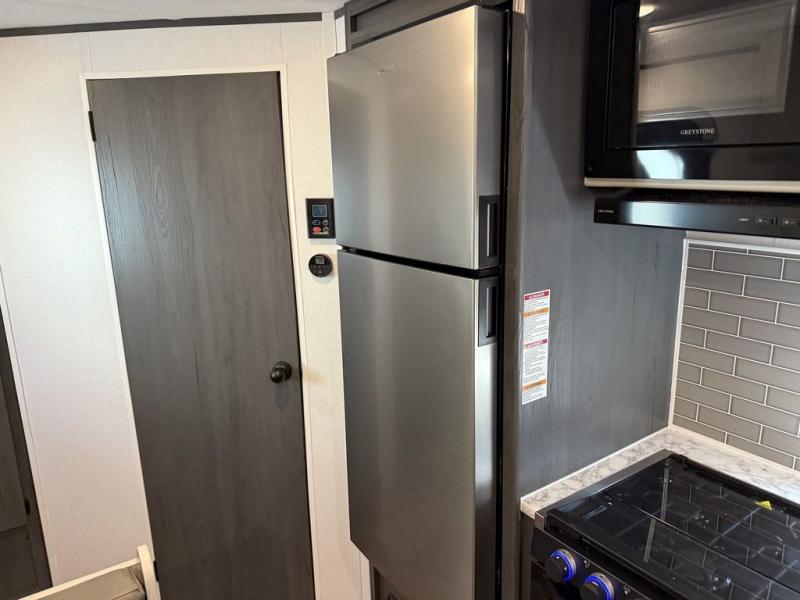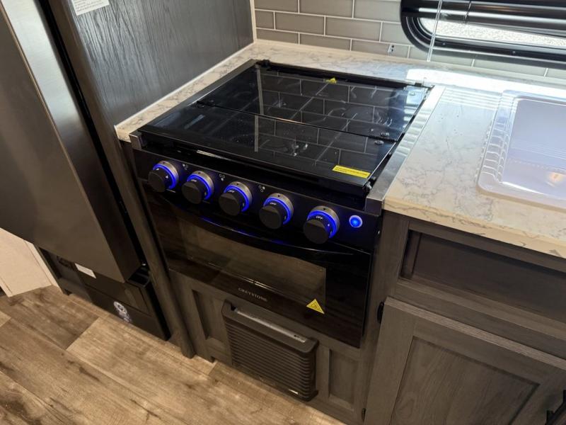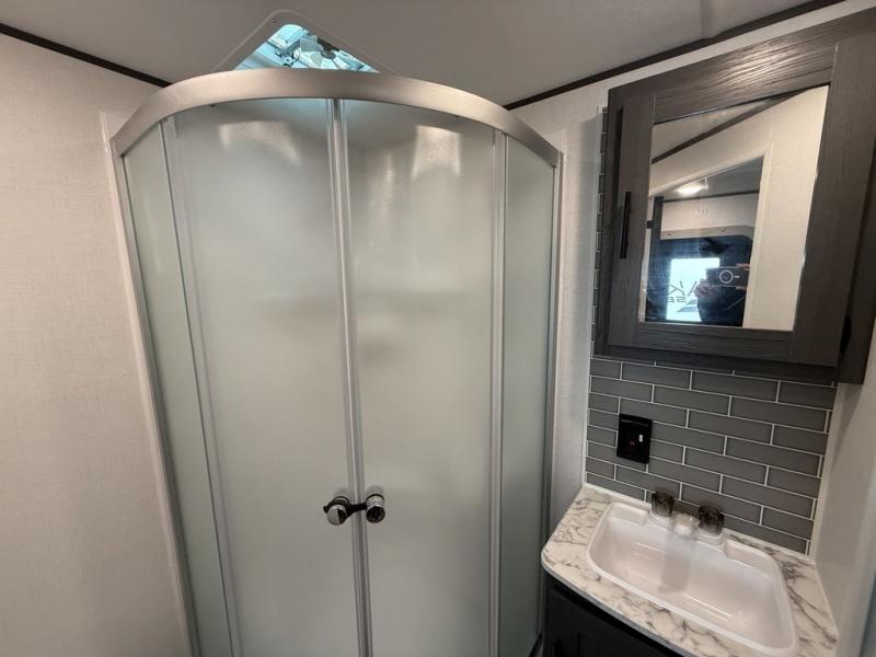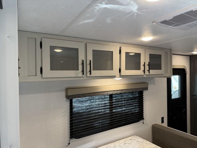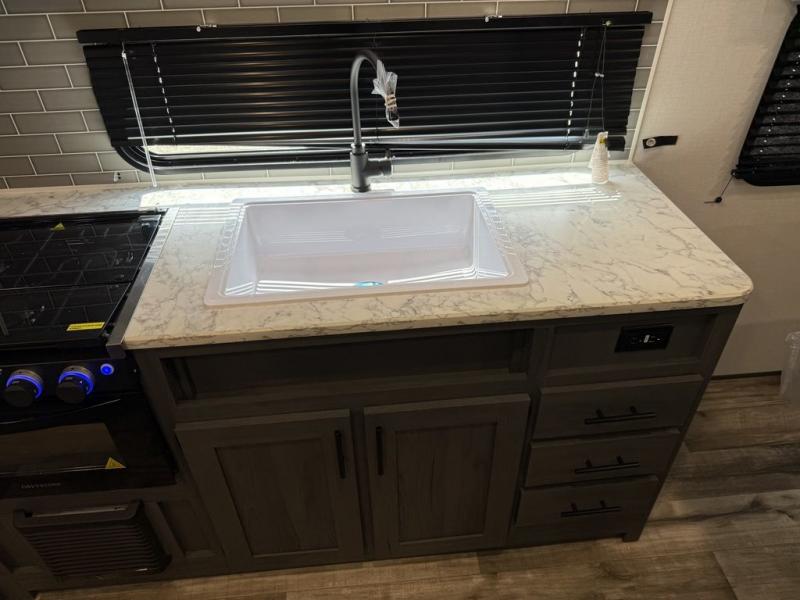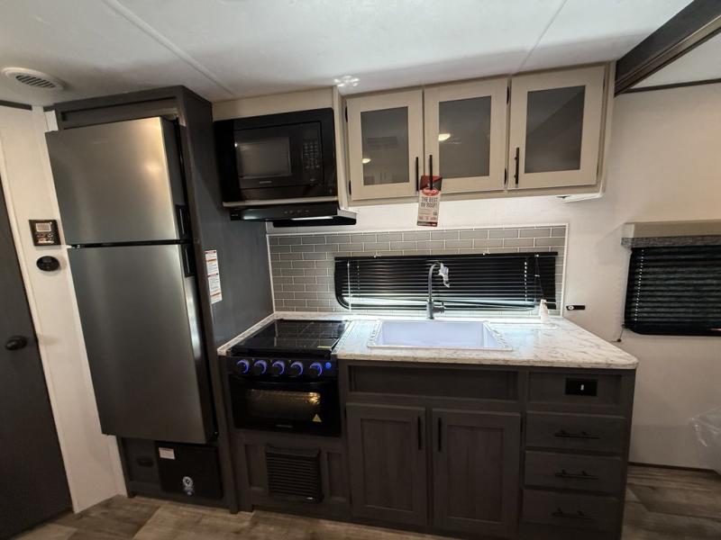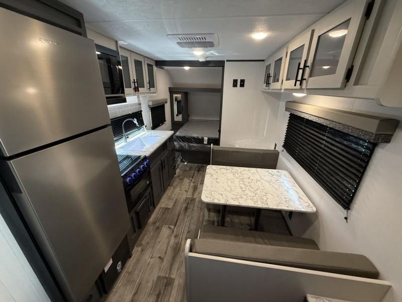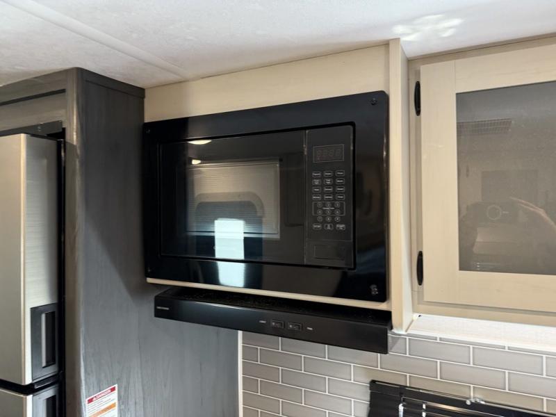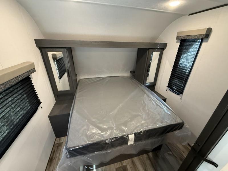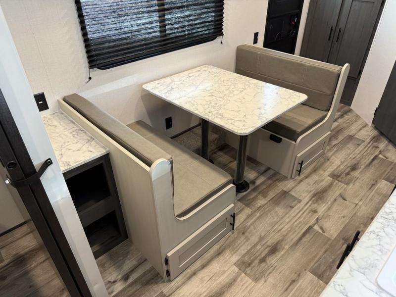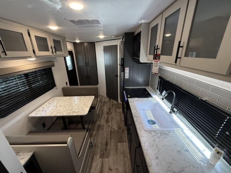 Whatever reason you camp, this lightweight trailer allows you to easily tow to your campsite, and enjoy comforts of home such as your own residential queen bed, wardrobe storage, and a full bathroom with a shower. The booth dinette provides both seating space and sleeping space for a guest. The cook will have an oven and a microwave to make meals, and a 10 cu. ft. 12V refrigerator for cold items, plus a galley sink with high rise faucet to keep the dishes clean.