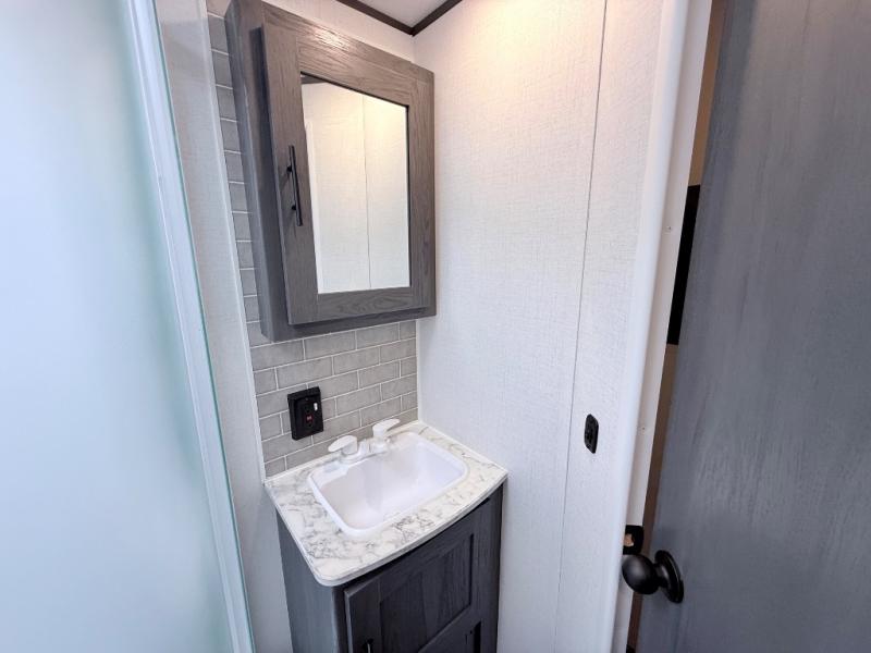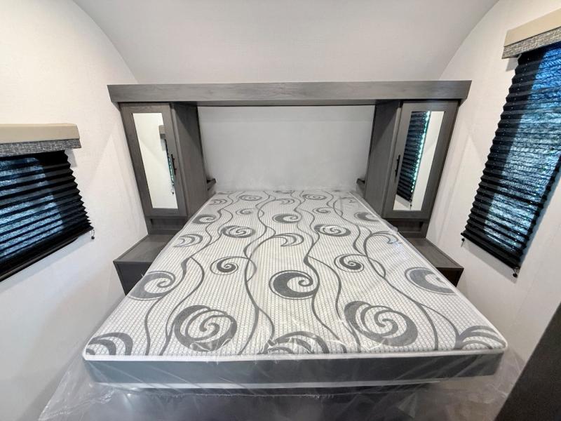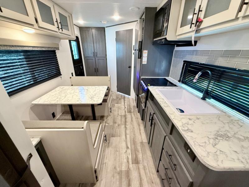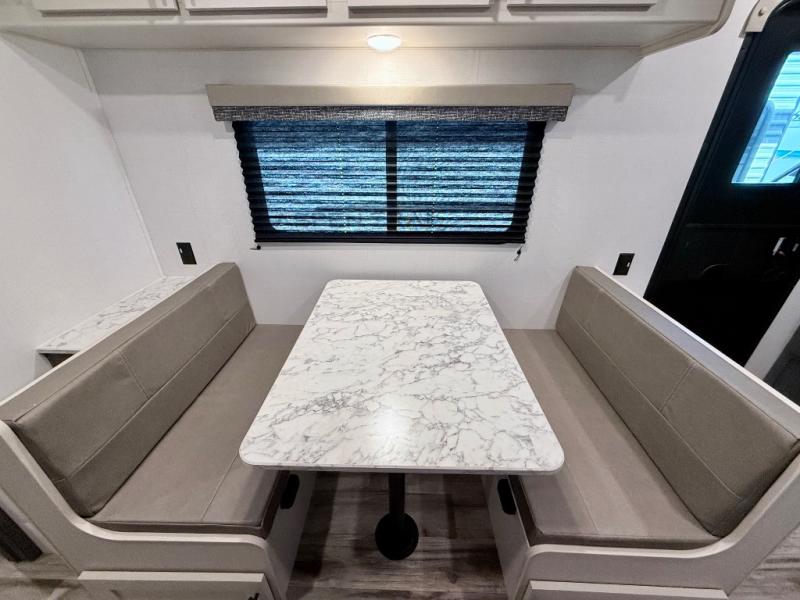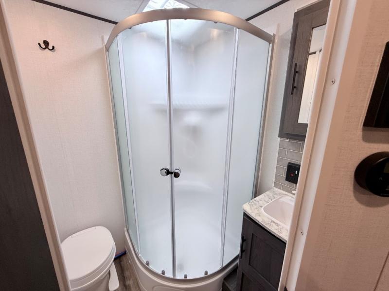 Whatever reason you camp, this lightweight trailer allows you to easily tow to your campsite, and enjoy comforts of home such as your own residential queen bed, wardrobe storage, and a full bathroom with a shower. The booth dinette provides both seating space and sleeping space for a guest. The cook will have an oven and a microwave to make meals, and a 10 cu. ft. 12V refrigerator for cold items, plus a galley sink with high rise faucet to keep the dishes clean.
