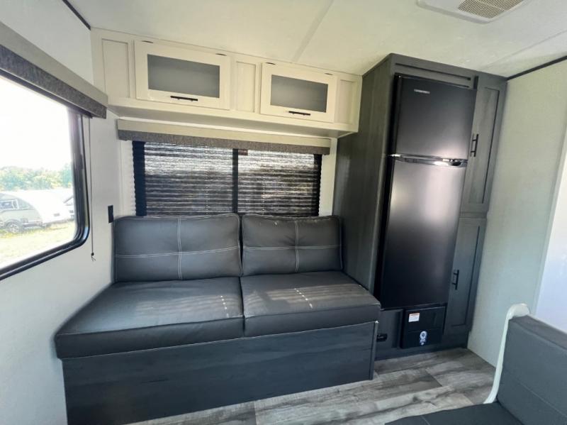 Whatever reason you camp, this lightweight trailer allows you to easily tow to your campsite, and enjoy comforts of home such as your own residential queen bed, wardrobe storage, a full bathroom with a shower, and furniture to relax and dine at. The sofa and booth dinette are across from each other, allowing you to visit with other RVers or your family. The cook will have an oven and a microwave to make meals, and a 10 cu. ft. 12V refrigerator for cold items, plus a galley sink with high rise faucet to keep the dishes clean.