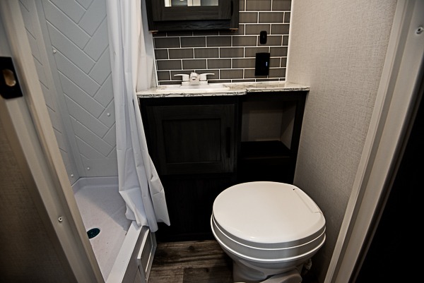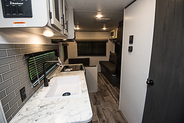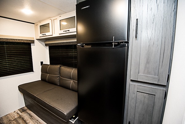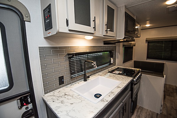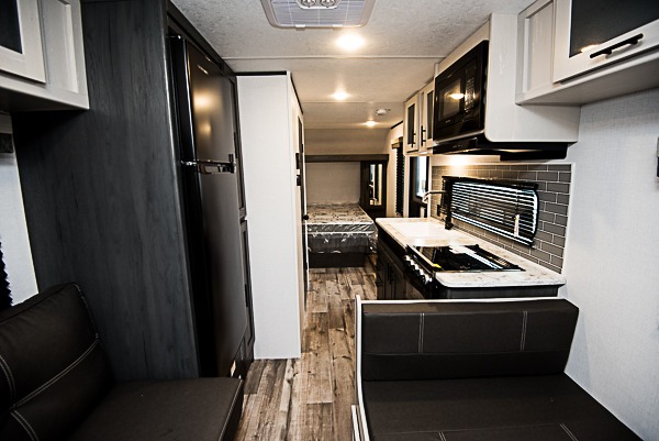 Whatever reason you camp, this lightweight trailer allows you to easily tow to your campsite, and enjoy comforts of home such as your own residential queen bed, wardrobe storage, a full bathroom with a shower, and furniture to relax and dine at. The sofa and booth dinette are across from each other, allowing you to visit with other RVers or your family. The cook will have an oven and a microwave to make meals, and a 10 cu. ft. 12V refrigerator for cold items, plus a galley sink with high rise faucet to keep the dishes clean.