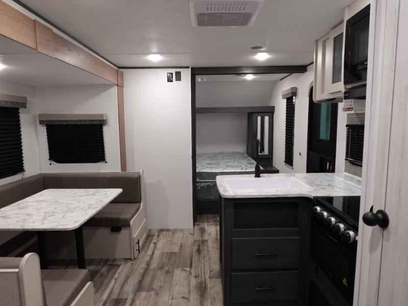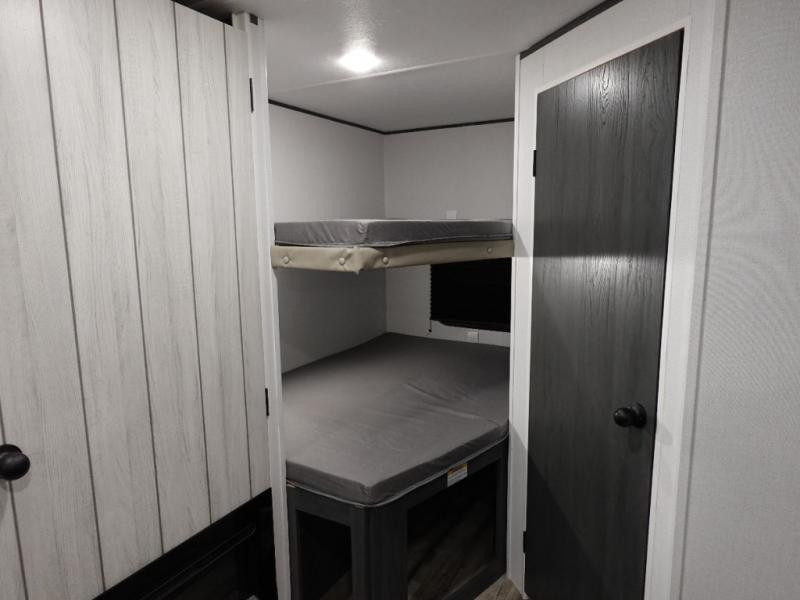 You can take along extra family and friends in this Aspen Trail LE bunkhouse model. The rear double-size bunks will easily sleep kids and their friends, or added family. There is also a front bedroom with a residential 60" x 80" queen size bed. A single slide helps open up the floor space for more room to move about with everyone inside, and it features a pantry and convertible U-shaped dinette. This is a great place for game night and meals which you can easily make in the fully equipped kitchen. In the rear corner you will find a full bath with shower, toilet, and sink which means no camp facilities in the middle of the night with a flashlight!