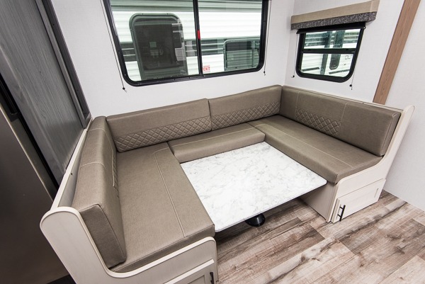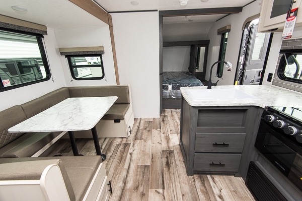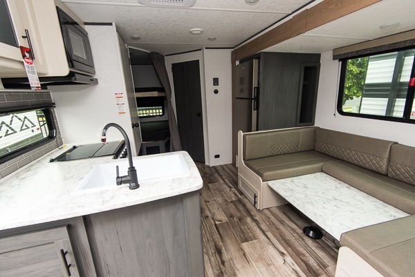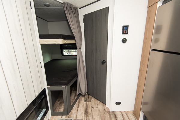 You can take along extra family and friends in this Aspen Trail LE bunkhouse model. The rear double-size bunks will easily sleep kids and their friends, or added family. There is also a front bedroom with a residential 60" x 80" queen size bed. A single slide helps open up the floor space for more room to move about with everyone inside, and it features a pantry and convertible U-shaped dinette. This is a great place for game night and meals which you can easily make in the fully equipped kitchen. In the rear corner you will find a full bath with shower, toilet, and sink which means no camp facilities in the middle of the night with a flashlight!