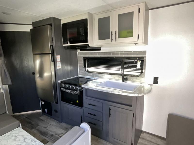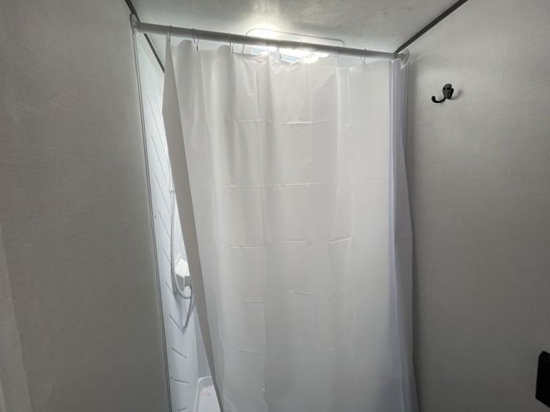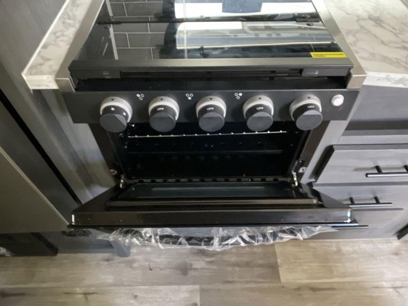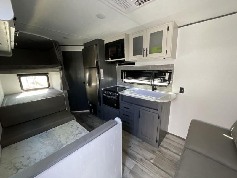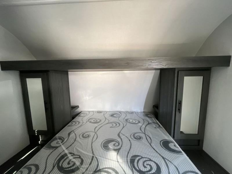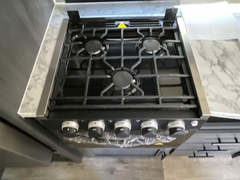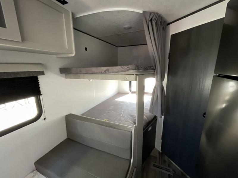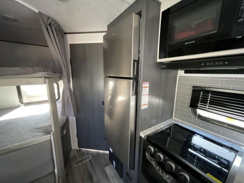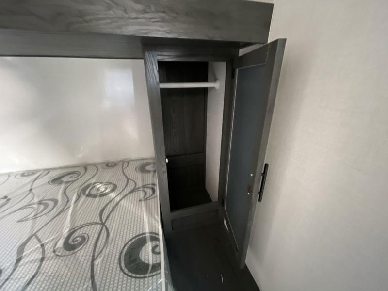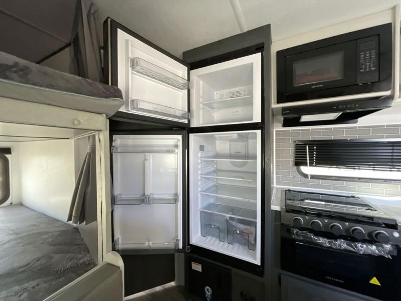 Enjoy privacy in the front bedroom when you close the curtains. You can sleep on your own residential queen bed, and there are two wardrobes to stow away your clothes. Your family and friends can sleep on the double-size bunks in the rear next to the full bathroom with a shower, and the booth dinette as well as the sofa provide extra sleeping space. The 10 cu. ft. 12V refrigerator will hold your cold items, and you can cook using the range top, and keep everything clean using the galley sink with a high rise faucet. And the overhead cabinets will hold your dishes, snacks and such.