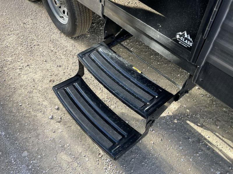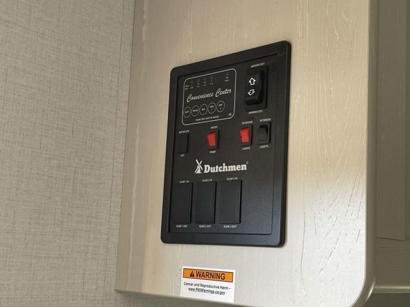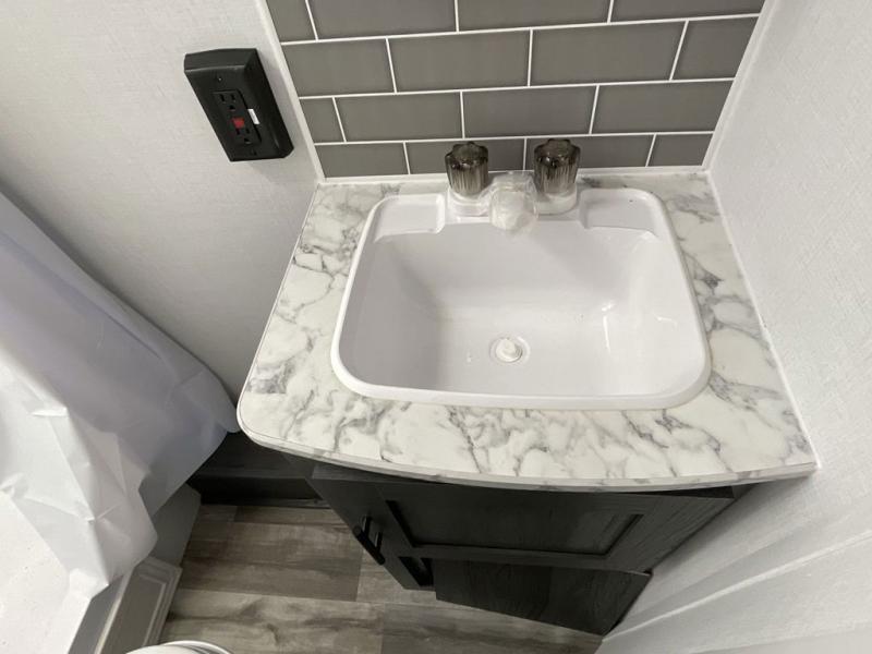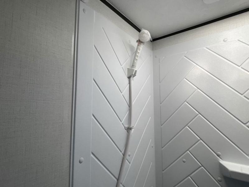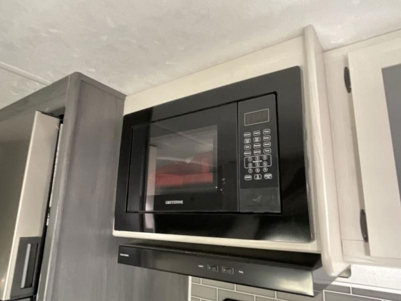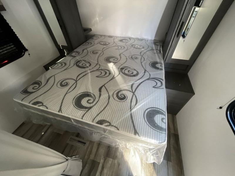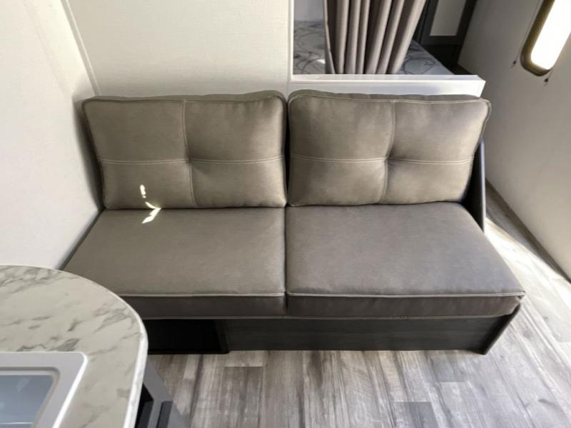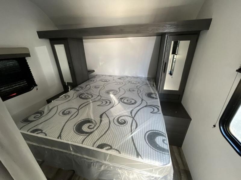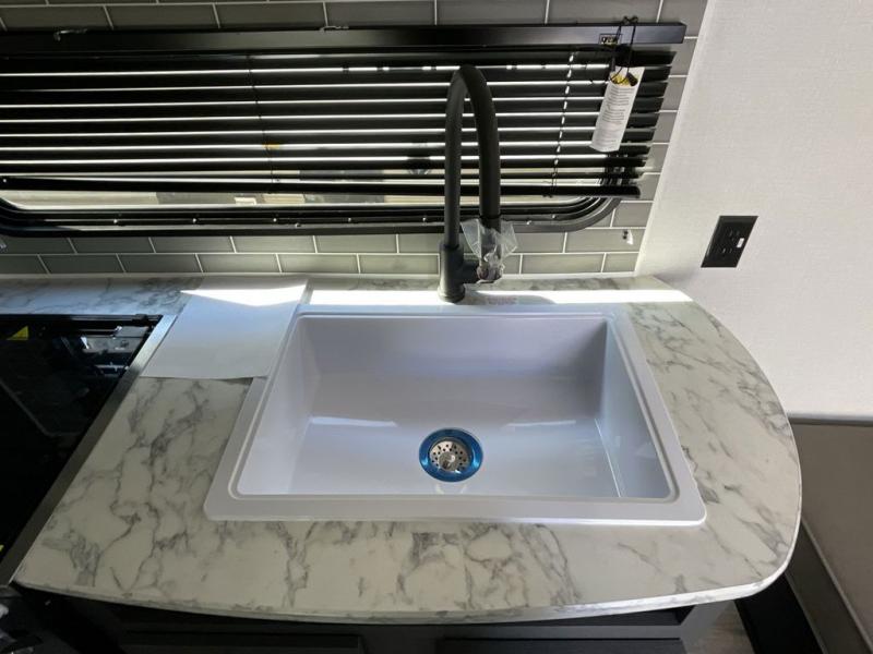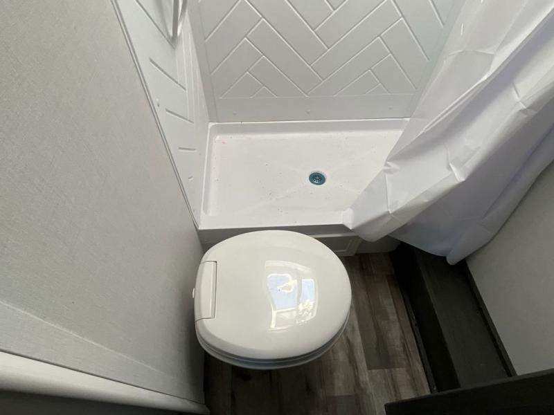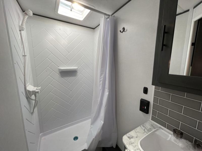 Enjoy privacy in the front bedroom when you close the curtains. You can sleep on your own residential queen bed, and there are two wardrobes to stow away your clothes. Your family and friends can sleep on the double-size bunks in the rear next to the full bathroom with a shower, and the booth dinette as well as the sofa provide extra sleeping space. The 10 cu. ft. 12V refrigerator will hold your cold items, and you can cook using the range top, and keep everything clean using the galley sink with a high rise faucet. And the overhead cabinets will hold your dishes, snacks and such.