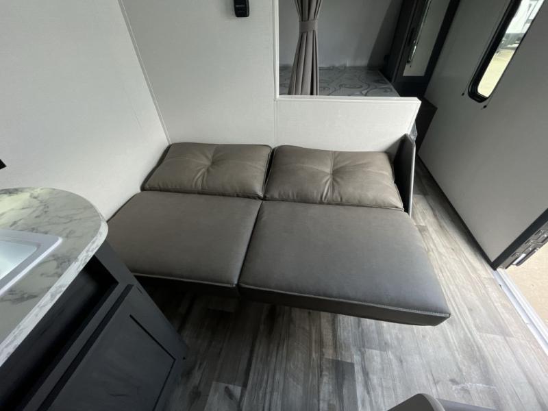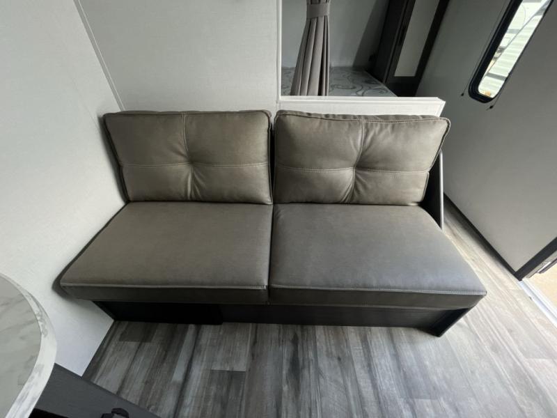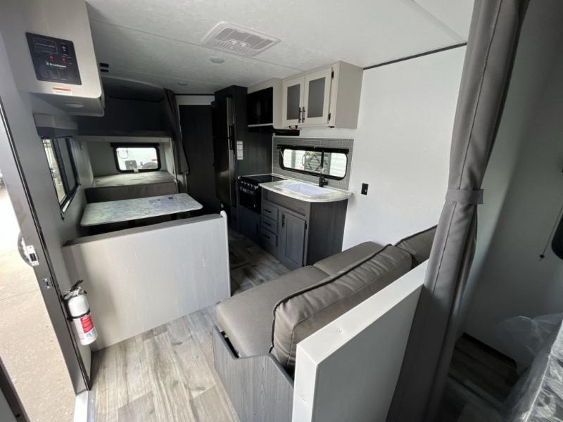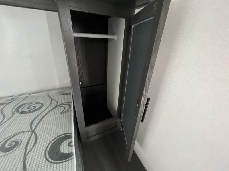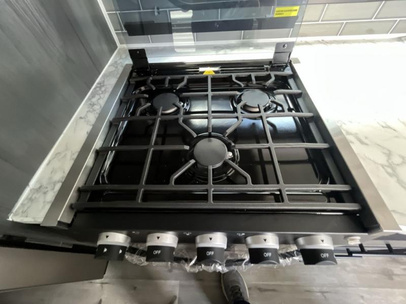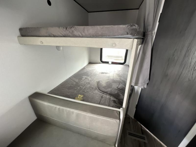 Enjoy privacy in the front bedroom when you close the curtains. You can sleep on your own residential queen bed, and there are two wardrobes to stow away your clothes. Your family and friends can sleep on the double-size bunks in the rear next to the full bathroom with a shower, and the booth dinette as well as the sofa provide extra sleeping space. The 10 cu. ft. 12V refrigerator will hold your cold items, and you can cook using the range top, and keep everything clean using the galley sink with a high rise faucet. And the overhead cabinets will hold your dishes, snacks and such.