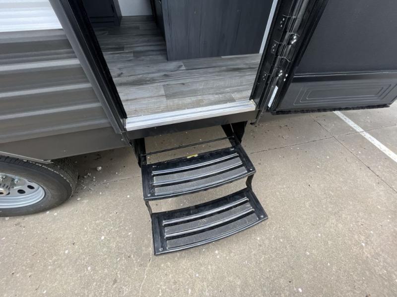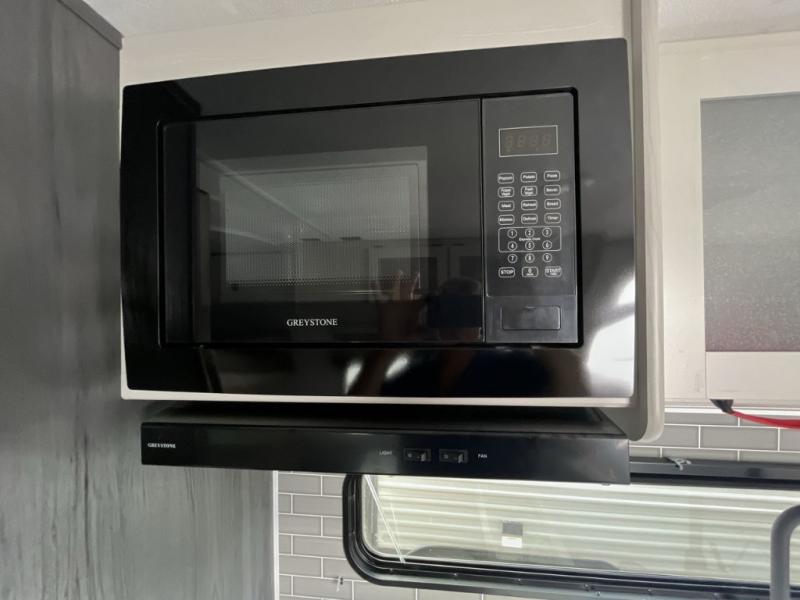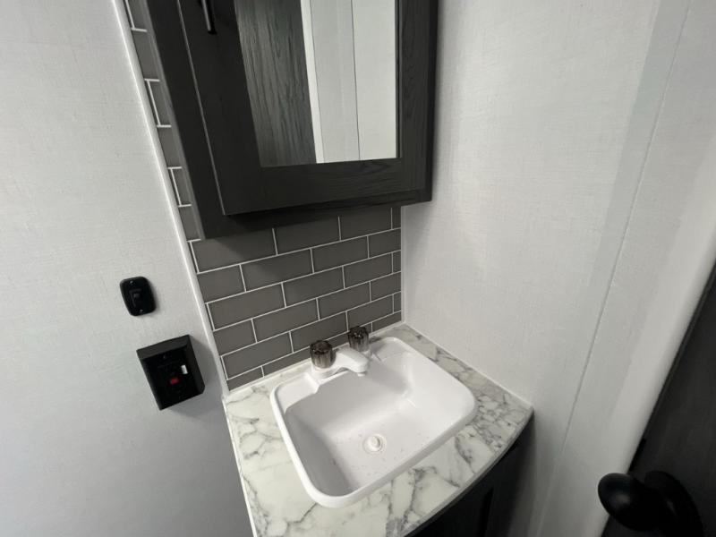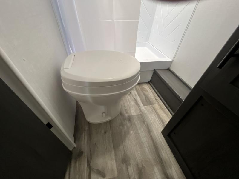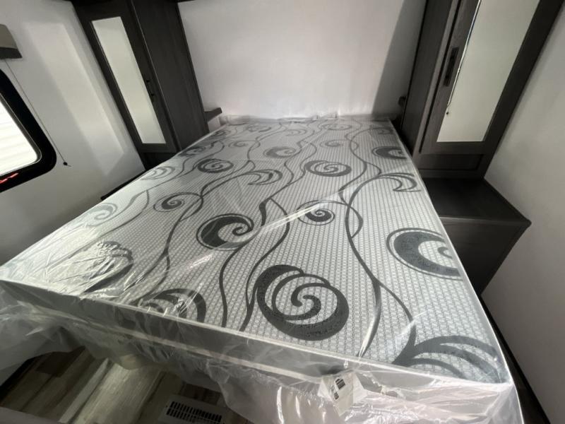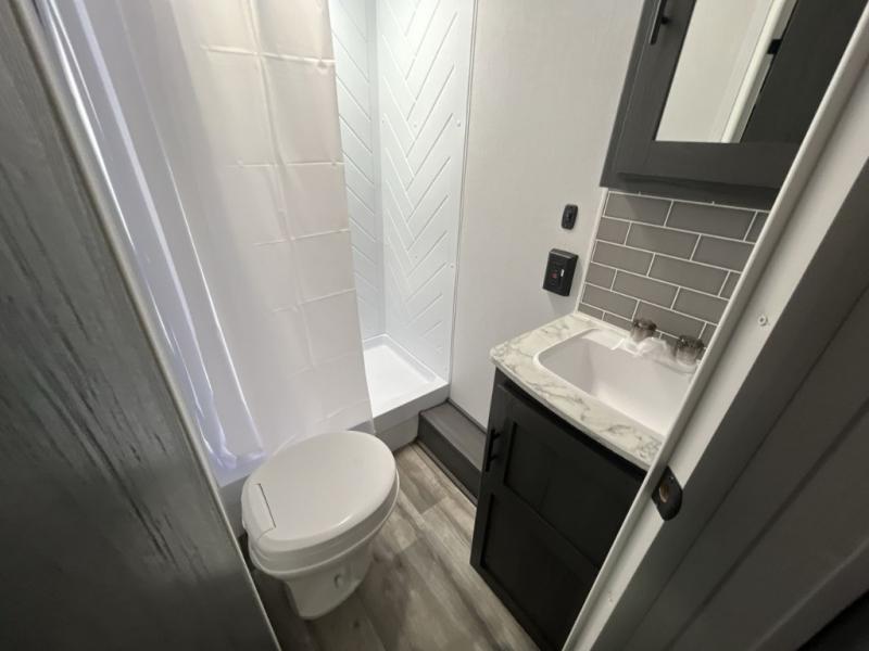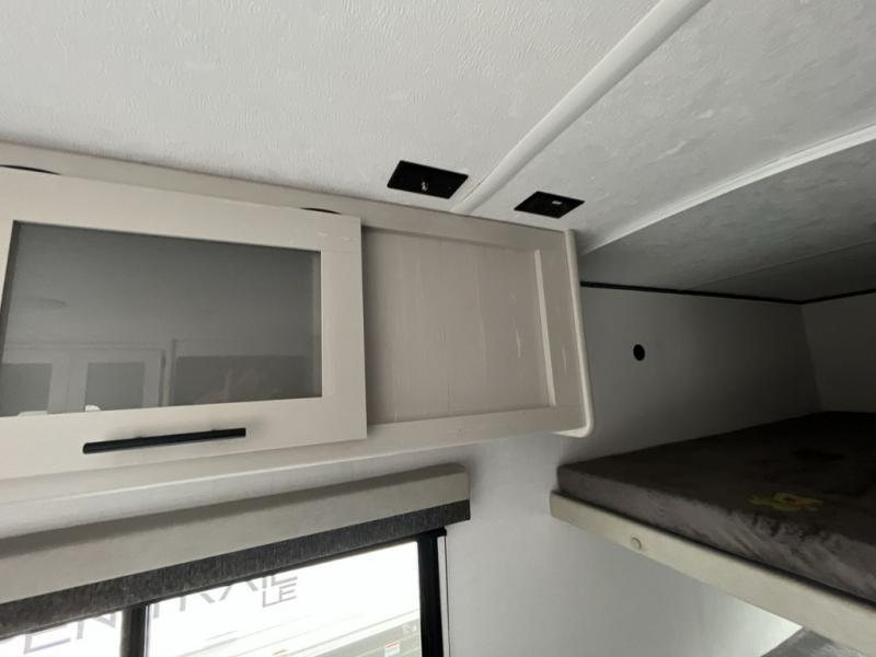 Enjoy privacy in the front bedroom when you close the curtains. You can sleep on your own residential queen bed, and there are two wardrobes to stow away your clothes. Your family and friends can sleep on the double-size bunks in the rear next to the full bathroom with a shower, and the booth dinette as well as the sofa provide extra sleeping space. The 10 cu. ft. 12V refrigerator will hold your cold items, and you can cook using the range top, and keep everything clean using the galley sink with a high rise faucet. And the overhead cabinets will hold your dishes, snacks and such.