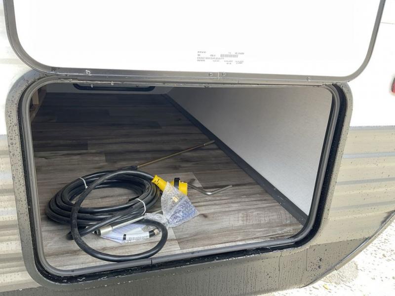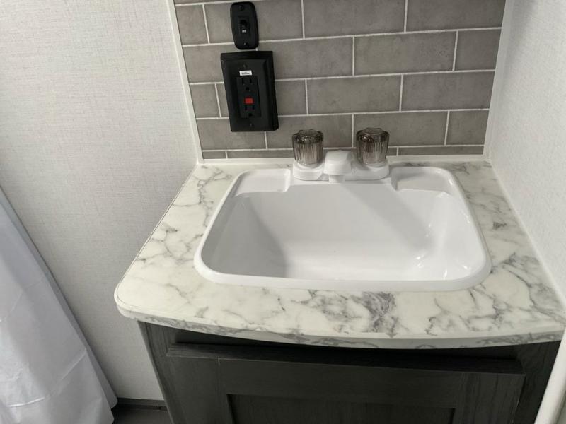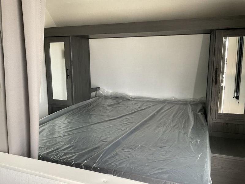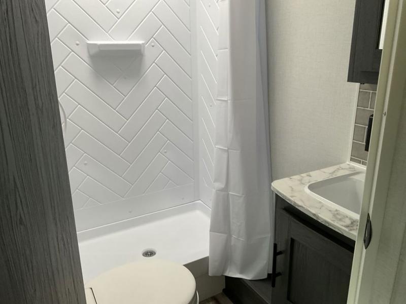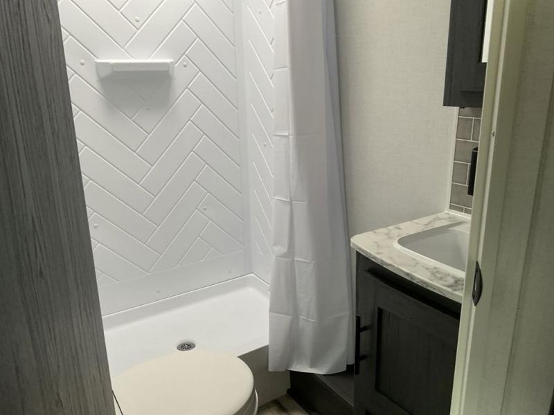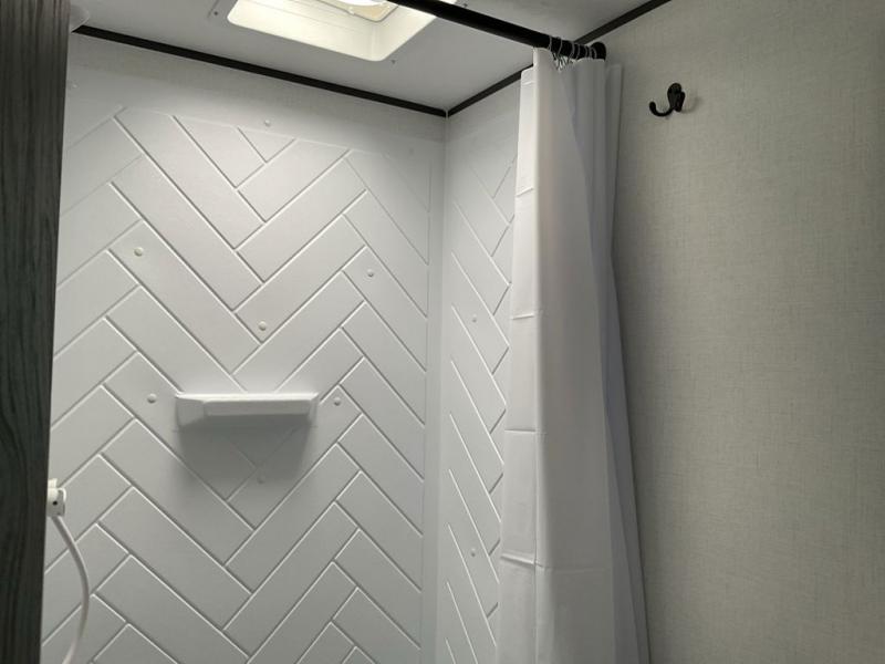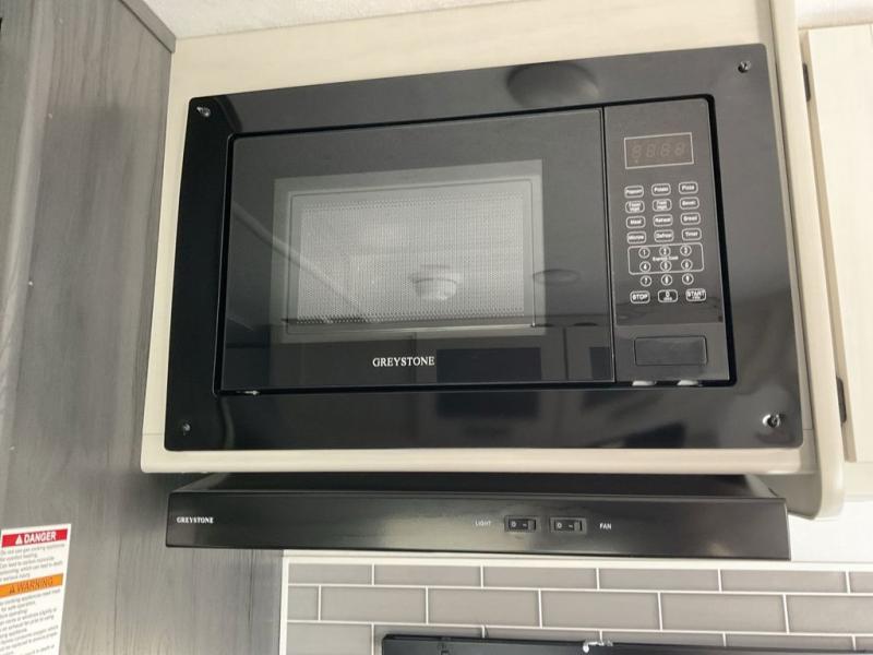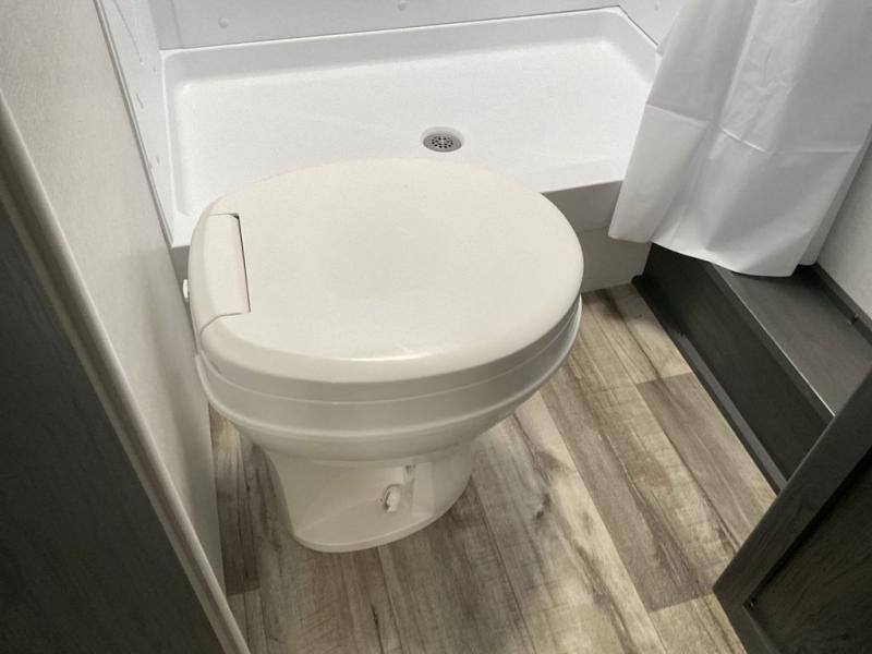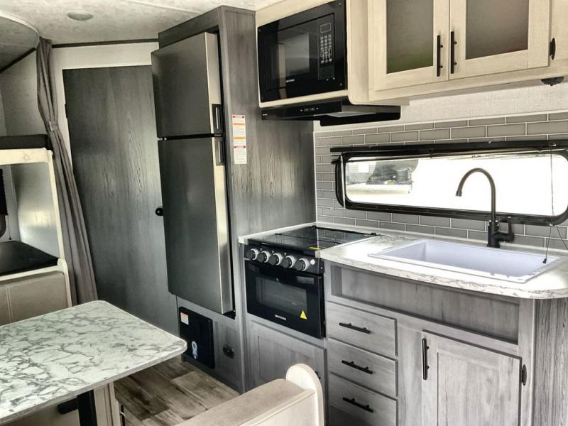 Enjoy privacy in the front bedroom when you close the curtains. You can sleep on your own residential queen bed, and there are two wardrobes to stow away your clothes. Your family and friends can sleep on the double-size bunks in the rear next to the full bathroom with a shower, and the booth dinette as well as the sofa provide extra sleeping space. The 10 cu. ft. 12V refrigerator will hold your cold items, and you can cook using the range top, and keep everything clean using the galley sink with a high rise faucet. And the overhead cabinets will hold your dishes, snacks and such.