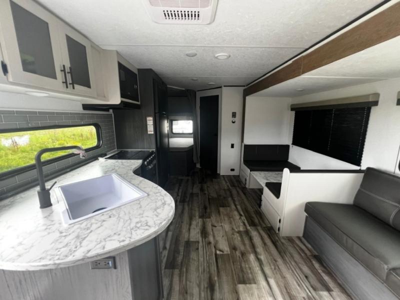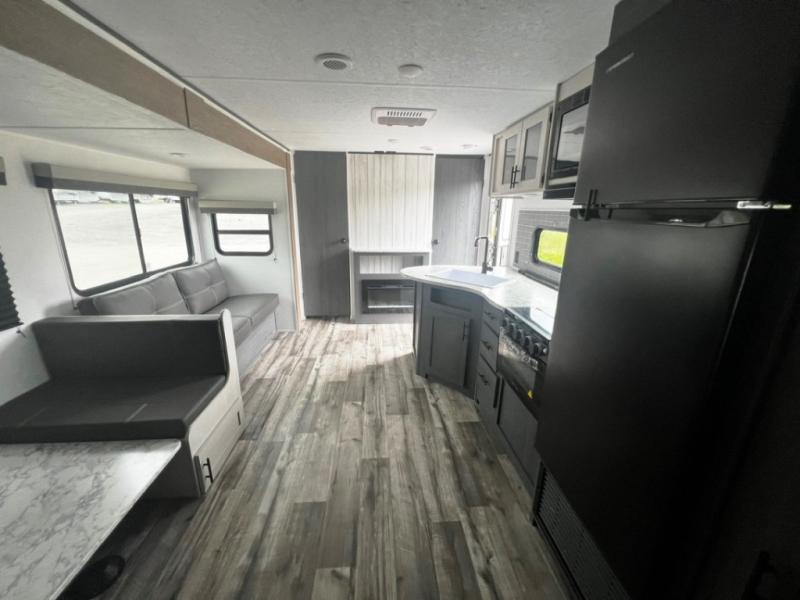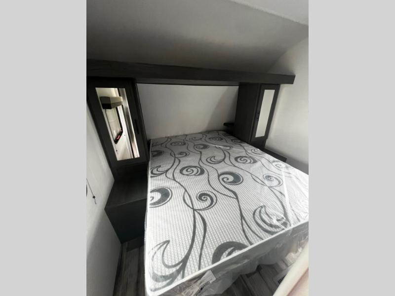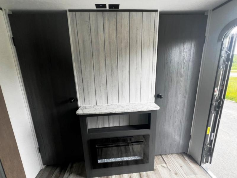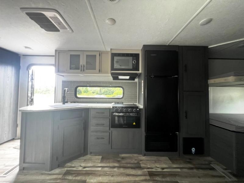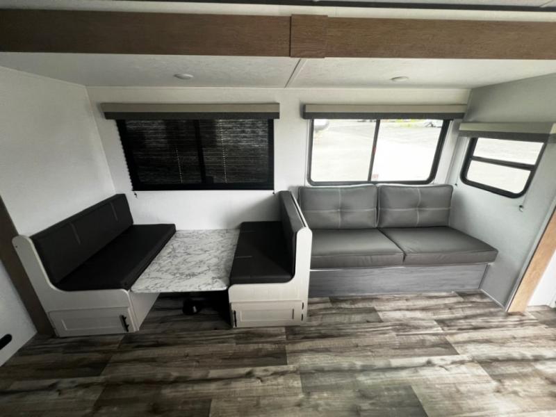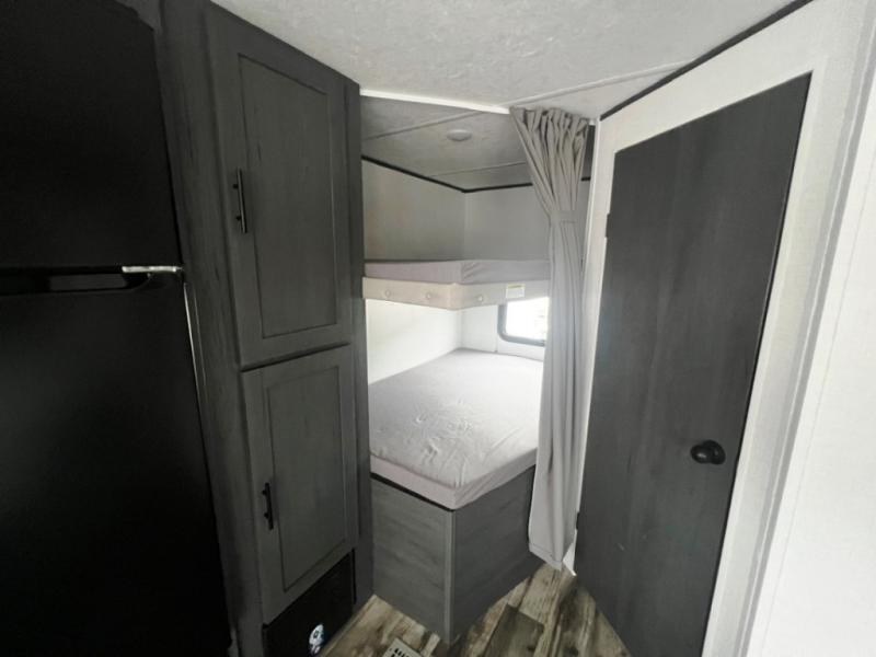 Get ready for fun and relaxation at the campgrounds with this trailer in your campsite. You can fish in the river, hike the trails and relax under the power awning before heading inside to enjoy the comforts of home. You will also enjoy having double access to the private bedroom which offers a residential queen bed and dual closets, plus the full bathroom will keep you refreshed after outdoor fun. The double-size bunks offer sleeping for four, and the furniture doubles as extra sleeping space. The cook will have full amenities including a 10 cu. ft. 12V refrigerator to store lots of cold items. And the single slide gives everyone more floor space.
