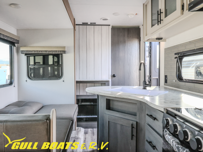 Get ready for fun and relaxation at the campgrounds with this trailer in your campsite. You can fish in the river, hike the trails and relax under the power awning before heading inside to enjoy the comforts of home. You will also enjoy having double access to the private bedroom which offers a residential queen bed and dual closets, plus the full bathroom will keep you refreshed after outdoor fun. The double-size bunks offer sleeping for four, and the furniture doubles as extra sleeping space. The cook will have full amenities including a 10 cu. ft. 12V refrigerator to store lots of cold items. And the large slide gives everyone more floor space.