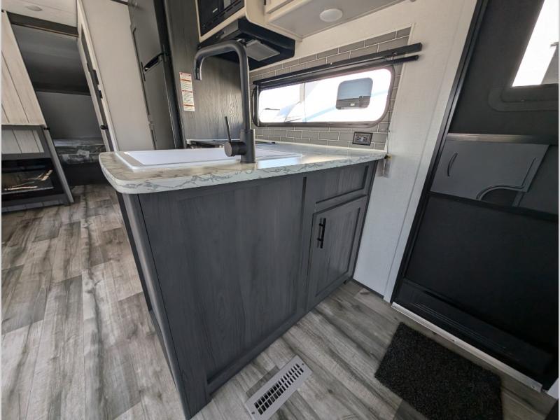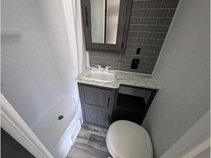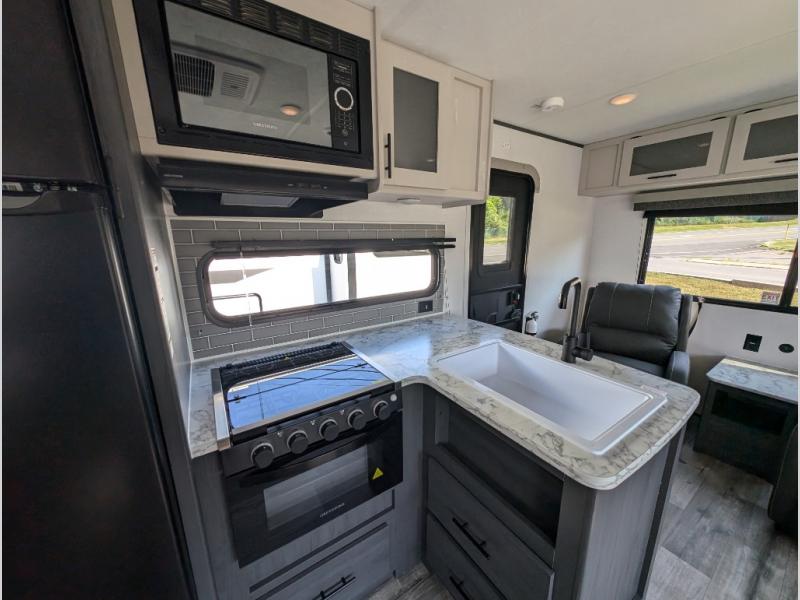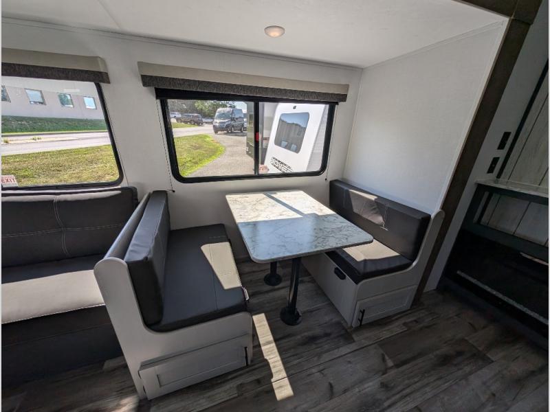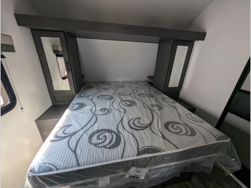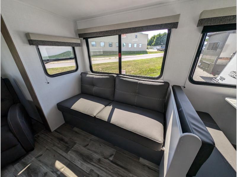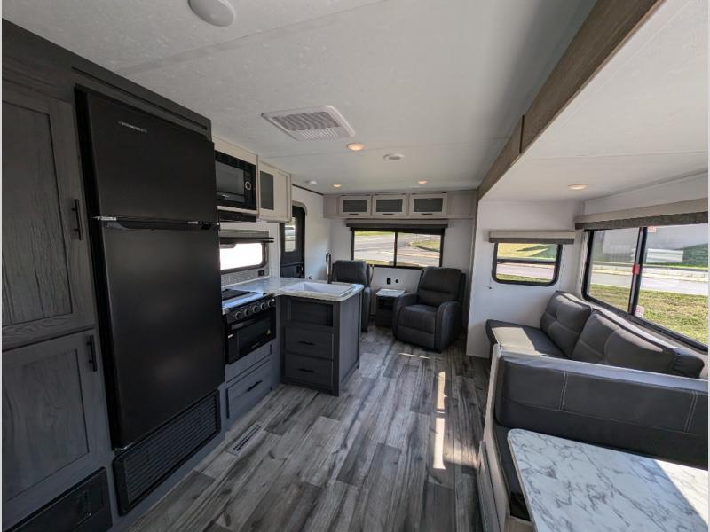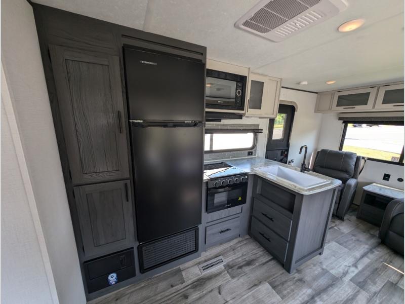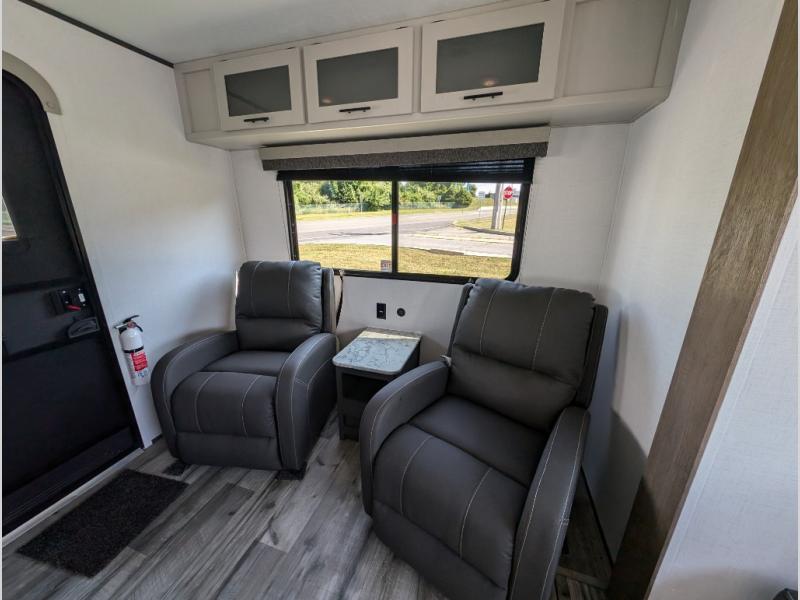 With dual entry doors, you can easily enter and exit this travel trailer! The jackknife sofa with footrest and booth dinette are next to each other near the fireplace, as well as two rear recliners allowing you to visit with other RVers or your family. The cook will have an oven and a microwave to make meals, and a 10 cu. ft. 12V refrigerator for cold items, plus a galley sink with high rise faucet to keep the dishes clean. Speaking of being clean, the full bathroom offers a shower with exhaust fan to eliminate unwanted steam as you clean yourself up after a fun day at the beach. The front private bedroom has a residential queen bed and one of the entrance/exit doors so you can slip out for an early morning fishing trip!