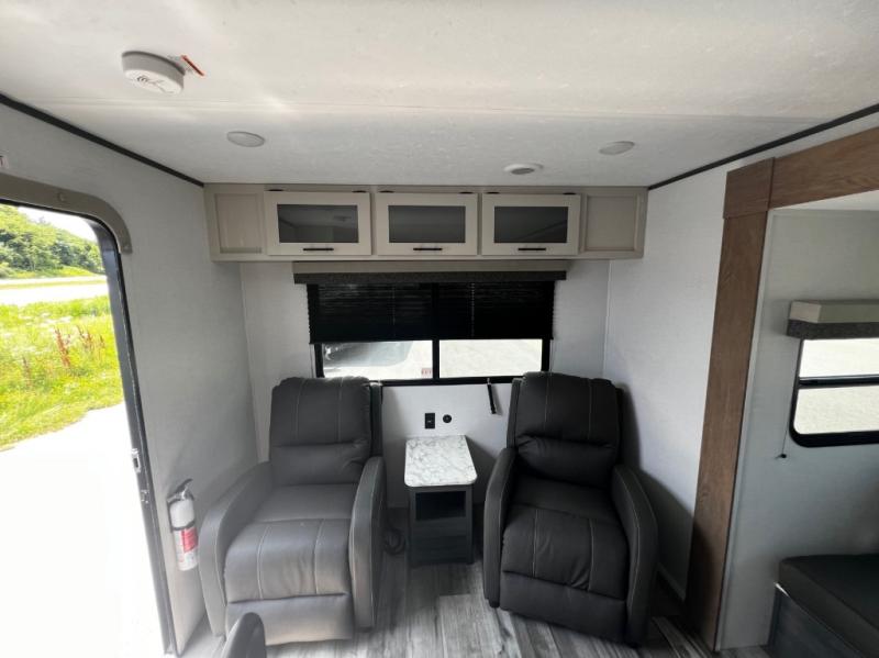 With dual entry doors, you can easily enter and exit this travel trailer! The jackknife sofa with footrest and booth dinette are next to each other near the fireplace, as well as two rear recliners allowing you to visit with other RVers or your family. The cook will have an oven and a microwave to make meals, and a 10 cu. ft. 12V refrigerator for cold items, plus a galley sink with high rise faucet to keep the dishes clean. Speaking of being clean, the full bathroom offers a shower with exhaust fan to eliminate unwanted steam as you clean yourself up after a fun day at the beach. The front private bedroom has a residential queen bed and one of the entrance/exit doors so you can slip out for an early morning fishing trip!