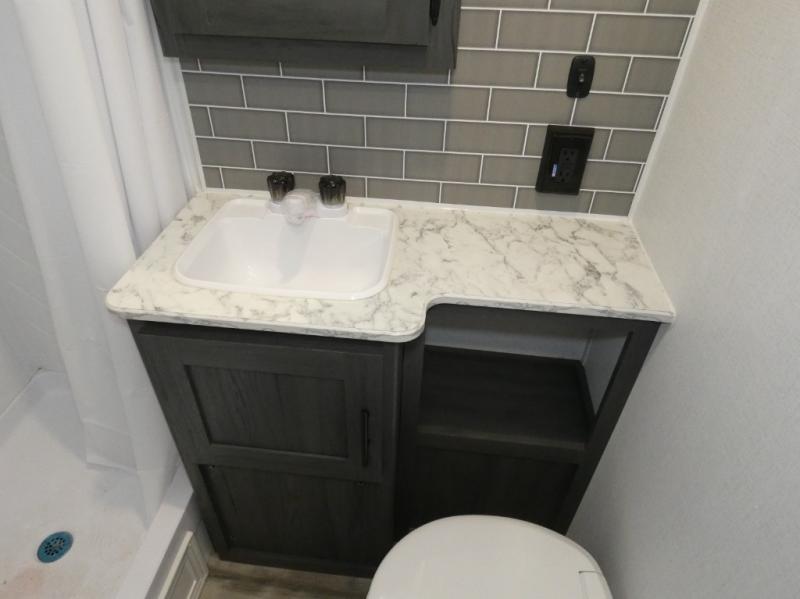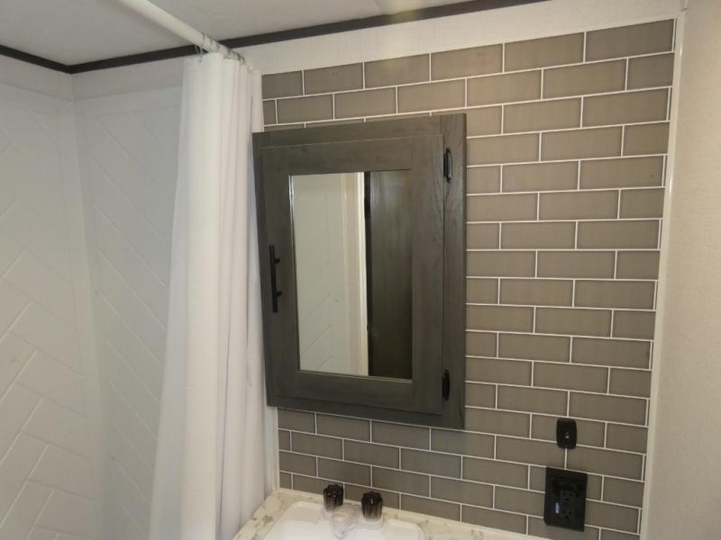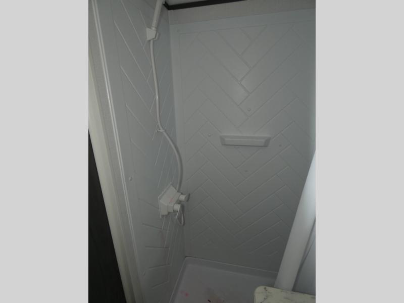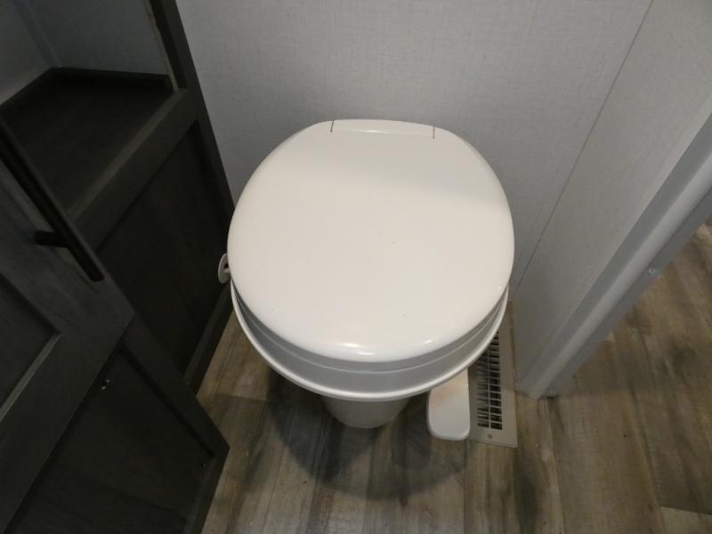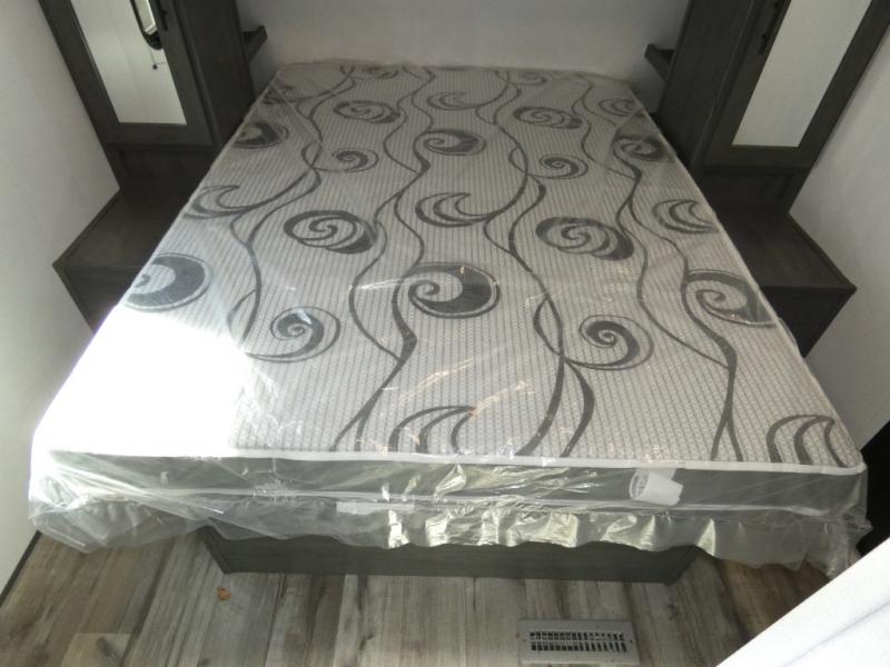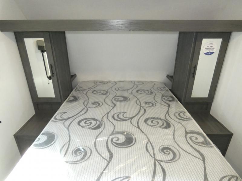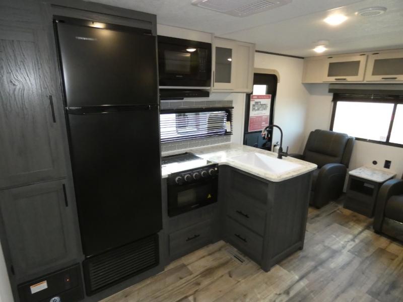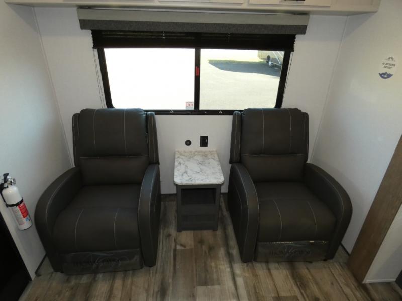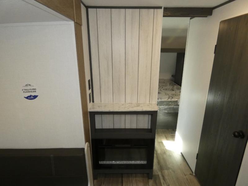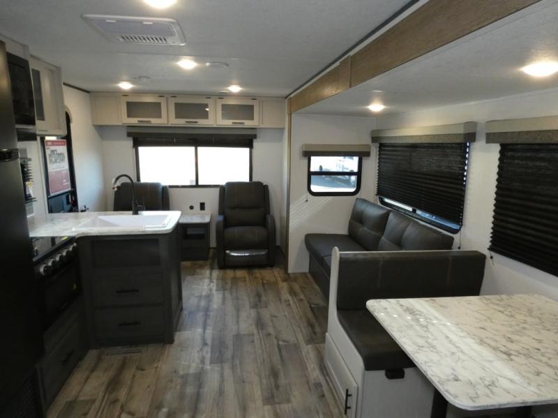 With dual entry doors, you can easily enter and exit this travel trailer! The jackknife sofa with footrest and booth dinette are next to each other near the fireplace, as well as two rear recliners allowing you to visit with other RVers or your family. The cook will have an oven and a microwave to make meals, and a 10 cu. ft. 12V refrigerator for cold items, plus a galley sink with high rise faucet to keep the dishes clean. Speaking of being clean, the full bathroom offers a shower with exhaust fan to eliminate unwanted steam as you clean yourself up after a fun day at the beach. The front private bedroom has a residential queen bed and one of the entrance/exit doors so you can slip out for an early morning fishing trip!