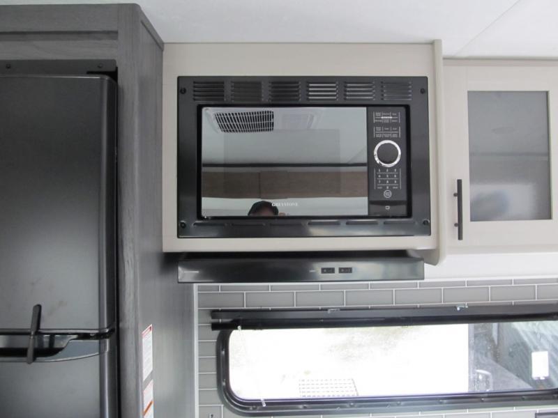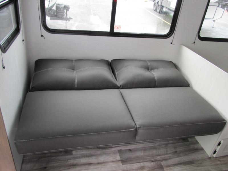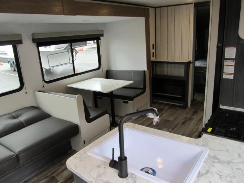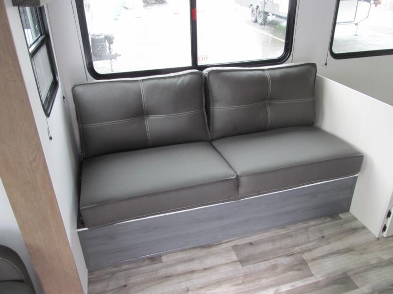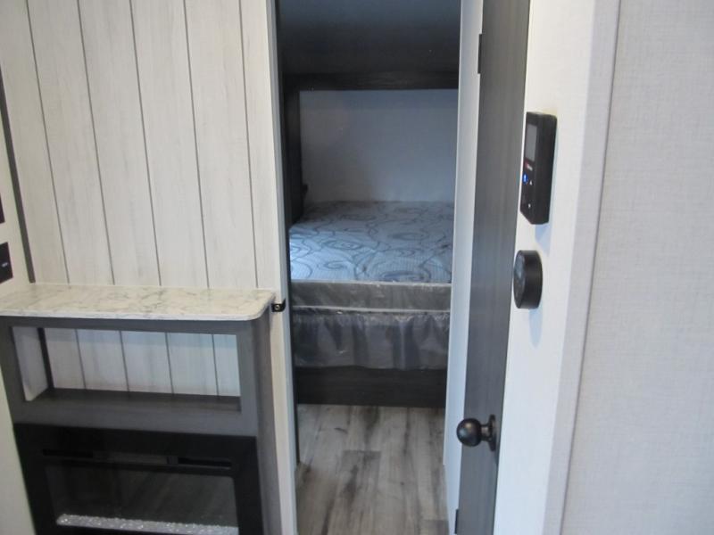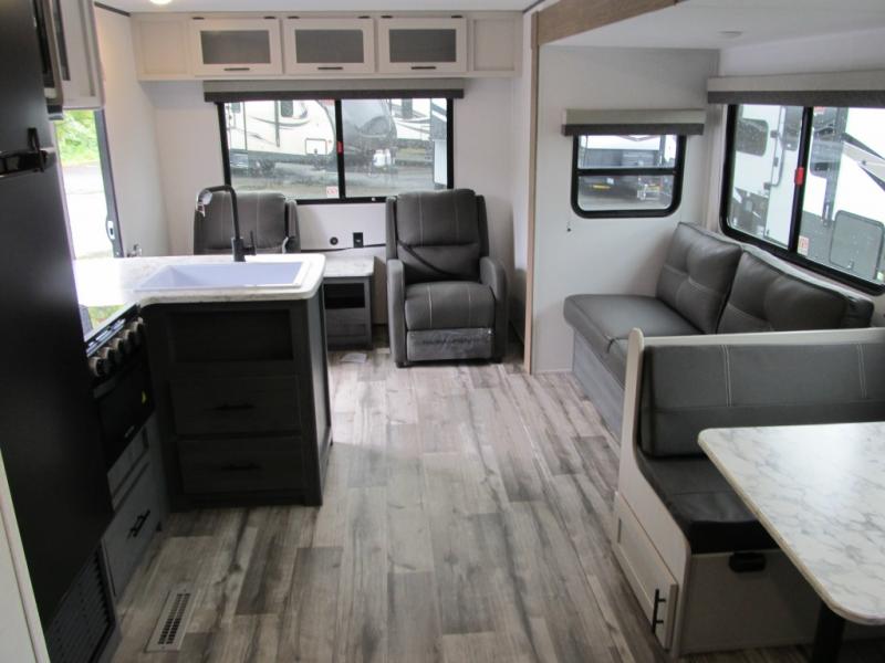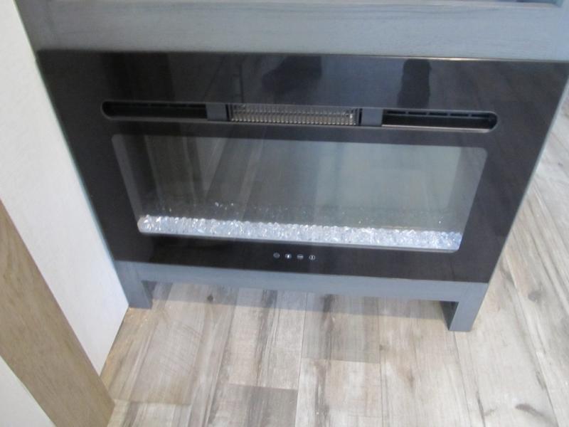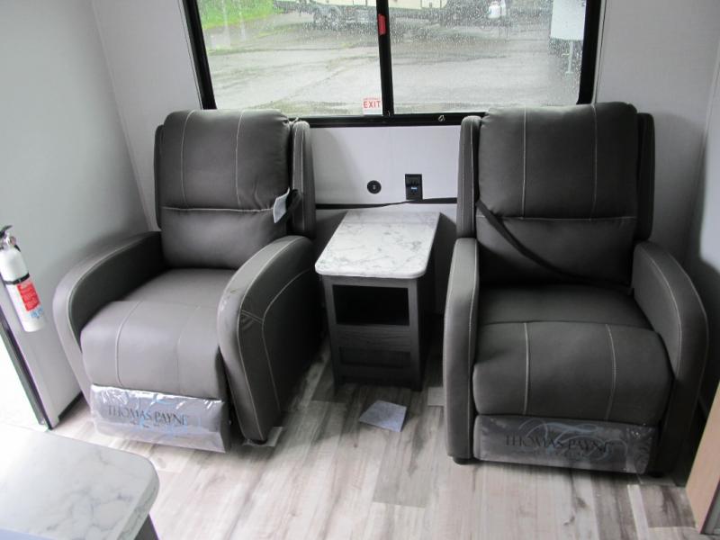 With dual entry doors, you can easily enter and exit this travel trailer! The jackknife sofa with footrest and booth dinette are next to each other near the fireplace, as well as two rear recliners allowing you to visit with other RVers or your family. The cook will have an oven and a microwave to make meals, and a 10 cu. ft. 12V refrigerator for cold items, plus a galley sink with high rise faucet to keep the dishes clean. Speaking of being clean, the full bathroom offers a shower with exhaust fan to eliminate unwanted steam as you clean yourself up after a fun day at the beach. The front private bedroom has a residential queen bed and one of the entrance/exit doors so you can slip out for an early morning fishing trip!