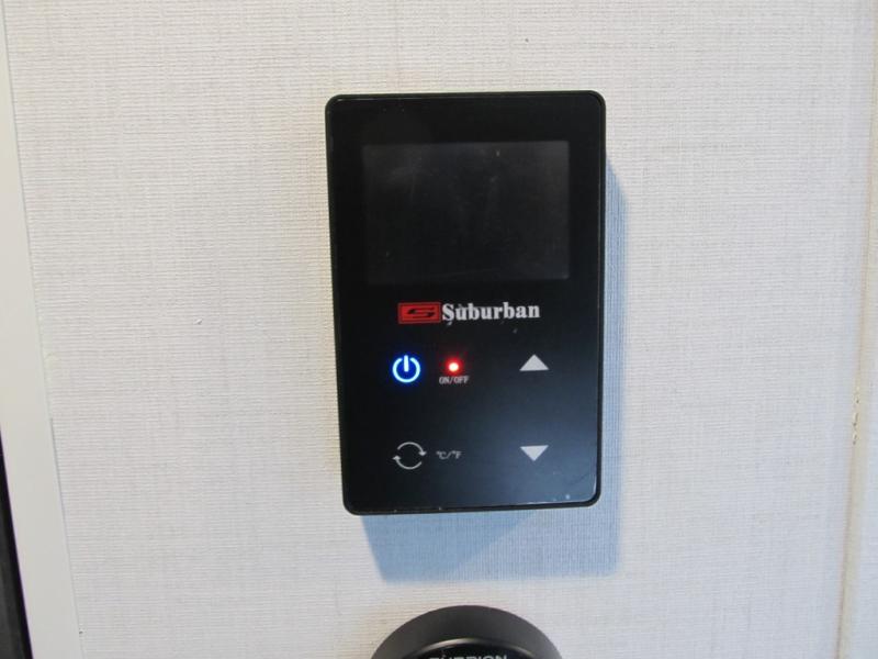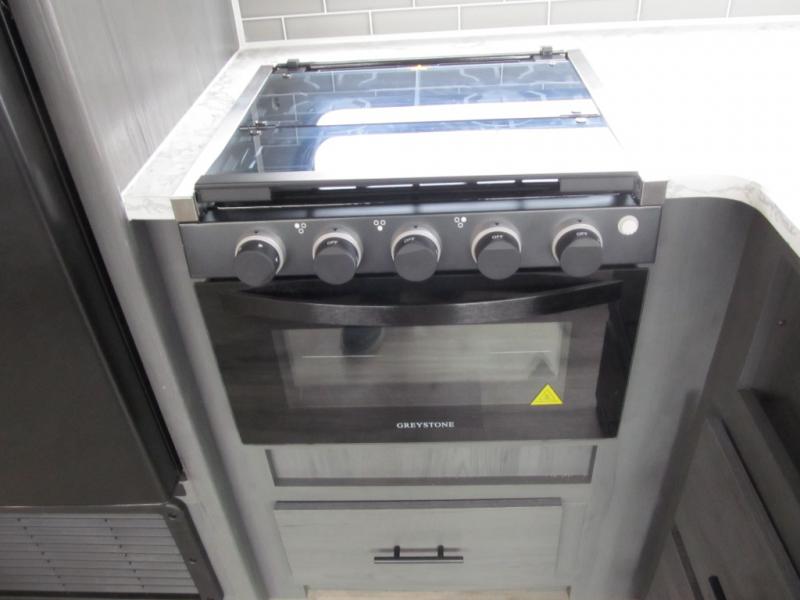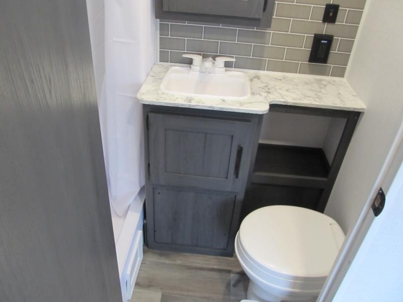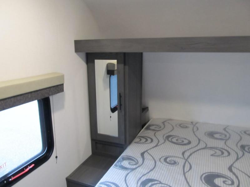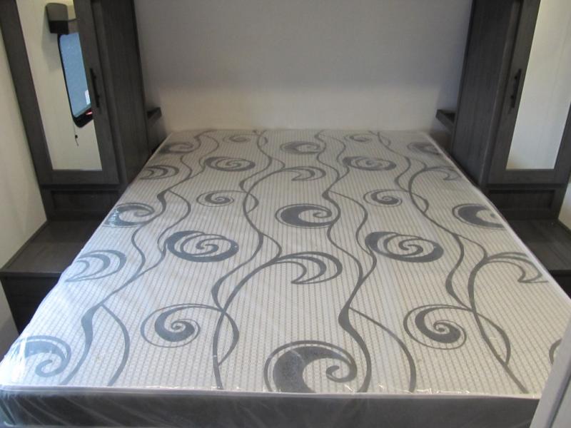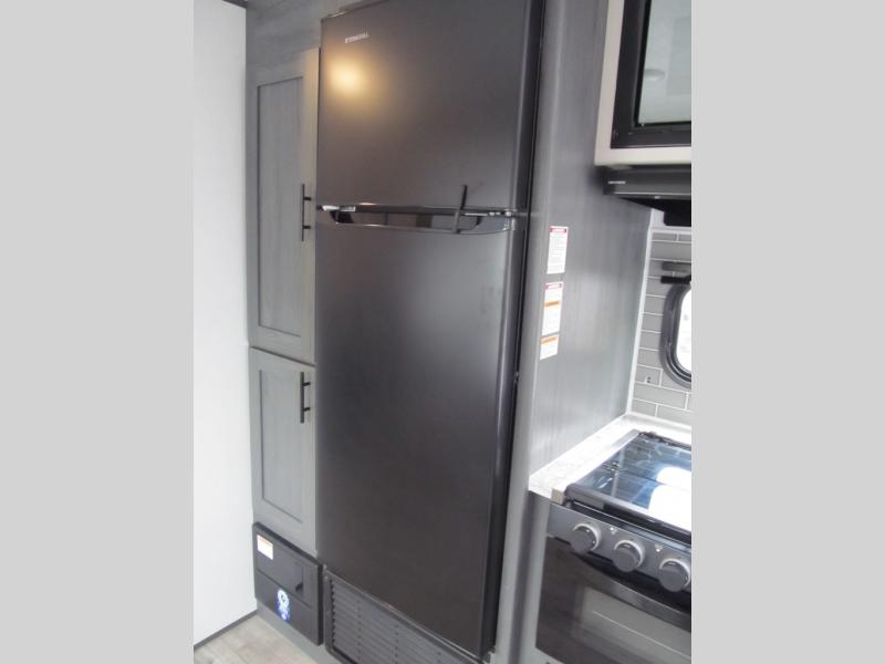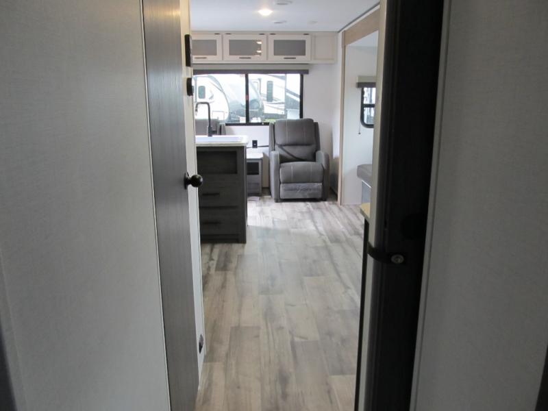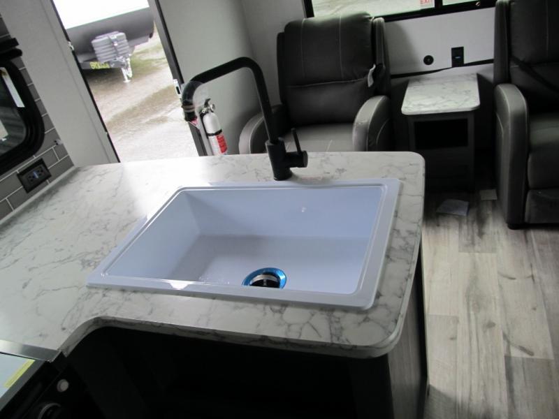 With dual entry doors, you can easily enter and exit this travel trailer! The jackknife sofa with footrest and booth dinette are next to each other near the fireplace, as well as two rear recliners allowing you to visit with other RVers or your family. The cook will have an oven and a microwave to make meals, and a 10 cu. ft. 12V refrigerator for cold items, plus a galley sink with high rise faucet to keep the dishes clean. Speaking of being clean, the full bathroom offers a shower with exhaust fan to eliminate unwanted steam as you clean yourself up after a fun day at the beach. The front private bedroom has a residential queen bed and one of the entrance/exit doors so you can slip out for an early morning fishing trip!