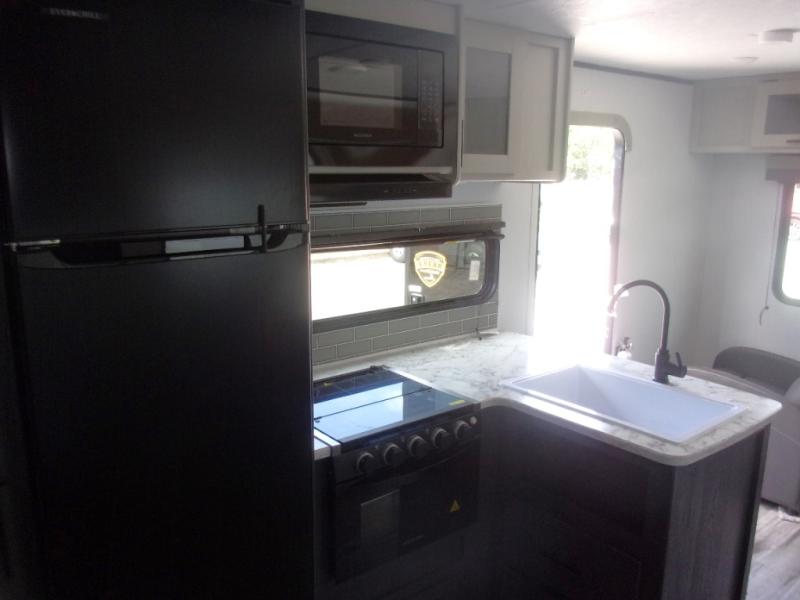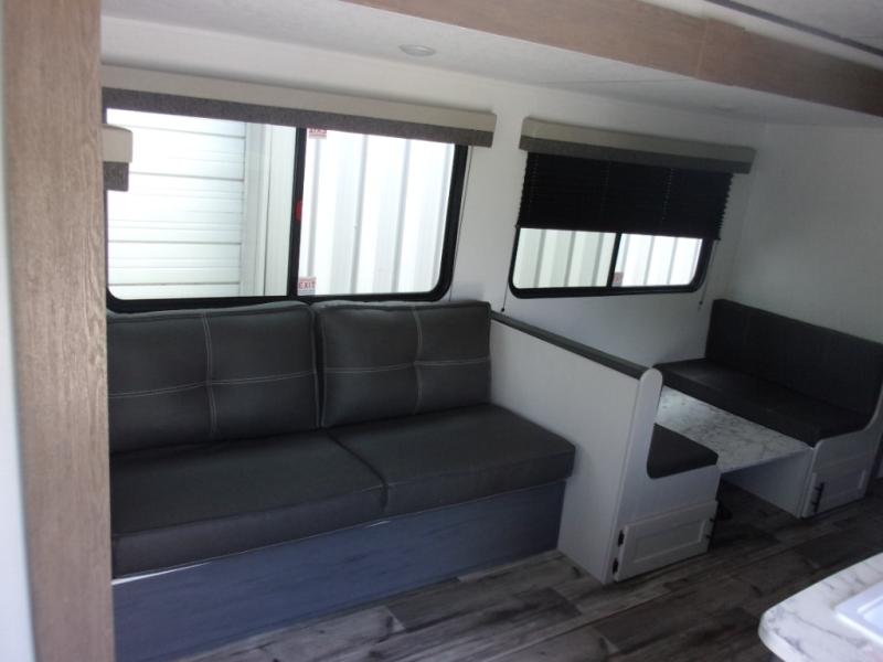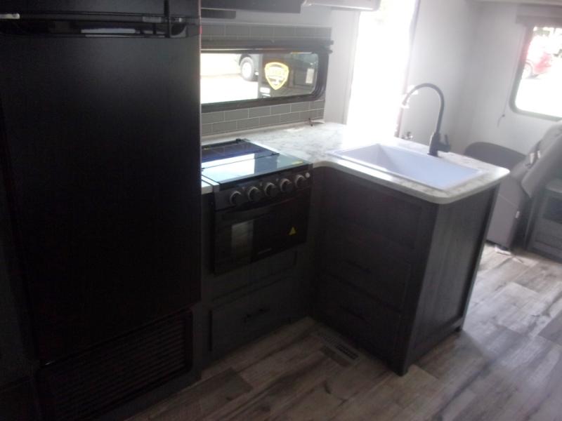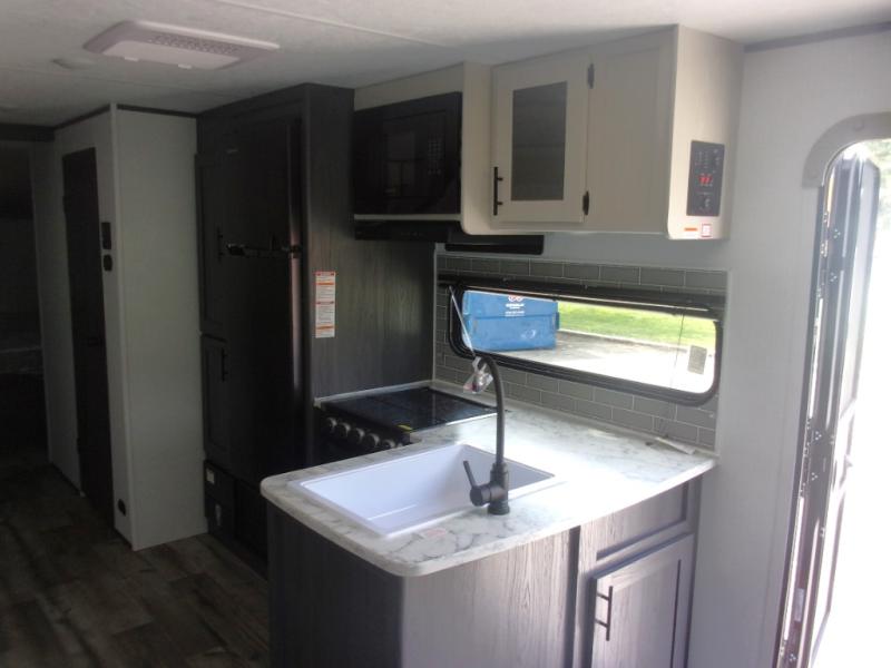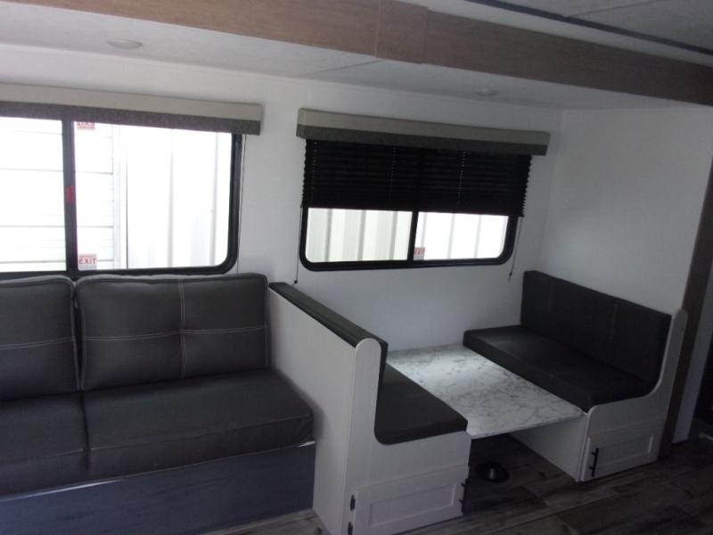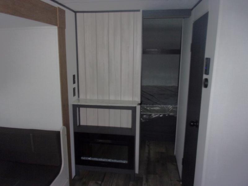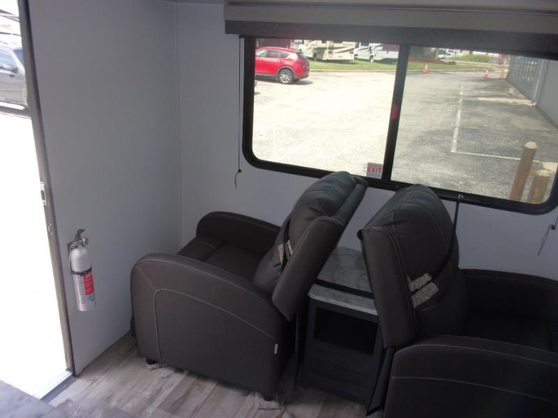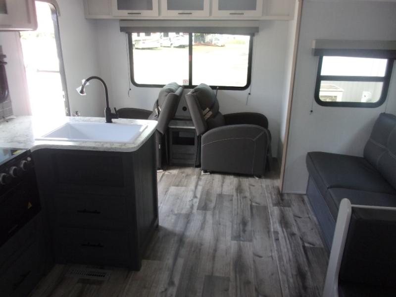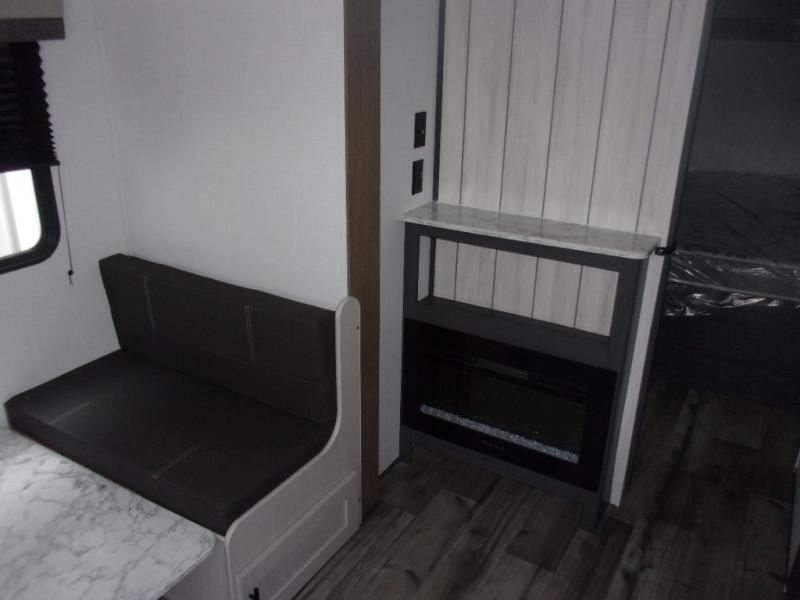 With dual entry doors, you can easily enter and exit this travel trailer! The jackknife sofa with footrest and booth dinette are next to each other near the fireplace, as well as two rear recliners allowing you to visit with other RVers or your family. The cook will have an oven and a microwave to make meals, and a 10 cu. ft. 12V refrigerator for cold items, plus a galley sink with high rise faucet to keep the dishes clean. Speaking of being clean, the full bathroom offers a shower with exhaust fan to eliminate unwanted steam as you clean yourself up after a fun day at the beach. The front private bedroom has a residential queen bed and one of the entrance/exit doors so you can slip out for an early morning fishing trip!