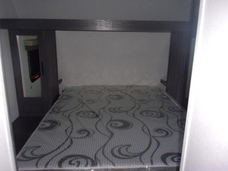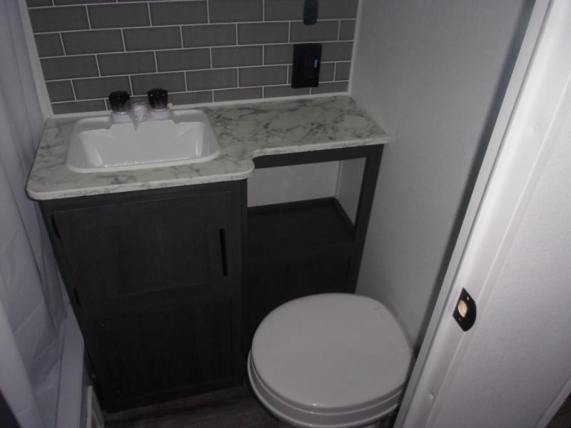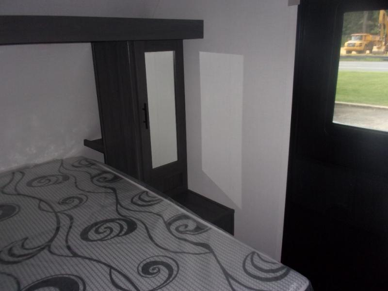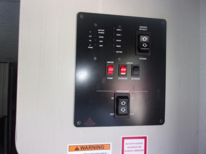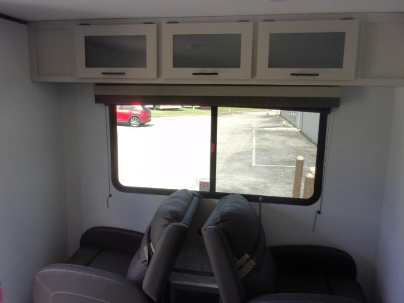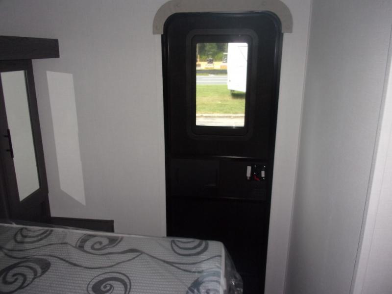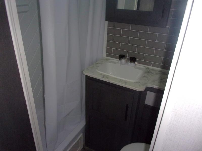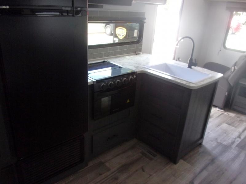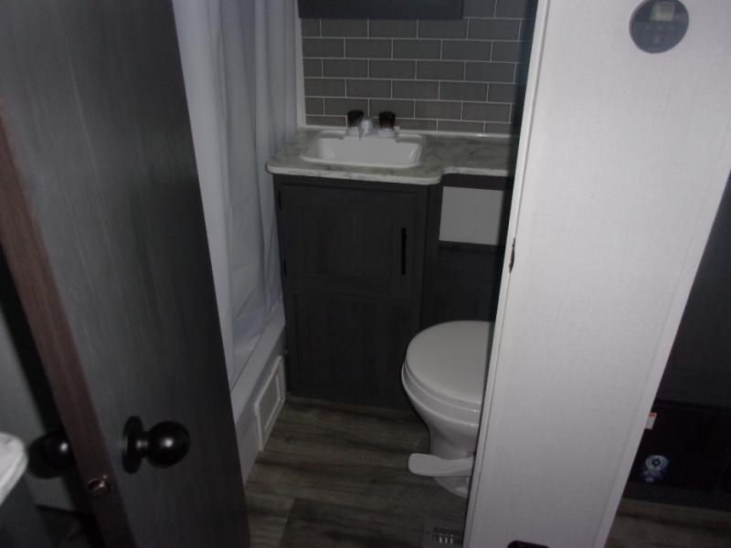 With dual entry doors, you can easily enter and exit this travel trailer! The jackknife sofa with footrest and booth dinette are next to each other near the fireplace, as well as two rear recliners allowing you to visit with other RVers or your family. The cook will have an oven and a microwave to make meals, and a 10 cu. ft. 12V refrigerator for cold items, plus a galley sink with high rise faucet to keep the dishes clean. Speaking of being clean, the full bathroom offers a shower with exhaust fan to eliminate unwanted steam as you clean yourself up after a fun day at the beach. The front private bedroom has a residential queen bed and one of the entrance/exit doors so you can slip out for an early morning fishing trip!