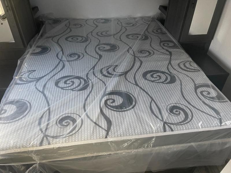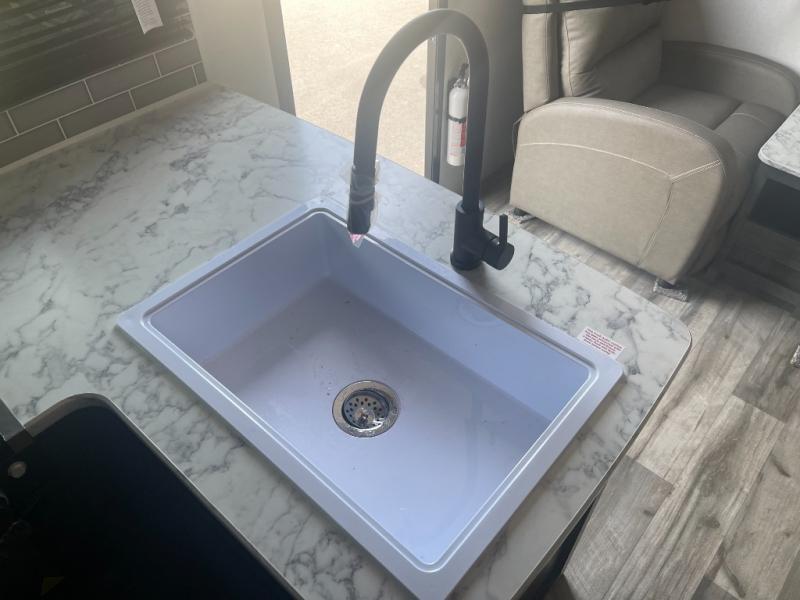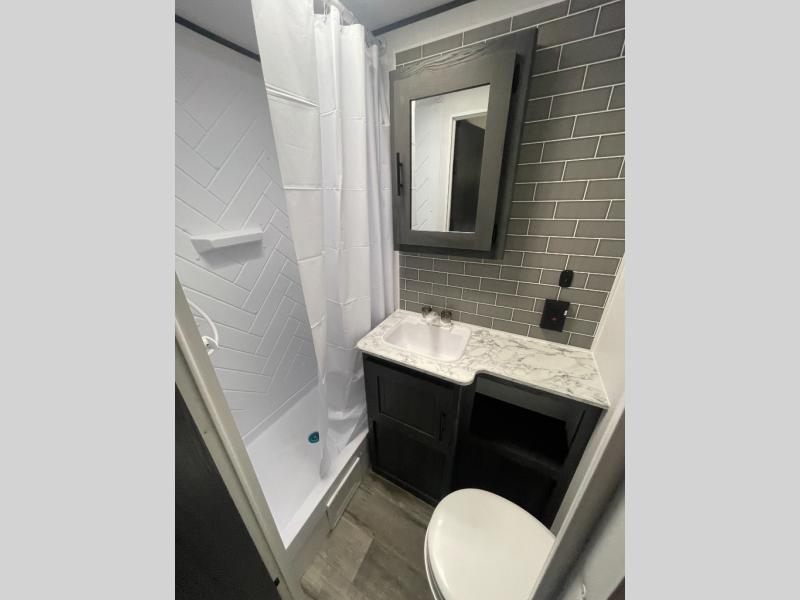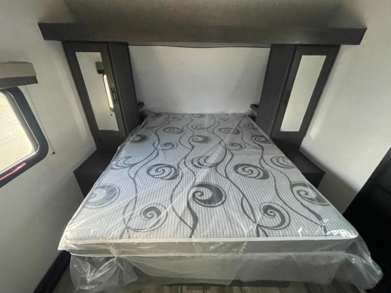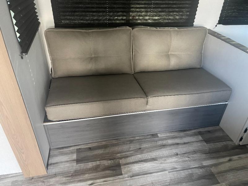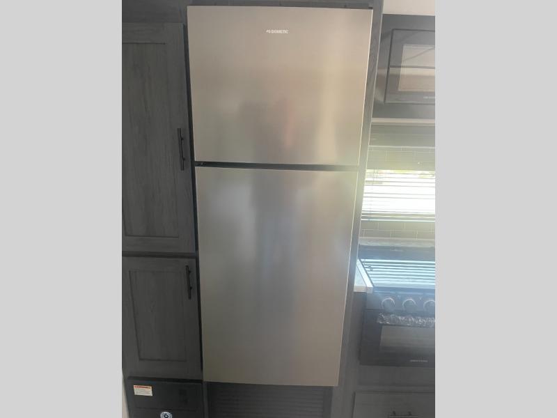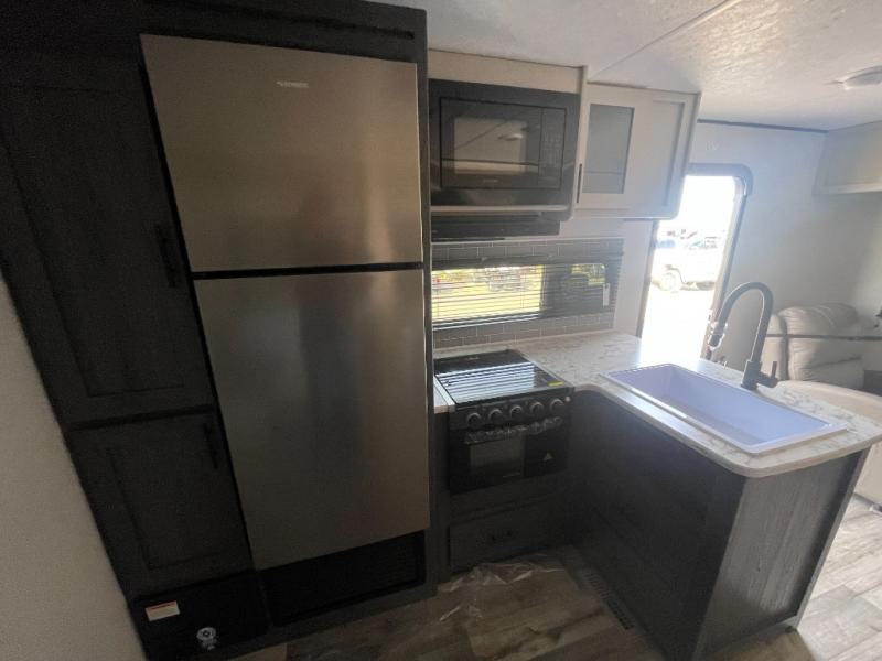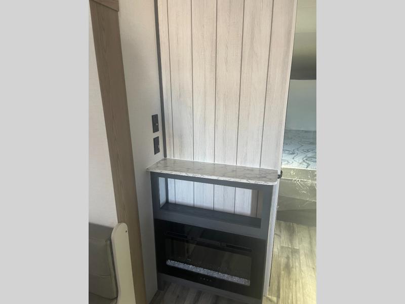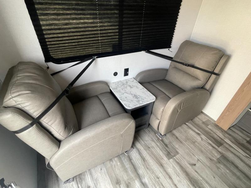 With dual entry doors, you can easily enter and exit this travel trailer! The jackknife sofa with footrest and booth dinette are next to each other near the fireplace, as well as two rear recliners allowing you to visit with other RVers or your family. The cook will have an oven and a microwave to make meals, and a 10 cu. ft. 12V refrigerator for cold items, plus a galley sink with high rise faucet to keep the dishes clean. Speaking of being clean, the full bathroom offers a shower with exhaust fan to eliminate unwanted steam as you clean yourself up after a fun day at the beach. The front private bedroom has a residential queen bed and one of the entrance/exit doors so you can slip out for an early morning fishing trip!