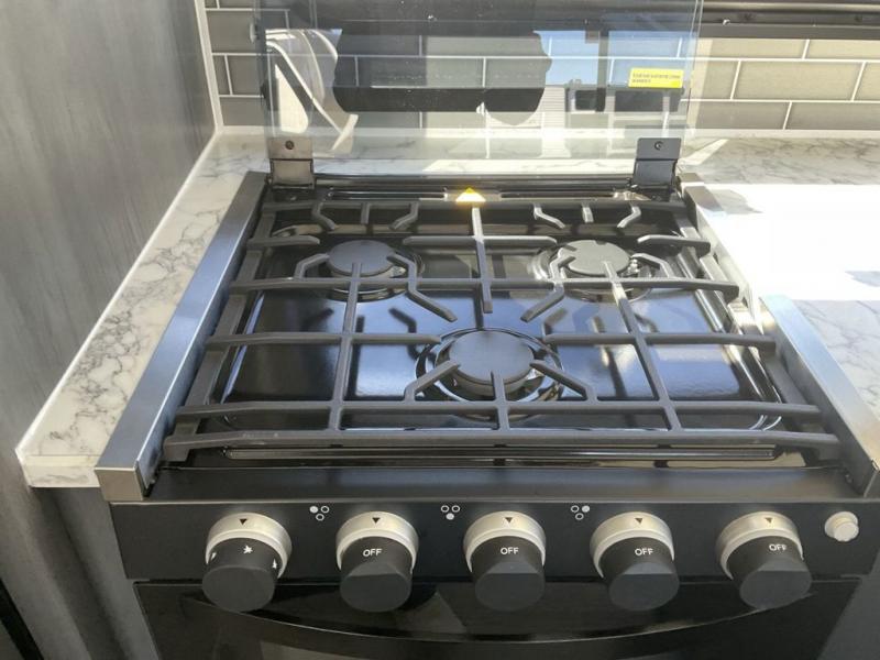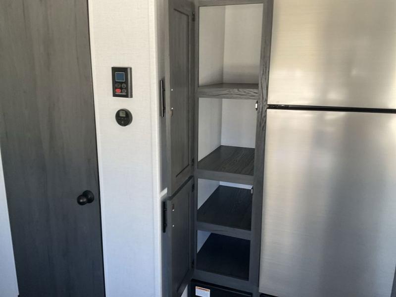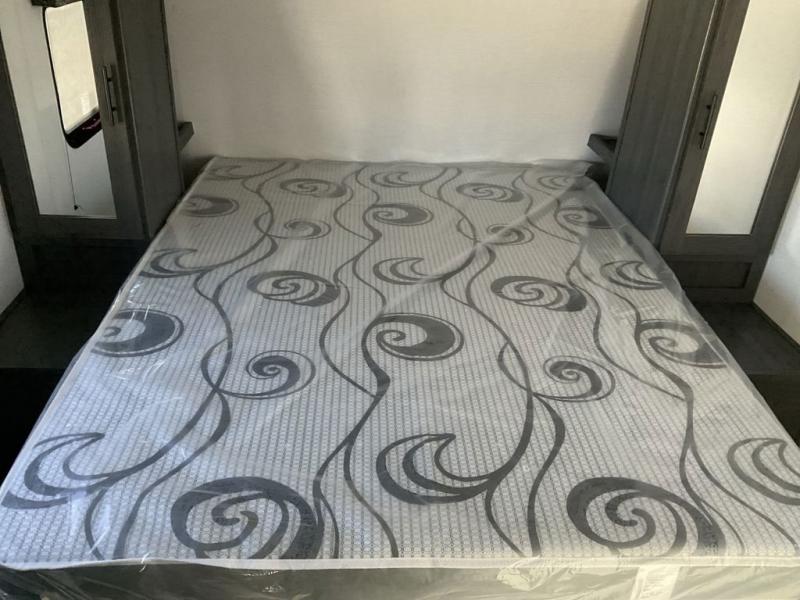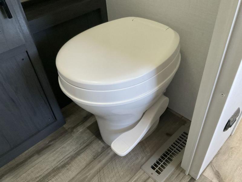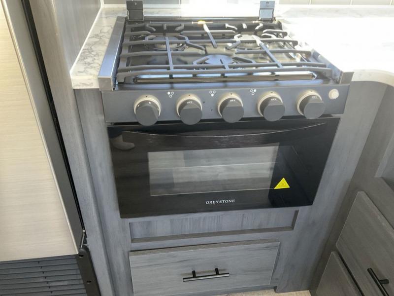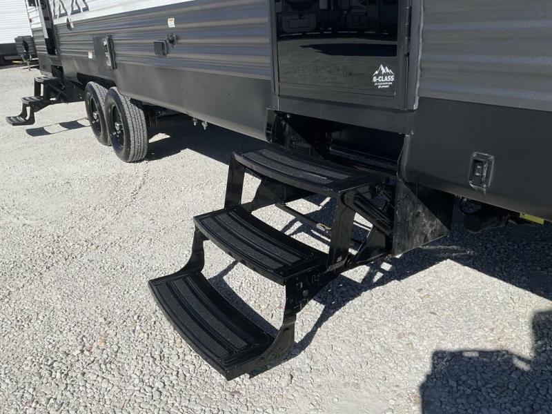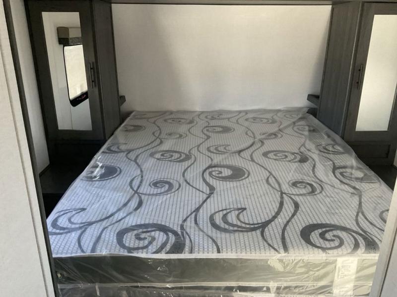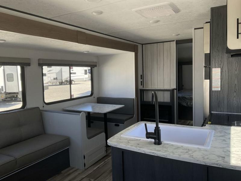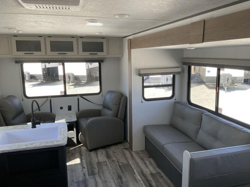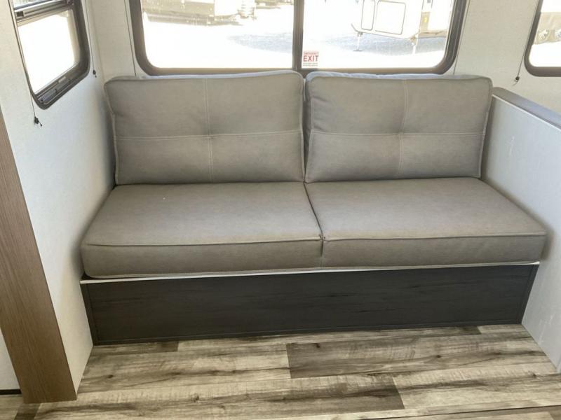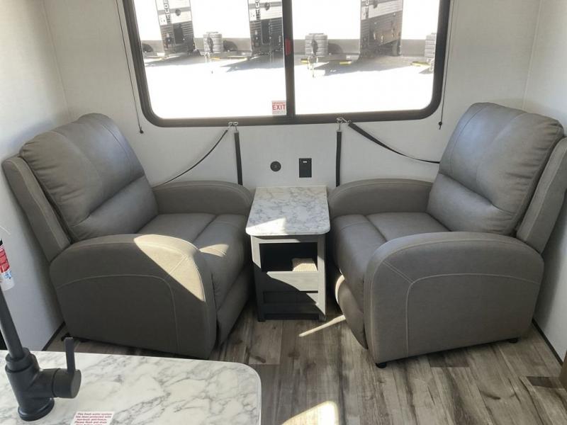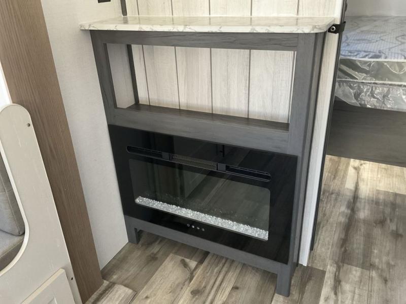 With dual entry doors, you can easily enter and exit this travel trailer! The jackknife sofa with footrest and booth dinette are next to each other near the fireplace, as well as two rear recliners allowing you to visit with other RVers or your family. The cook will have an oven and a microwave to make meals, and a 10 cu. ft. 12V refrigerator for cold items, plus a galley sink with high rise faucet to keep the dishes clean. Speaking of being clean, the full bathroom offers a shower with exhaust fan to eliminate unwanted steam as you clean yourself up after a fun day at the beach. The front private bedroom has a residential queen bed and one of the entrance/exit doors so you can slip out for an early morning fishing trip!
