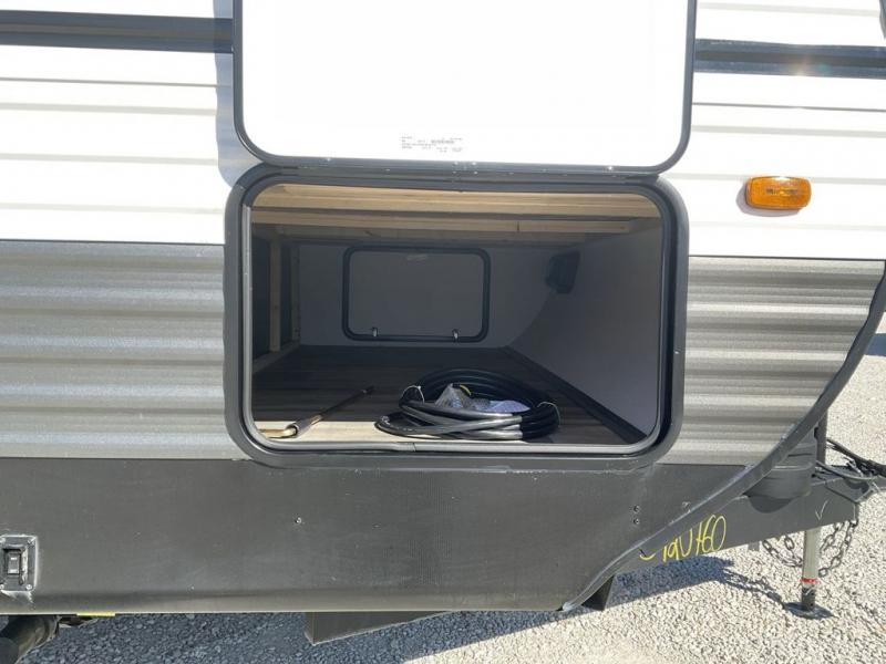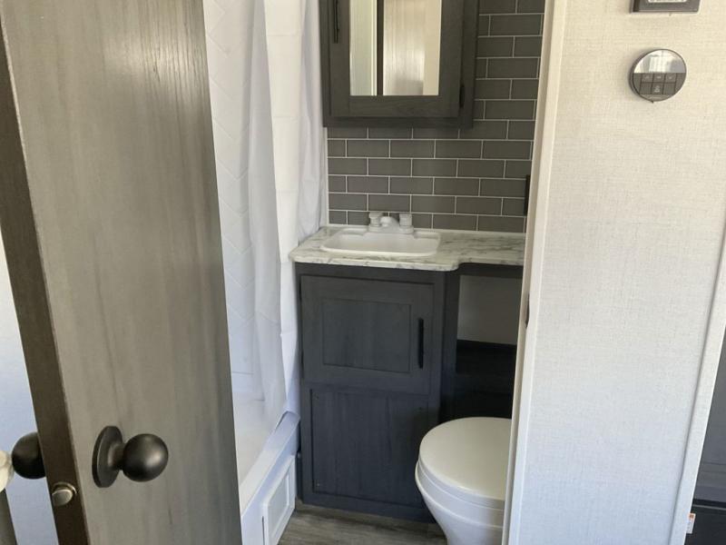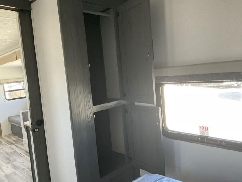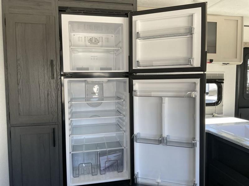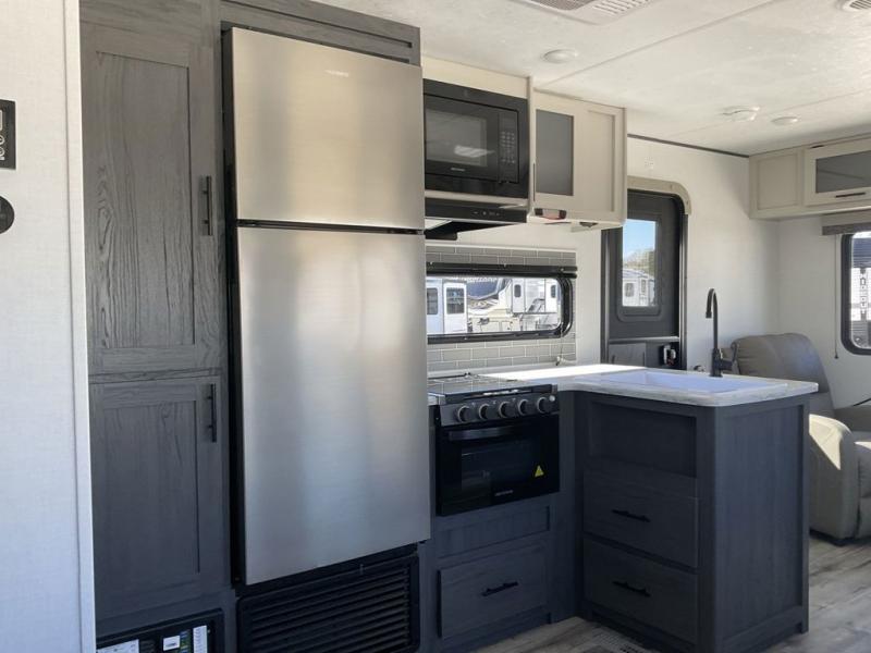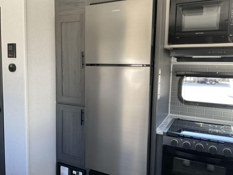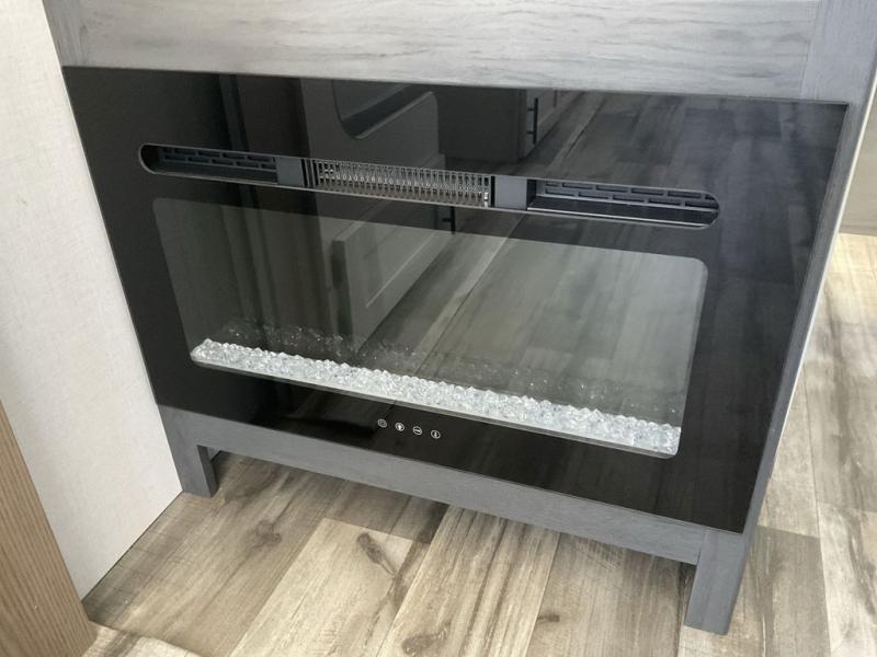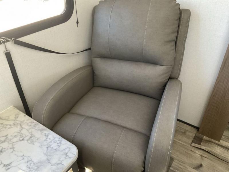With dual entry doors, you can easily enter and exit this travel trailer! The jackknife sofa with footrest and booth dinette are next to each other near the fireplace, as well as two rear recliners allowing you to visit with other RVers or your family. The cook will have an oven and a microwave to make meals, and a 10 cu. ft. 12V refrigerator for cold items, plus a galley sink with high rise faucet to keep the dishes clean. Speaking of being clean, the full bathroom offers a shower with exhaust fan to eliminate unwanted steam as you clean yourself up after a fun day at the beach. The front private bedroom has a residential queen bed and one of the entrance/exit doors so you can slip out for an early morning fishing trip!