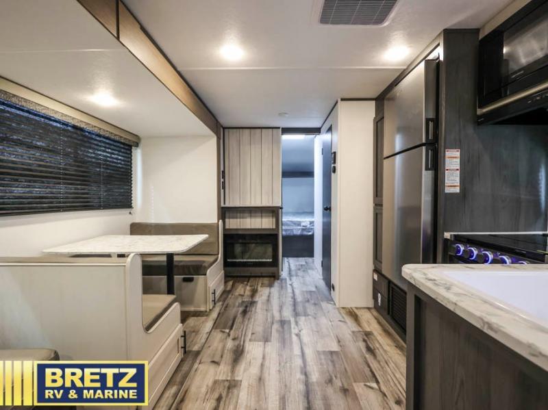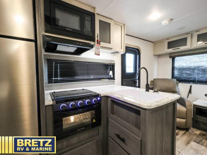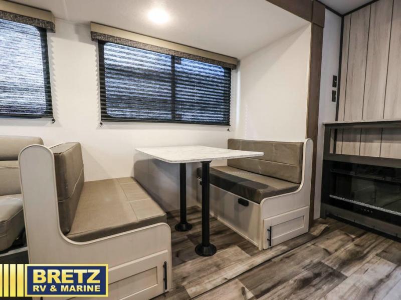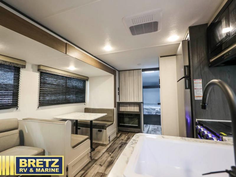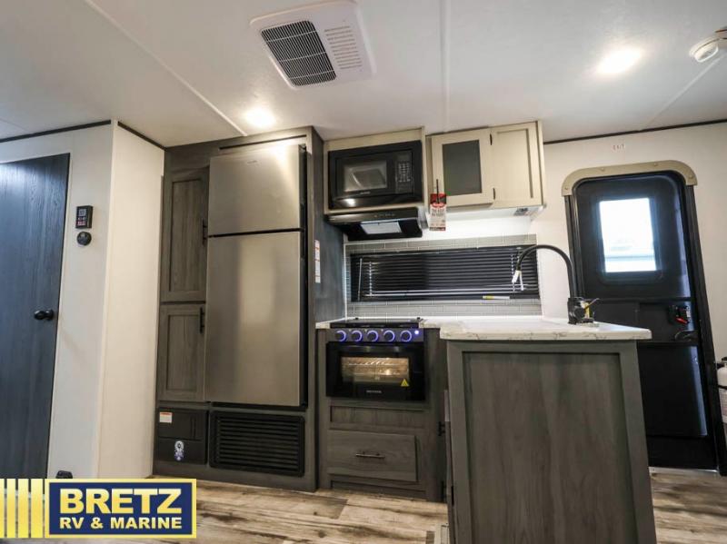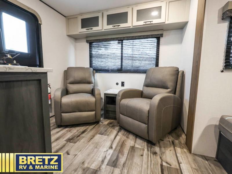With dual entry doors, you can easily enter and exit this travel trailer! The jackknife sofa with footrest and booth dinette are next to each other near the fireplace, as well as two rear recliners allowing you to visit with other RVers or your family. The cook will have an oven and a microwave to make meals, and a 10 cu. ft. 12V refrigerator for cold items, plus a galley sink with high rise faucet to keep the dishes clean. Speaking of being clean, the full bathroom offers a shower with exhaust fan to eliminate unwanted steam as you clean yourself up after a fun day at the beach. The front private bedroom has a residential queen bed and one of the entrance/exit doors so you can slip out for an early morning fishing trip!