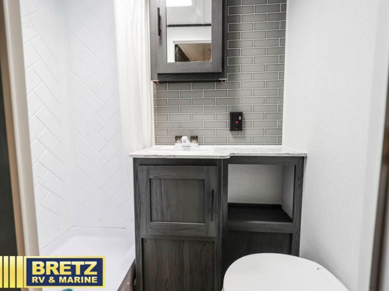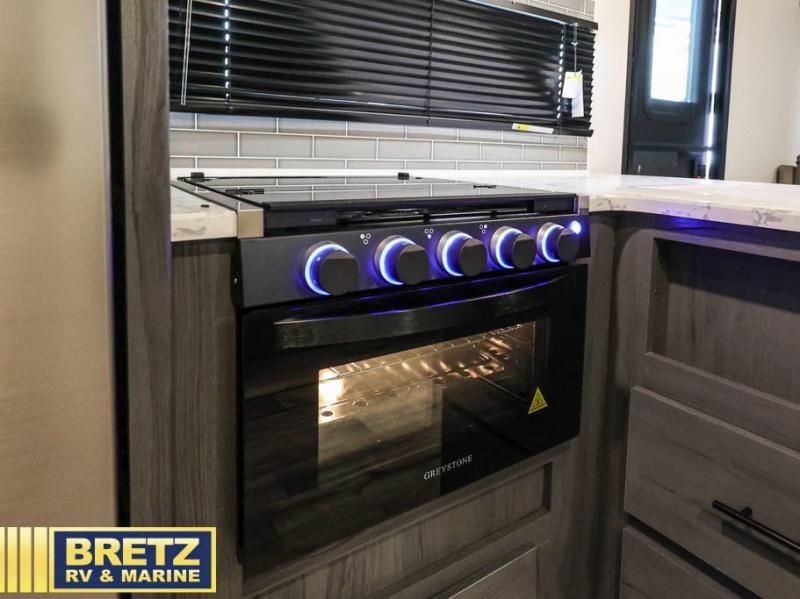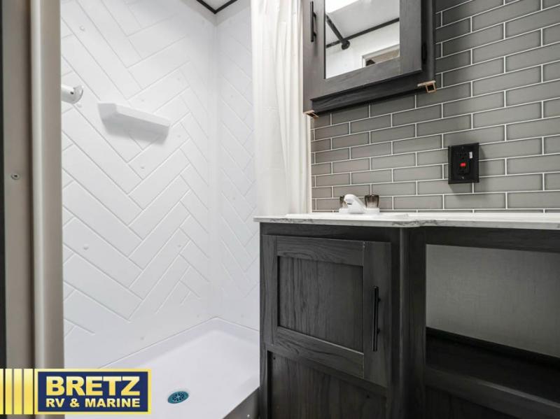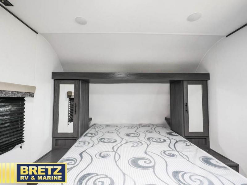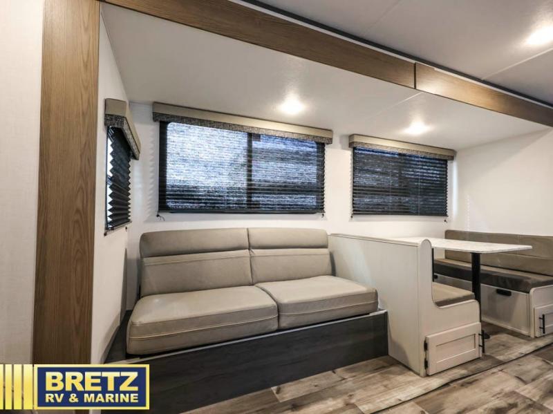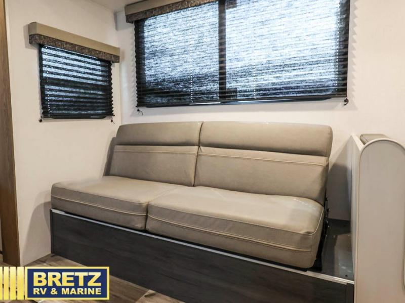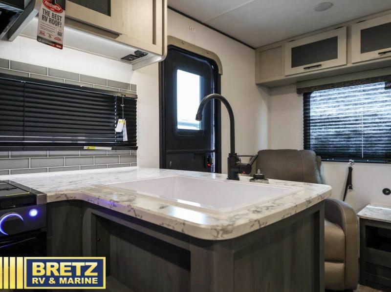 With dual entry doors, you can easily enter and exit this travel trailer! The jackknife sofa with footrest and booth dinette are next to each other near the fireplace, as well as two rear recliners allowing you to visit with other RVers or your family. The cook will have an oven and a microwave to make meals, and a 10 cu. ft. 12V refrigerator for cold items, plus a galley sink with high rise faucet to keep the dishes clean. Speaking of being clean, the full bathroom offers a shower with exhaust fan to eliminate unwanted steam as you clean yourself up after a fun day at the beach. The front private bedroom has a residential queen bed and one of the entrance/exit doors so you can slip out for an early morning fishing trip!