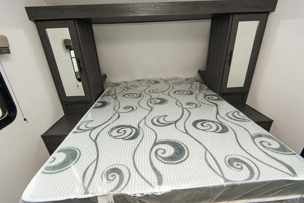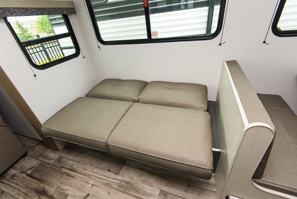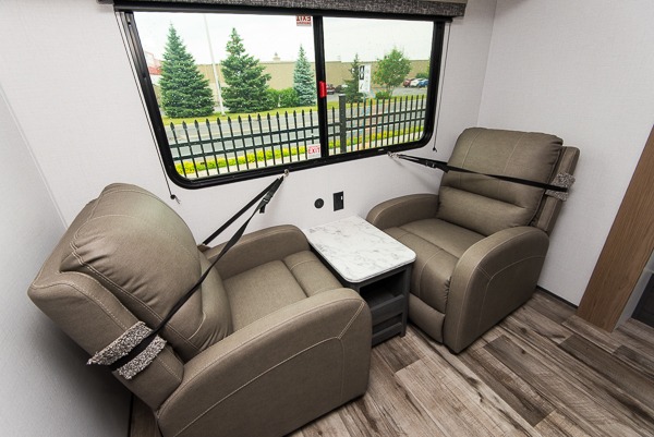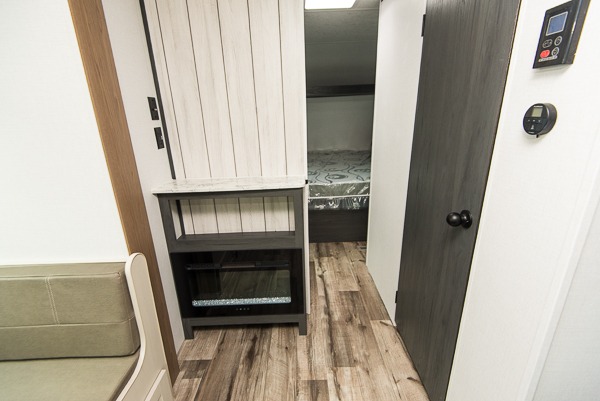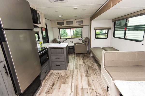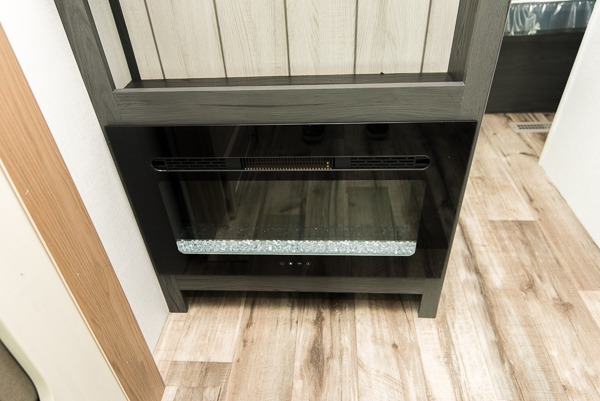 With dual entry doors, you can easily enter and exit this travel trailer! The jackknife sofa with footrest and booth dinette are next to each other near the fireplace, as well as two rear recliners allowing you to visit with other RVers or your family. The cook will have an oven and a microwave to make meals, and a 10 cu. ft. 12V refrigerator for cold items, plus a galley sink with high rise faucet to keep the dishes clean. Speaking of being clean, the full bathroom offers a shower with exhaust fan to eliminate unwanted steam as you clean yourself up after a fun day at the beach. The front private bedroom has a residential queen bed and one of the entrance/exit doors so you can slip out for an early morning fishing trip!