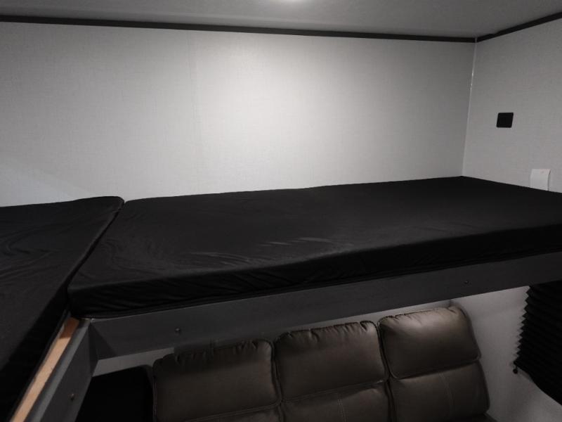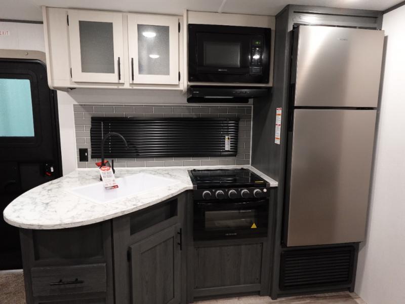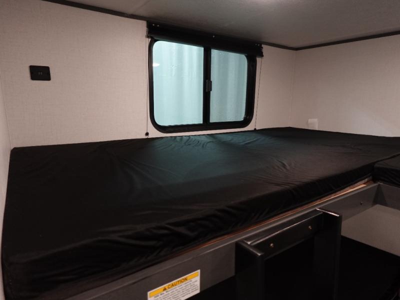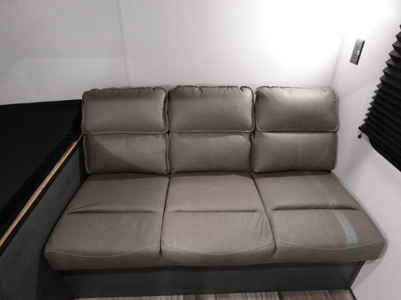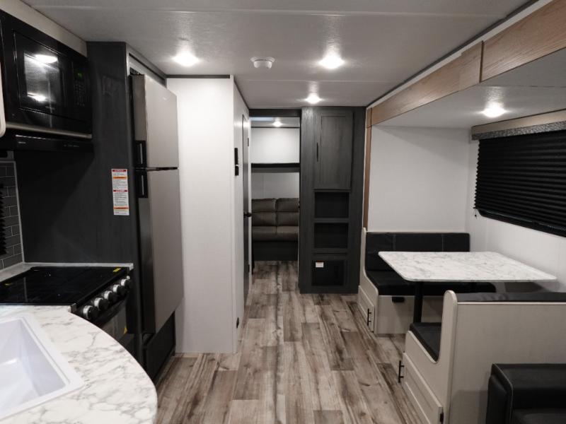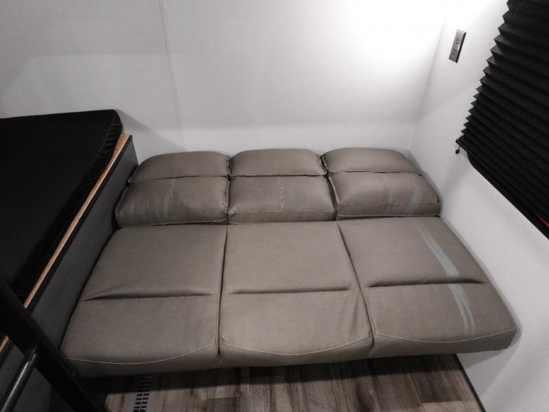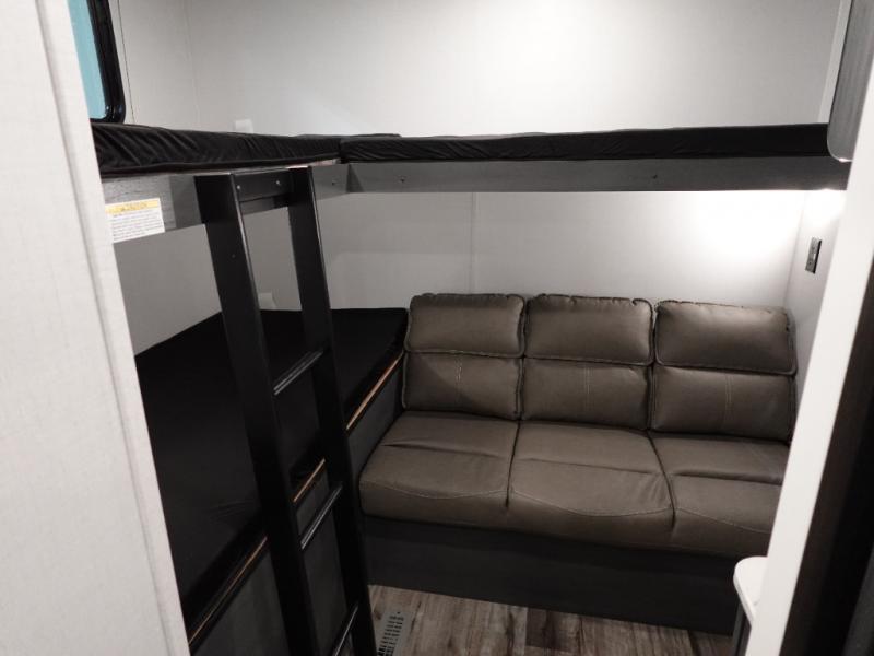 The private bunkhouse might be the main reason you chose this trailer or maybe it was the spacious interior, either way you will enjoy camping with your family and friends every chance you get. The bunkhouse offers triple bunk beds and a sofa, allowing four people to sleep in privacy. You will have your own bedroom up front to sleep on a residential queen bed with dual access, closets and windows to enjoy the campsite view. The full bathroom offers convenience, and the large slide out offers more floor space to move about. There is a booth dinette and jackknife sofa to relax on as well as provide more sleeping space for friends and family. The cook will have full amenities including a three burner range top, a galley sink with high rise faucet, plus a 10 cu. ft. 12V refrigerator to store the cold items.