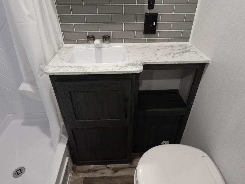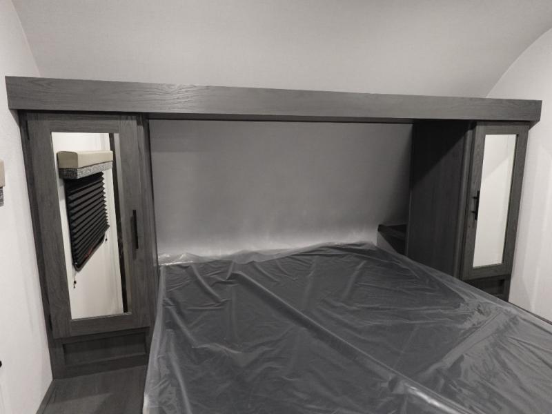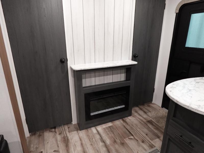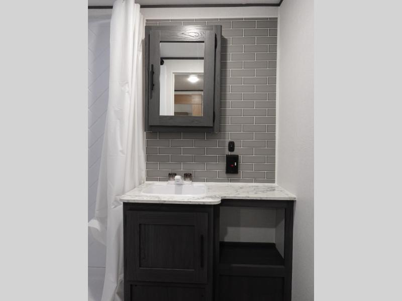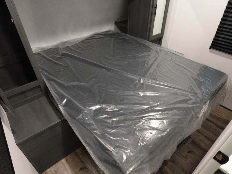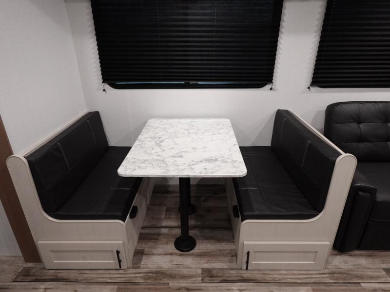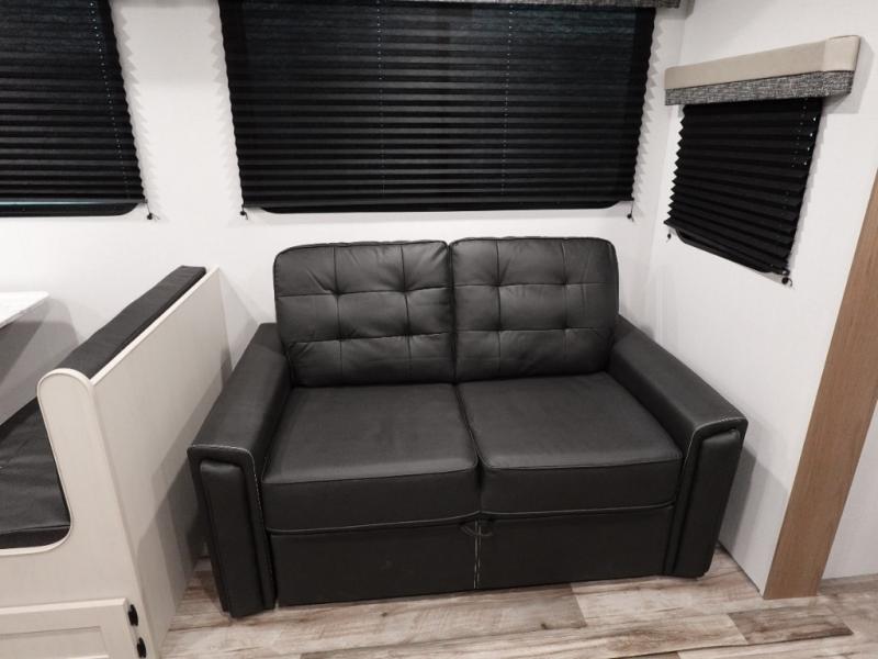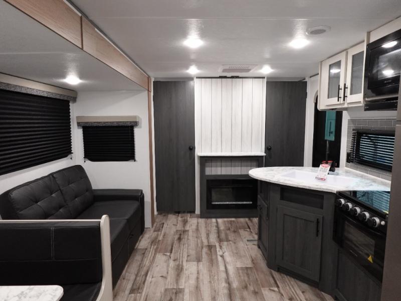The private bunkhouse might be the main reason you chose this trailer or maybe it was the spacious interior, either way you will enjoy camping with your family and friends every chance you get. The bunkhouse offers triple bunk beds and a sofa, allowing four people to sleep in privacy. You will have your own bedroom up front to sleep on a residential queen bed with dual access, closets and windows to enjoy the campsite view. The full bathroom offers convenience, and the large slide out offers more floor space to move about. There is a booth dinette and jackknife sofa to relax on as well as provide more sleeping space for friends and family. The cook will have full amenities including a three burner range top, a galley sink with high rise faucet, plus a 10 cu. ft. 12V refrigerator to store the cold items.