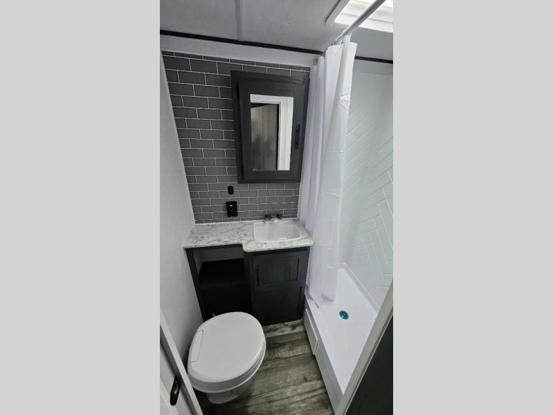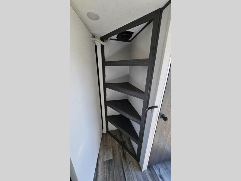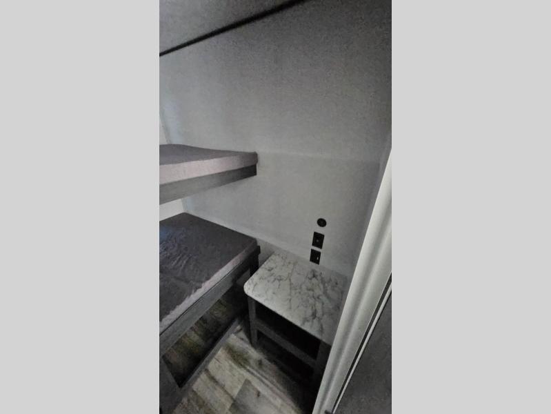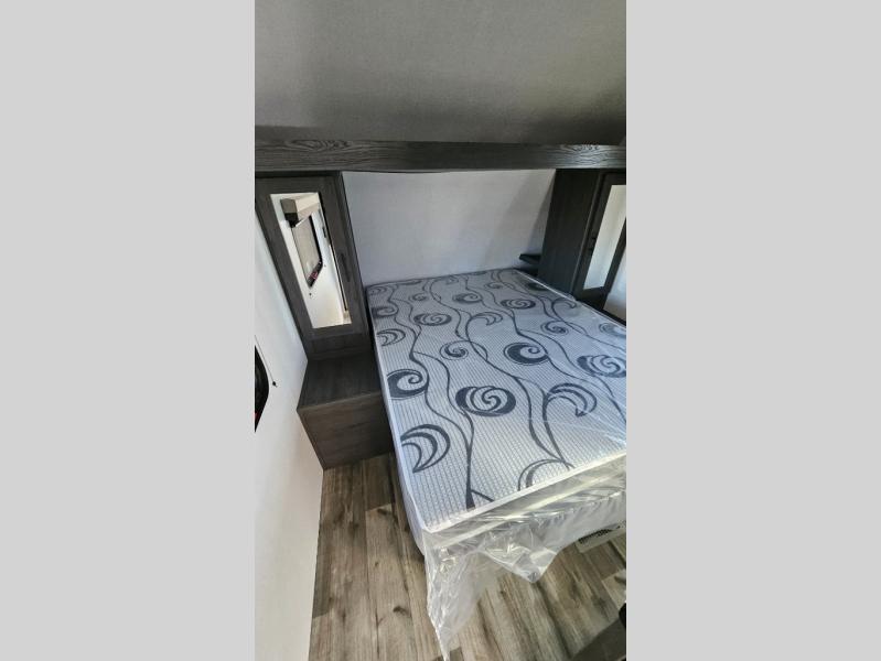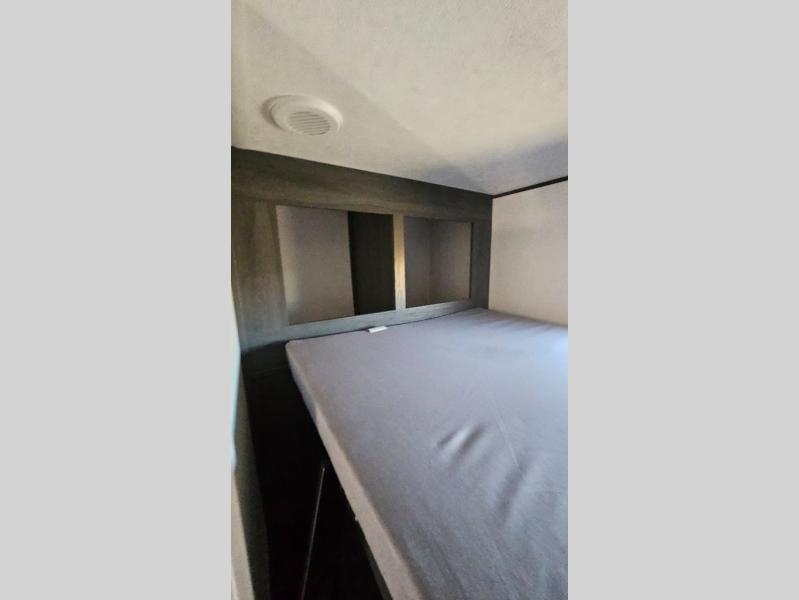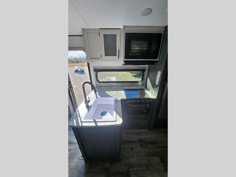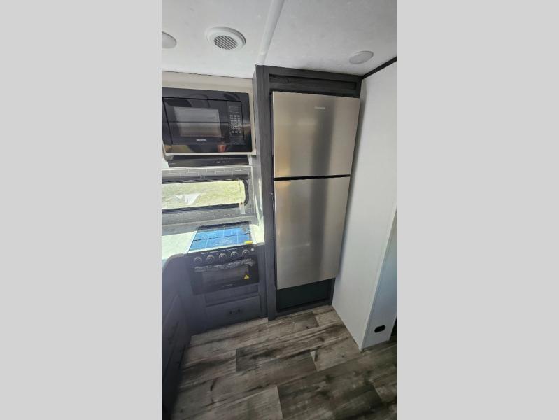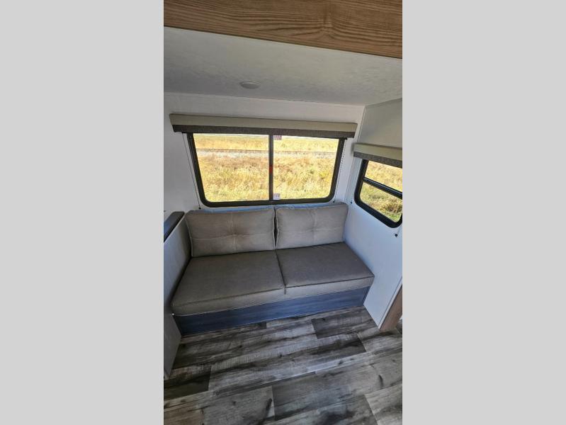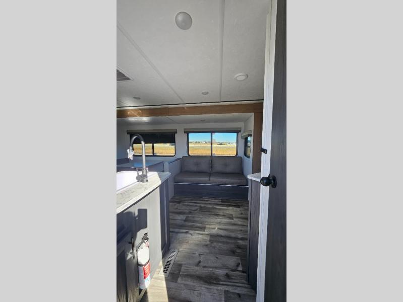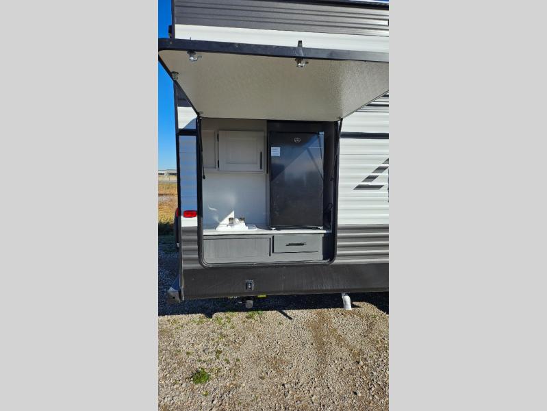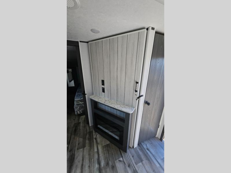 This travel trailer is one your whole crew will love! There is a rear private bunkhouse with double-size bunks for the little ones, a front private bedroom for you, and a booth dinette and jackknife sofa for even more sleeping space! The chef has their choice to cook indoors on the three burner range and microwave oven, or head outdoors to cook on the outdoor kitchen! The full bath will let everyone clean up each day, and the fireplace and large slide out will make your space feel more like home. And don't overlook the pass-through storage and 16' power awning with LED lights!