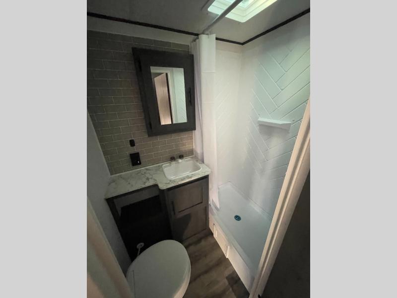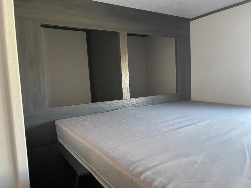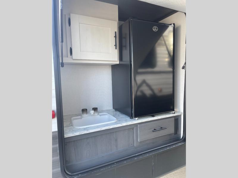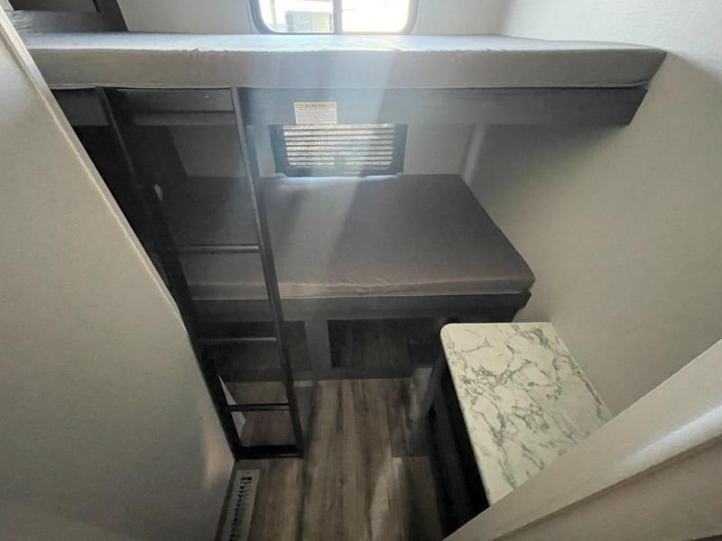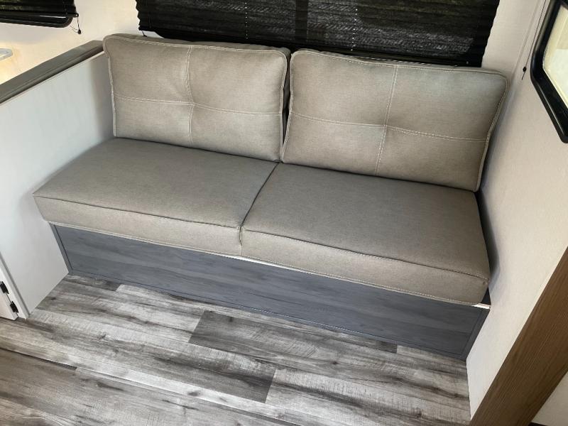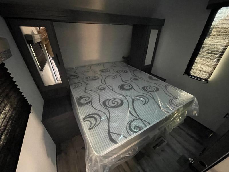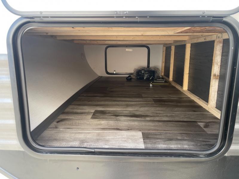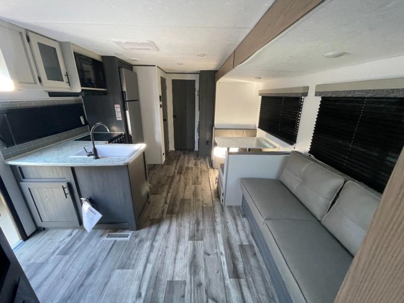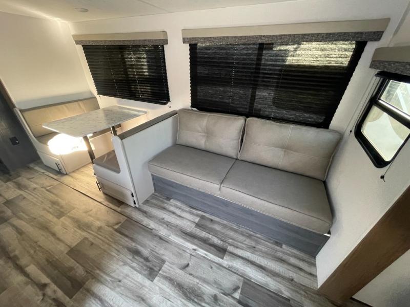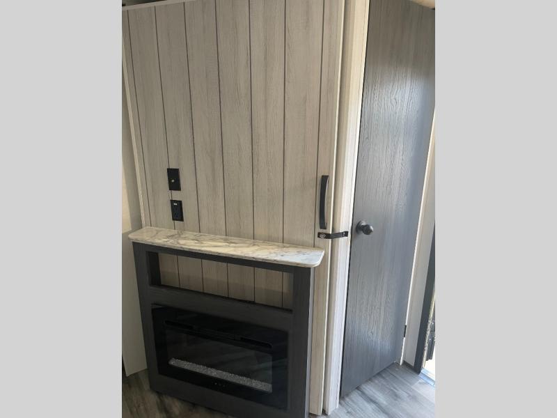 This travel trailer is one your whole crew will love! There is a rear private bunkhouse with double-size bunks for the little ones, a front private bedroom for you, and a booth dinette and jackknife sofa for even more sleeping space! The chef has their choice to cook indoors on the three burner range and microwave oven, or head outdoors to cook on the outdoor kitchen! The full bath will let everyone clean up each day, and the fireplace and large slide out will make your space feel more like home. And don't overlook the pass-through storage and 16' power awning with LED lights!