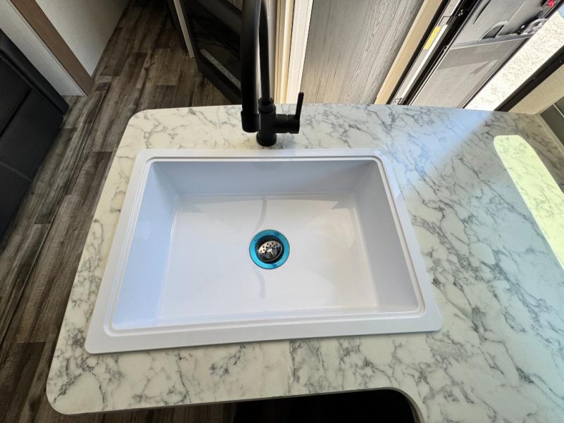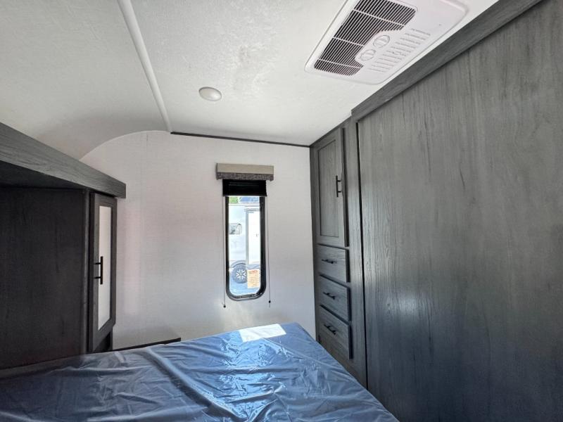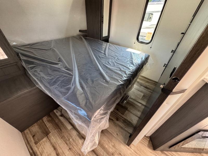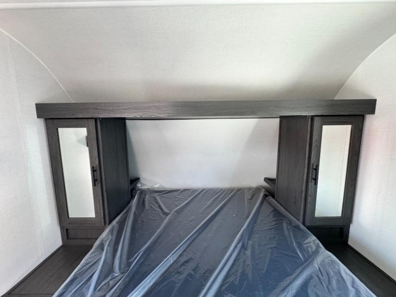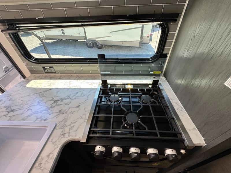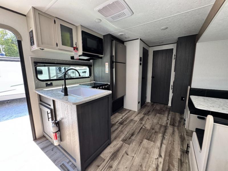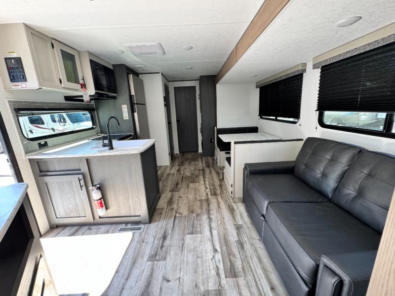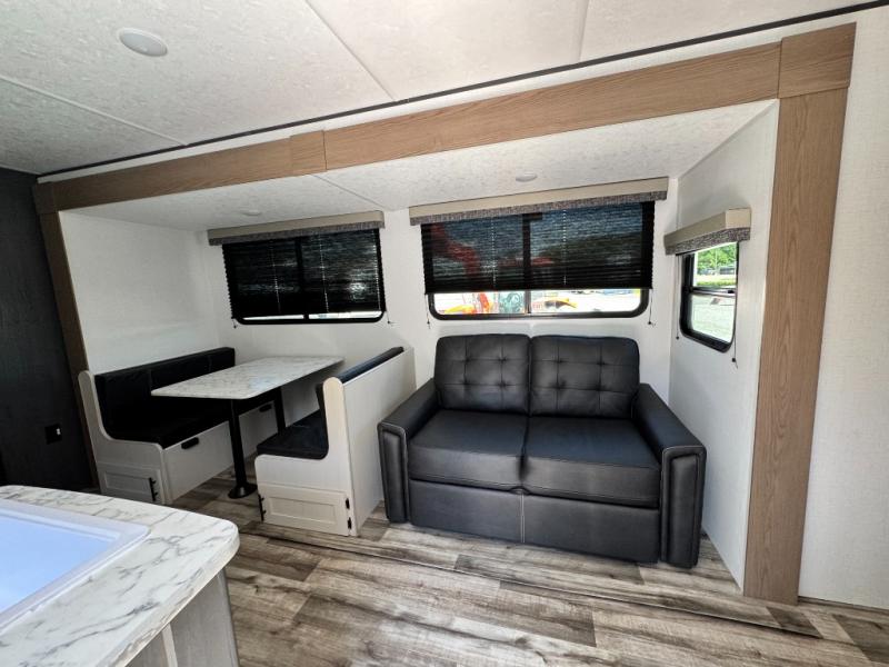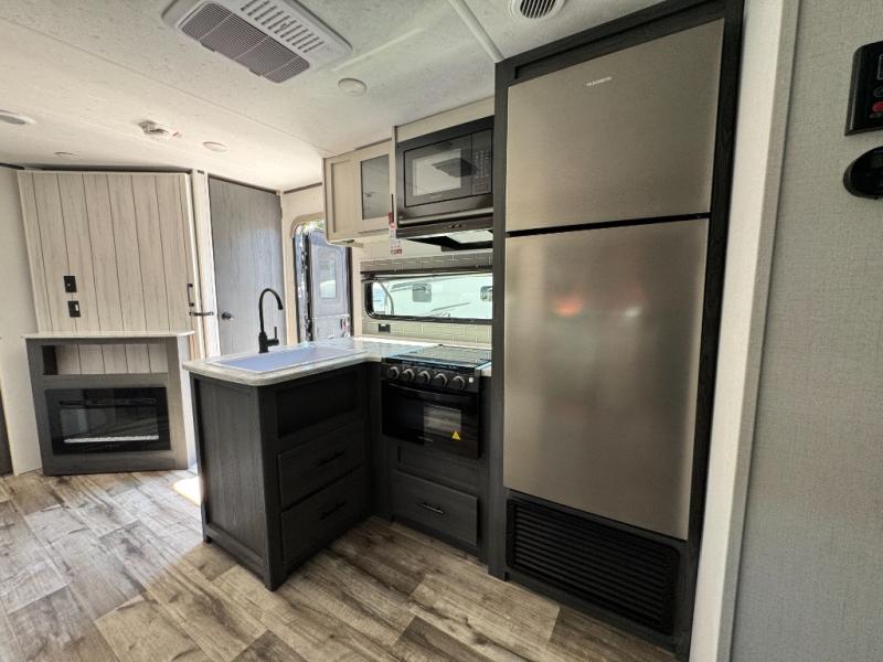 This travel trailer is one your whole crew will love! There is a rear private bunkhouse with double-size bunks for the little ones, a front private bedroom for you, and a booth dinette and jackknife sofa for even more sleeping space! The chef has their choice to cook indoors on the three burner range and microwave oven, or head outdoors to cook on the outdoor kitchen! The full bath will let everyone clean up each day, and the fireplace and large slide out will make your space feel more like home. And don't overlook the pass-through storage and 16' power awning with LED lights!