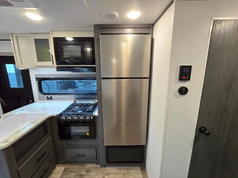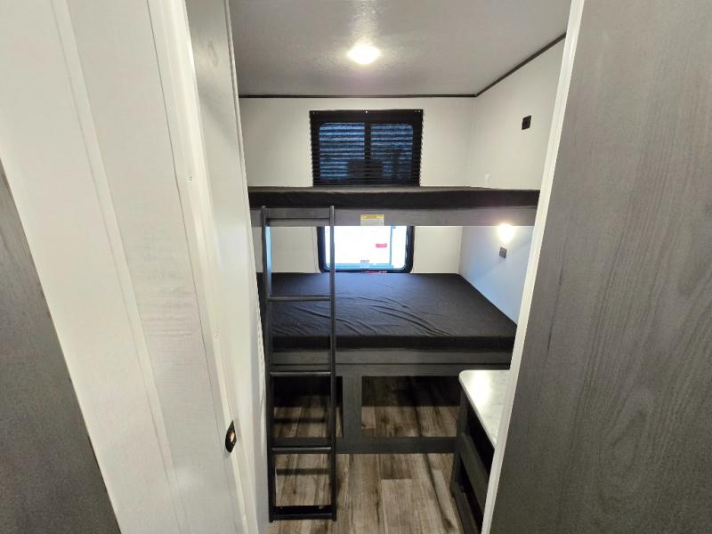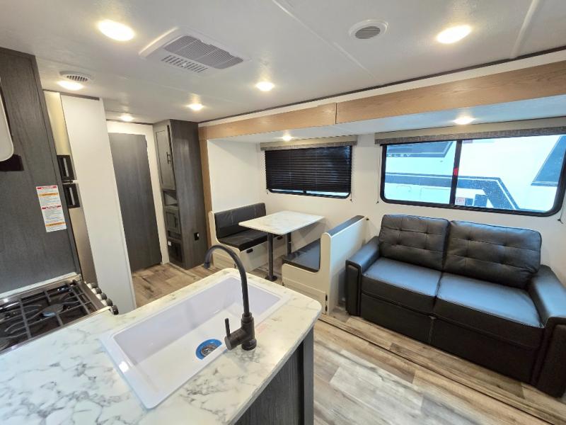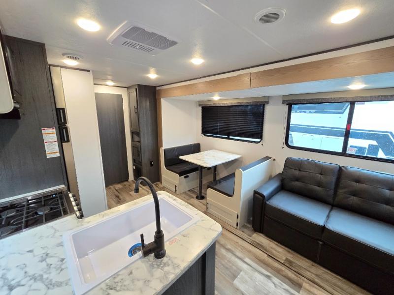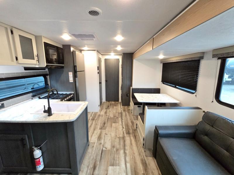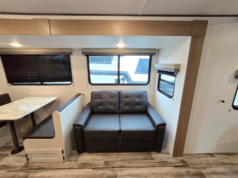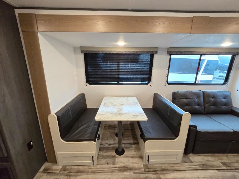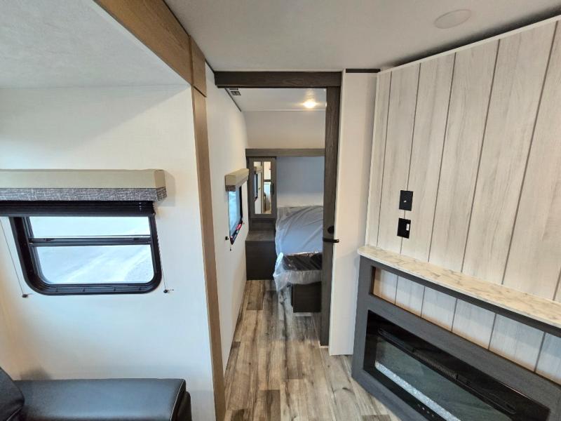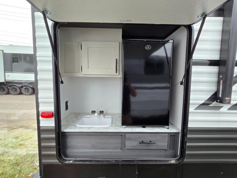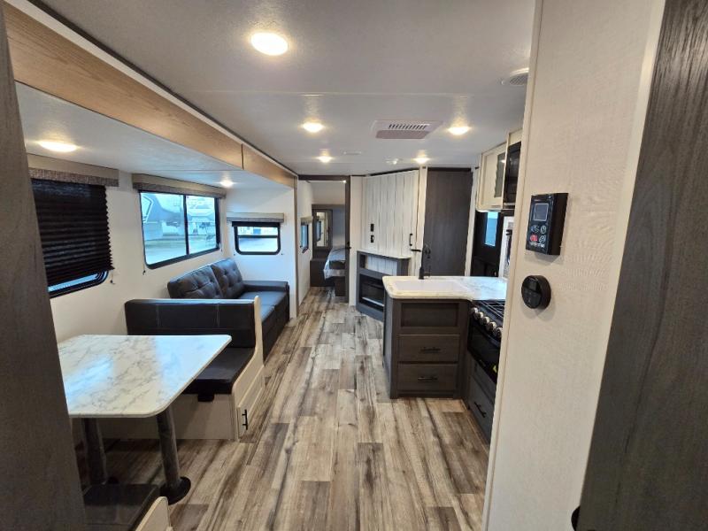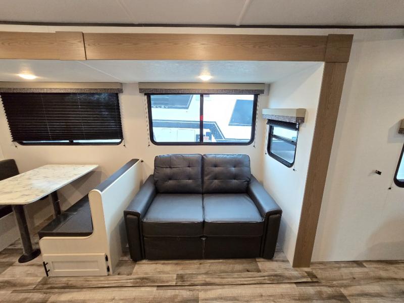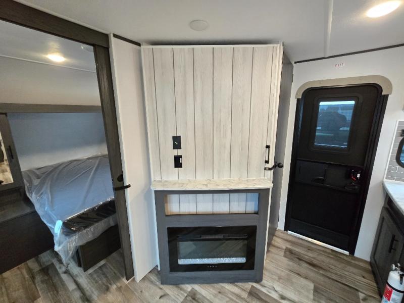 This travel trailer is one your whole crew will love! There is a rear private bunkhouse with double-size bunks for the little ones, a front private bedroom for you, and a booth dinette and jackknife sofa for even more sleeping space! The chef has their choice to cook indoors on the three burner range and microwave oven, or head outdoors to cook on the outdoor kitchen! The full bath will let everyone clean up each day, and the fireplace and large slide out will make your space feel more like home. And don't overlook the pass-through storage and 16' power awning with LED lights!