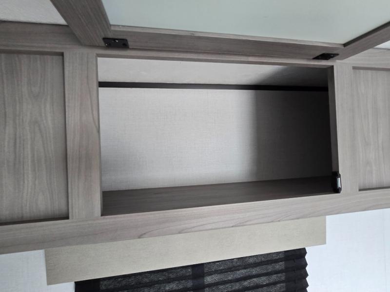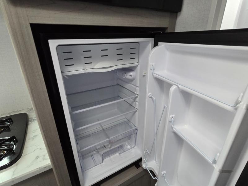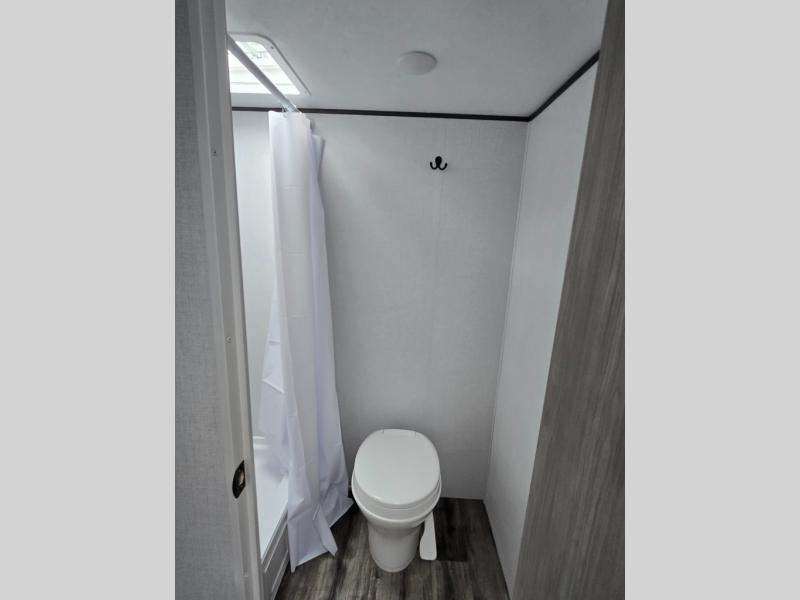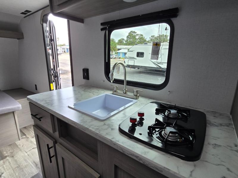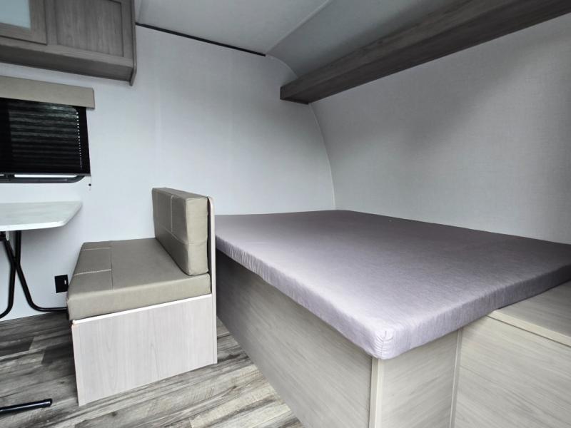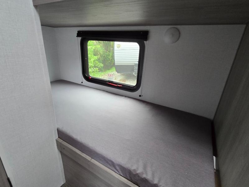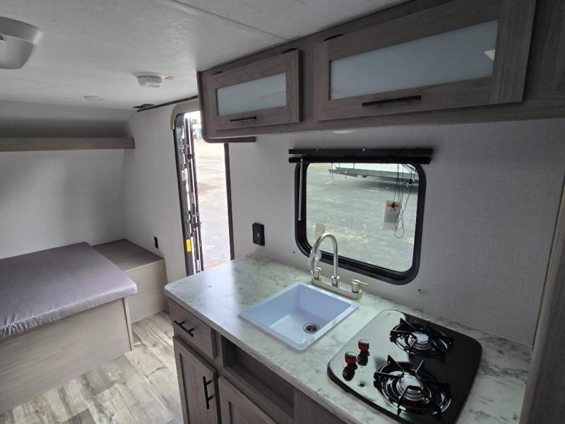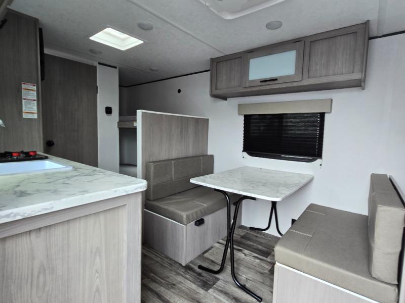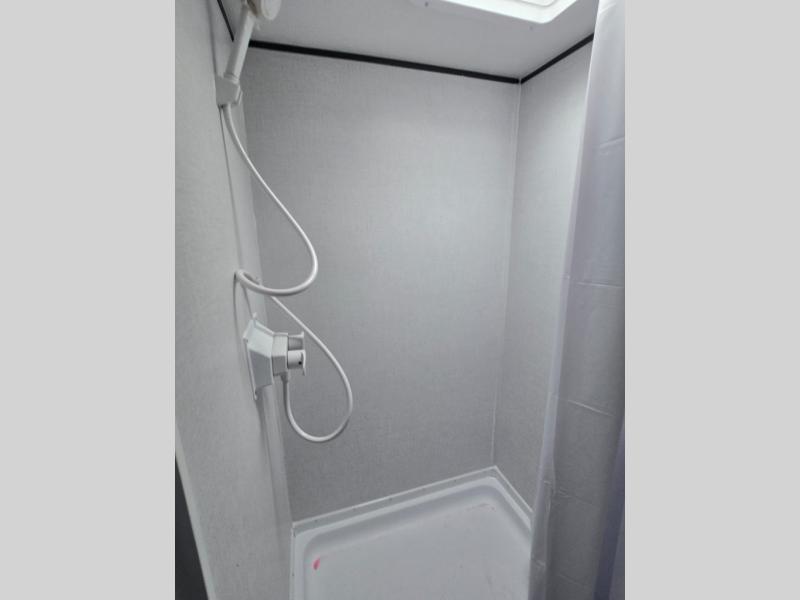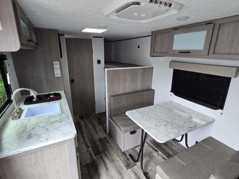 A perfect trailer for your family of three to five featuring a set of bunk beds for the kids, a queen bed up front for you, and the booth dinette that can be converted to sleep one or two more depending on size. For meals, there is a two burner cooktop and sink, plus a 3.3 cu. ft. refrigerator for your perishables. Overhead cabinetry can be found along both sides for your dishes and things. You will all appreciate the convenience of having your own private shower and toilet so that you don't need to use the campground facilities at night. If you enjoy spending time outside, an awning is available to provide even more living space outdoors!