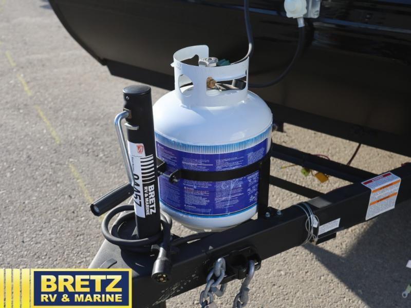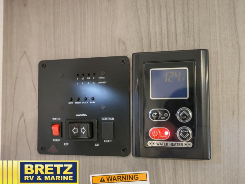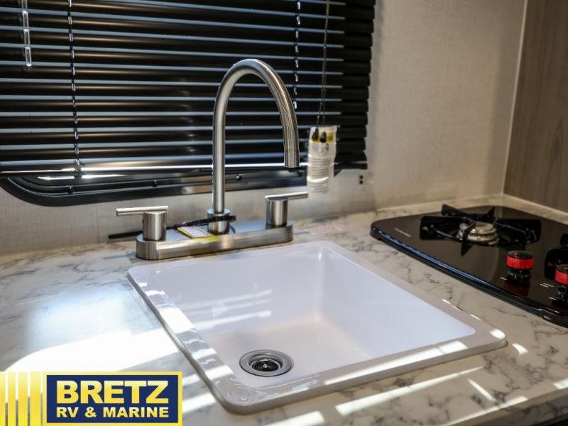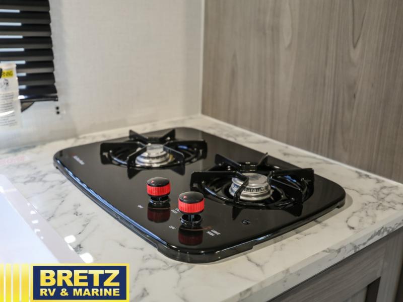 A perfect trailer for your family of three to five featuring a set of bunk beds for the kids, a queen bed up front for you, and the booth dinette that can be converted to sleep one or two more depending on size. For meals, there is a two burner cooktop and sink, plus a 3.3 cu. ft. refrigerator for your perishables. Overhead cabinetry can be found along both sides for your dishes and things. You will all appreciate the convenience of having your own private shower and toilet so that you don't need to use the campground facilities at night. If you enjoy spending time outside, an awning is available to provide even more living space outdoors!
