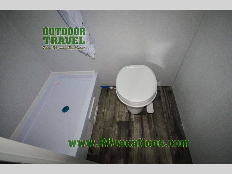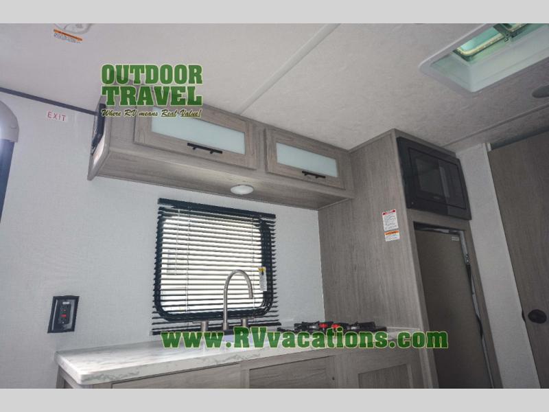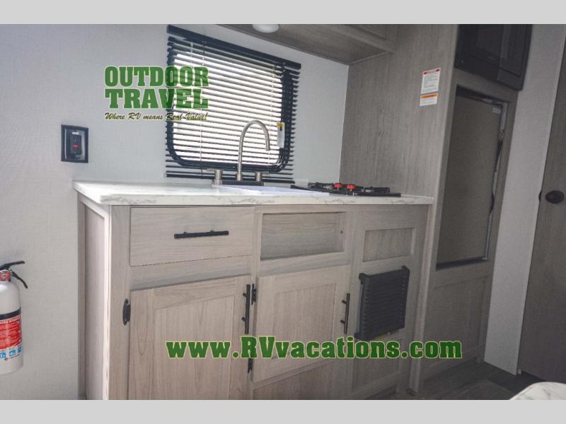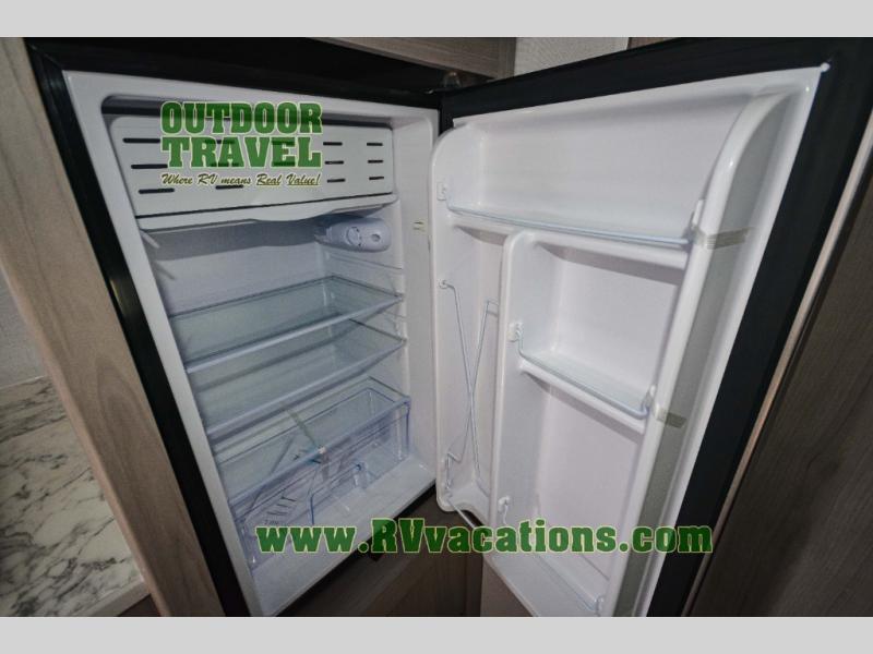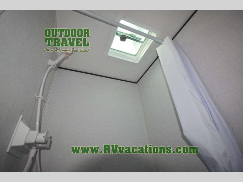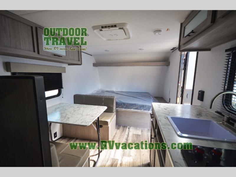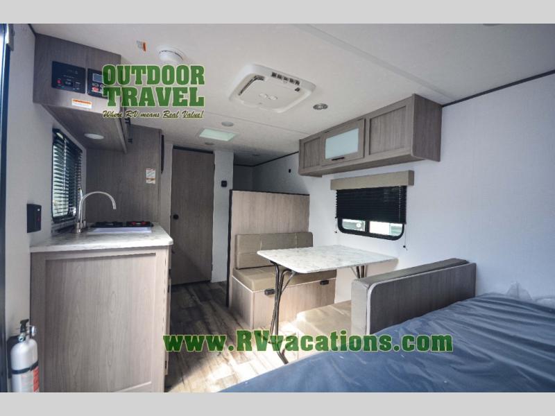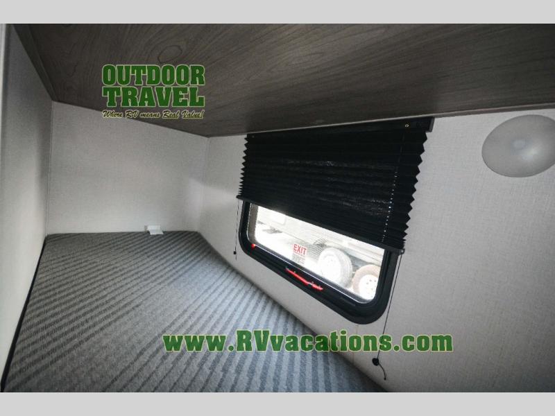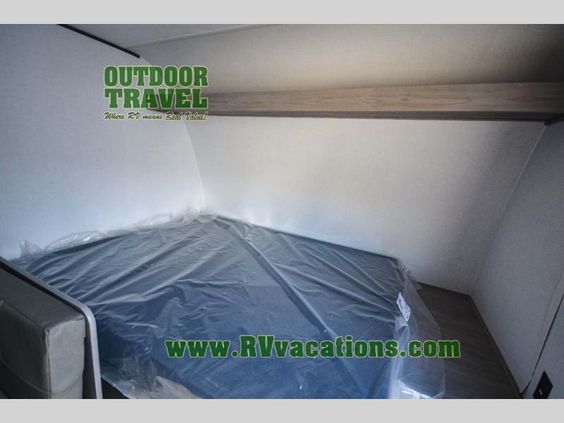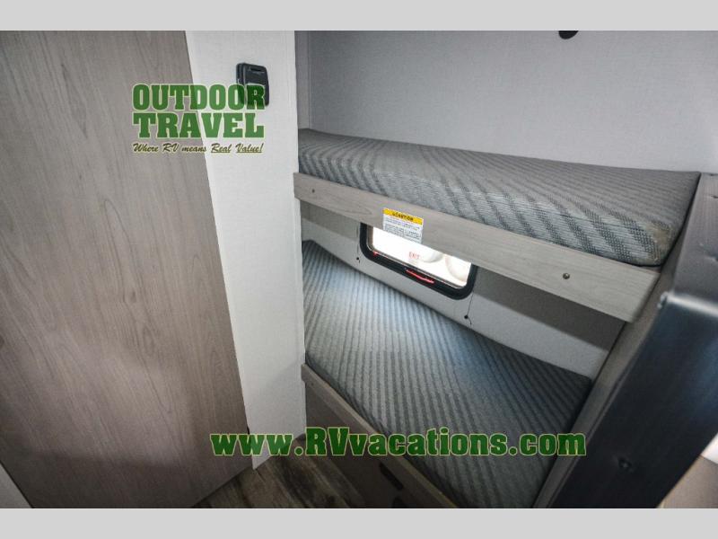 A perfect trailer for your family of three to five featuring a set of bunk beds for the kids, a queen bed up front for you, and the booth dinette that can be converted to sleep one or two more depending on size. For meals, there is a two burner cooktop and sink, plus a 3.3 cu. ft. refrigerator for your perishables. Overhead cabinetry can be found along both sides for your dishes and things. You will all appreciate the convenience of having your own private shower and toilet so that you don't need to use the campground facilities at night. If you enjoy spending time outside, an awning is available to provide even more living space outdoors!