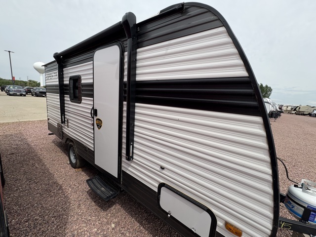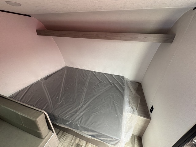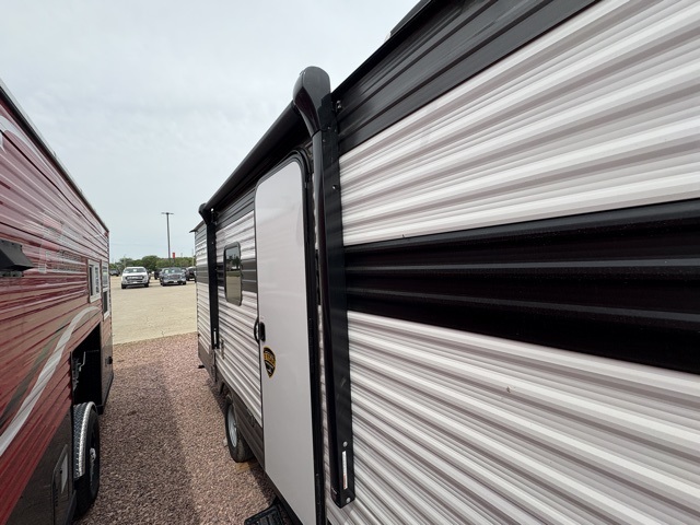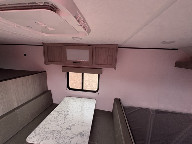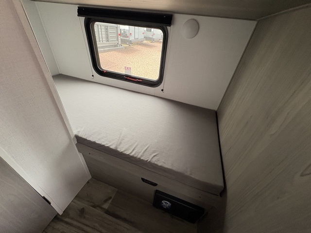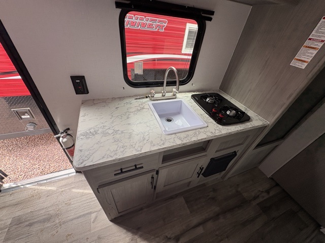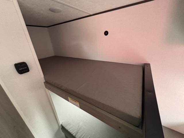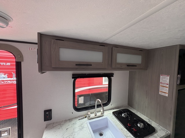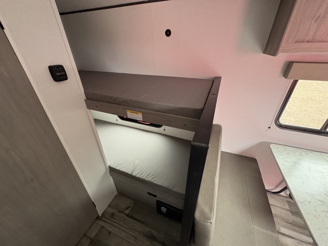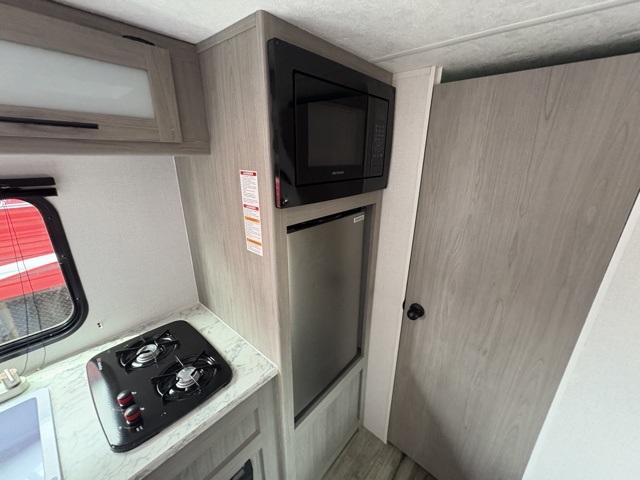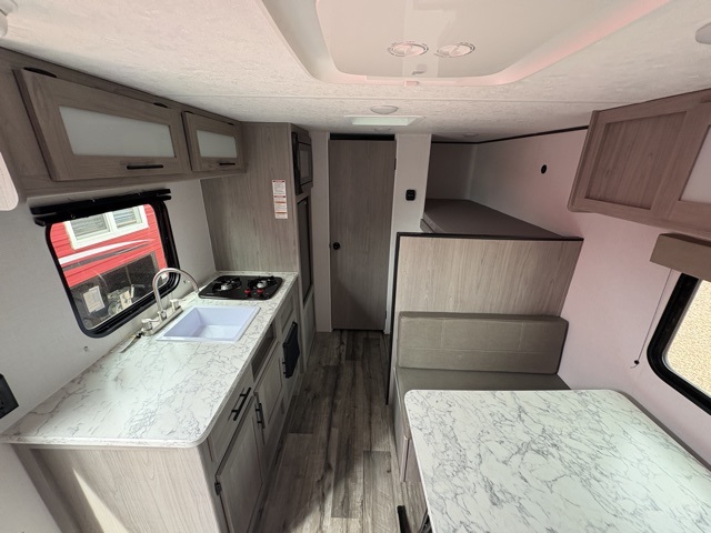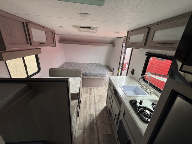 A perfect trailer for your family of three to five featuring a set of bunk beds for the kids, a queen bed up front for you, and the booth dinette that can be converted to sleep one or two more depending on size. For meals, there is a two burner cooktop and sink, plus a 3.3 cu. ft. refrigerator for your perishables. Overhead cabinetry can be found along both sides for your dishes and things. You will all appreciate the convenience of having your own private shower and toilet so that you don't need to use the campground facilities at night. If you enjoy spending time outside, an awning is available to provide even more living space outdoors!