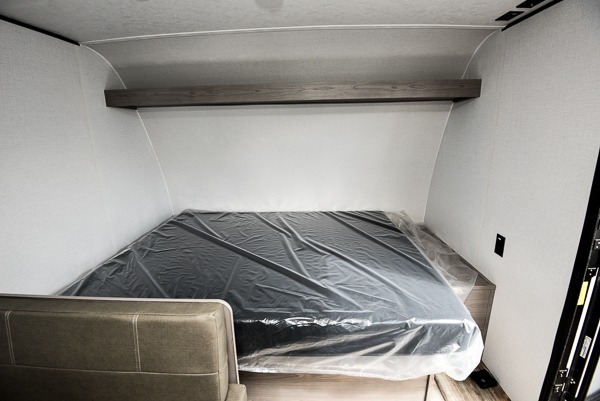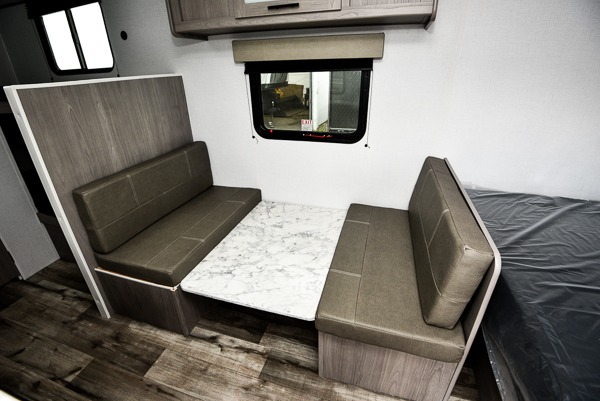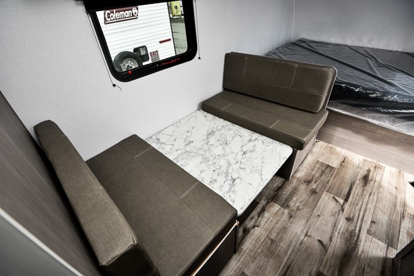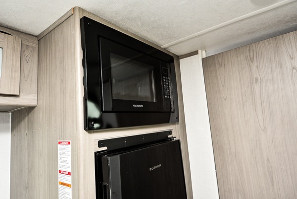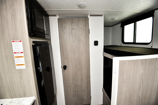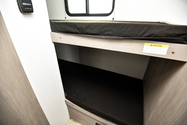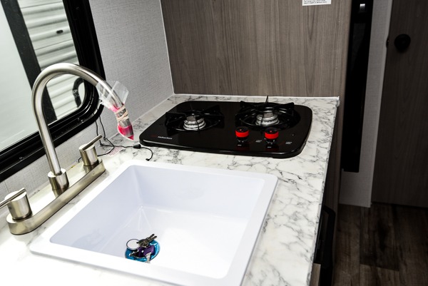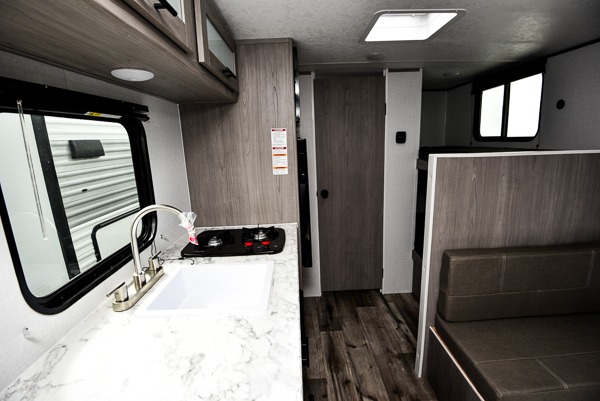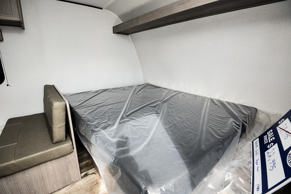 A perfect trailer for your family of three to five featuring a set of bunk beds for the kids, a queen bed up front for you, and the booth dinette that can be converted to sleep one or two more depending on size. For meals, there is a two burner cooktop and sink, plus a 3.3 cu. ft. refrigerator for your perishables. Overhead cabinetry can be found along both sides for your dishes and things. You will all appreciate the convenience of having your own private shower and toilet so that you don't need to use the campground facilities at night. If you enjoy spending time outside, an awning is available to provide even more living space outdoors!