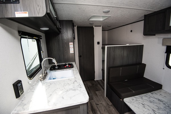 A perfect couples coach that could sleep one or two more, depending on size, using the booth dinette which can be converted at night This unit is cozy and convenient providing you just what you need to enjoy a little adventure away from home. For meals, there is a two burner cooktop and sink, plus a 3.3 cu. ft. refrigerator for your perishables. Overhead cabinetry can be found along both sides for your dishes and things. You will all appreciate the convenience of having your own private shower and toilet so that you don't need to use the campground facilities at night. You will also enjoy spending time outside with an 8' awning to provide even more living space outdoors!